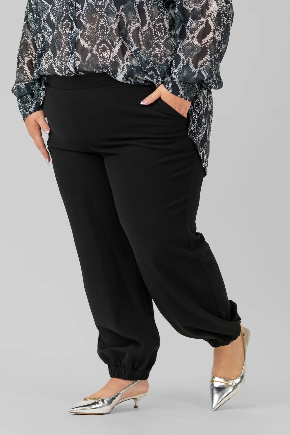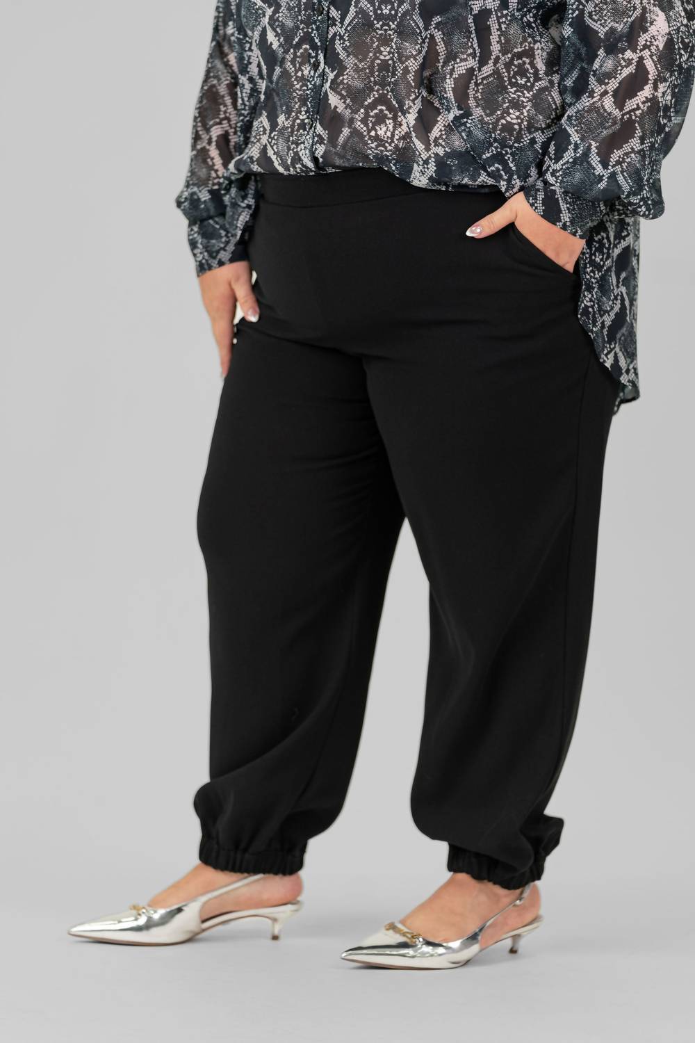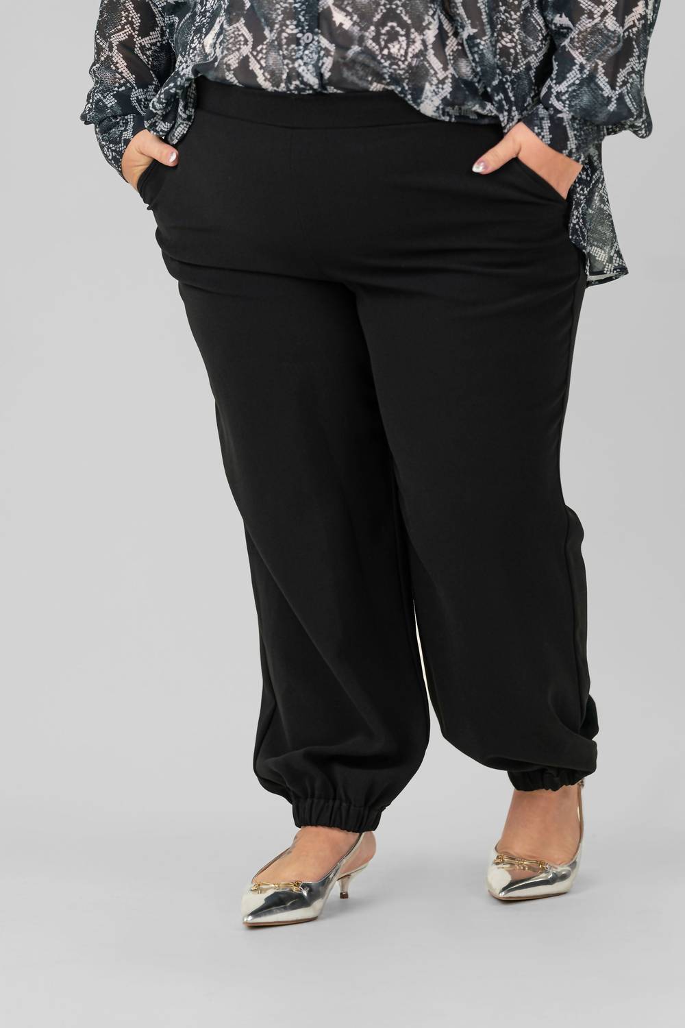 Дополните свой гардероб брюками Crepe Relaxed Ankle Pants от Karen Kane, выполненными в элегантном однотонном черном цвете. Эти брюки свободного кроя с прямыми штанинами изготовлены из 95% хлопка и 5% эластана и легко облегают фигуру благодаря застежке-липучке. Длина внутреннего шва 27,5 дюймов (68 см) позволяет им доходить до щиколотки. Они идеально подходят для летнего уличного стиля или концерта в честь Дня независимости. Эти брюки plus-size с удобными прорезными карманами по бокам одновременно стильные и практичные. За ними легко ухаживать: машинная стирка и сушка в стиральной машине.
