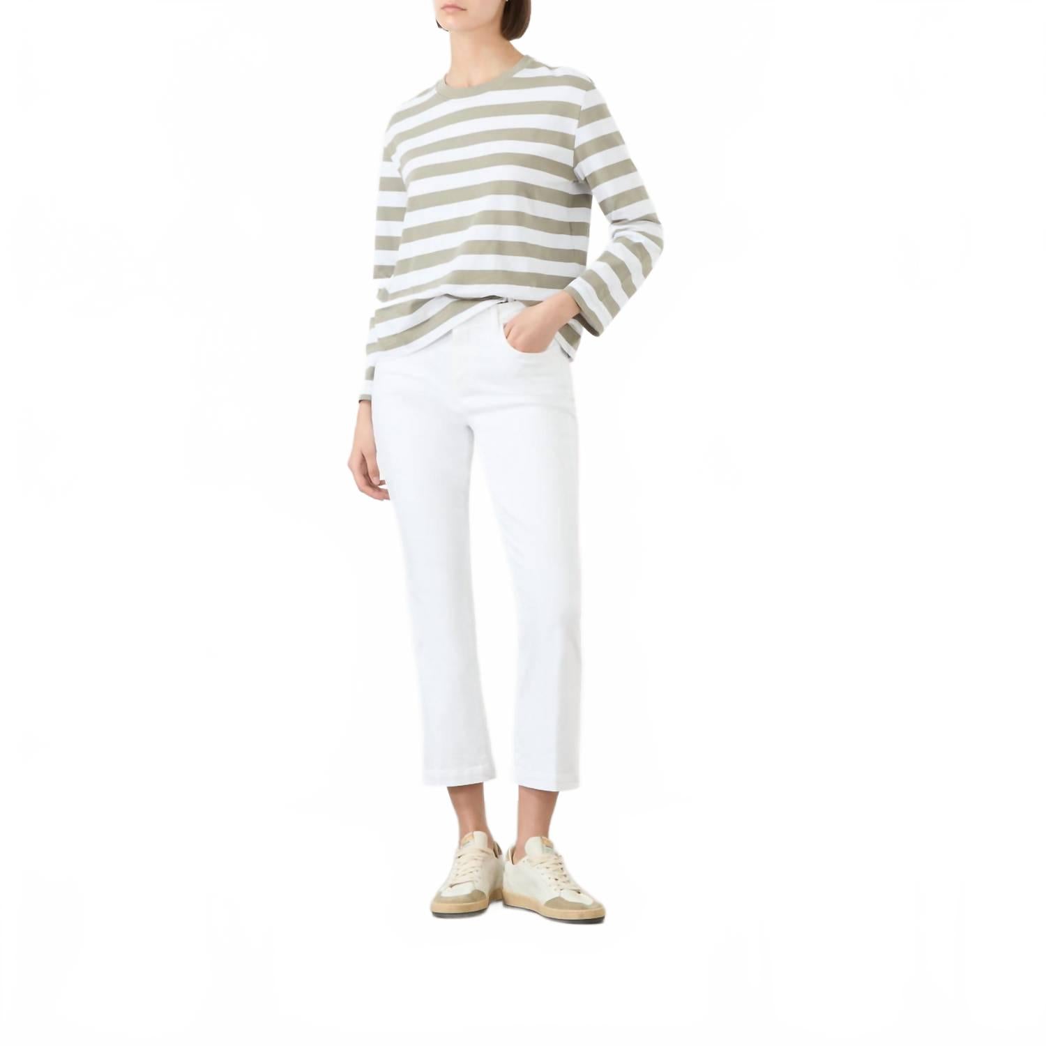 Откройте для себя расклешенные джинсы L'Agence Ali High Rise Flare в цвете Blanc - шикарное дополнение к любому гардеробу, воплощающее непринужденный стиль. Эти джинсы с высокой посадкой и свободным кроем облегают фигуру от пояса до колена, а затем плавно переходят в слегка расклешенные укороченные брюки с длиной внутреннего шва 27 дюймов. Джинсы изготовлены из 94% хлопка, 5% эластана и 1% спандекса. Они производятся в Лос-Анджелесе и имеют классический дизайн с пятью карманами и застежку на молнию и пуговицу. Уход прост: машинная стирка и сушка в стиральной машине - идеальное дополнение к вашему весеннему гардеробу. Модель ростом 175 см, обхват груди 88 см, размер 25.