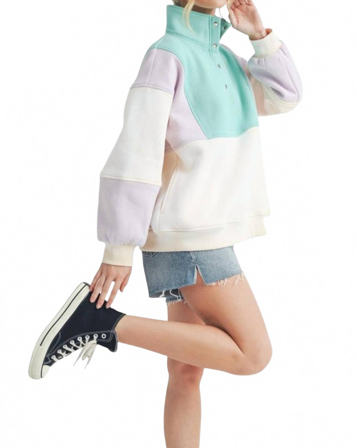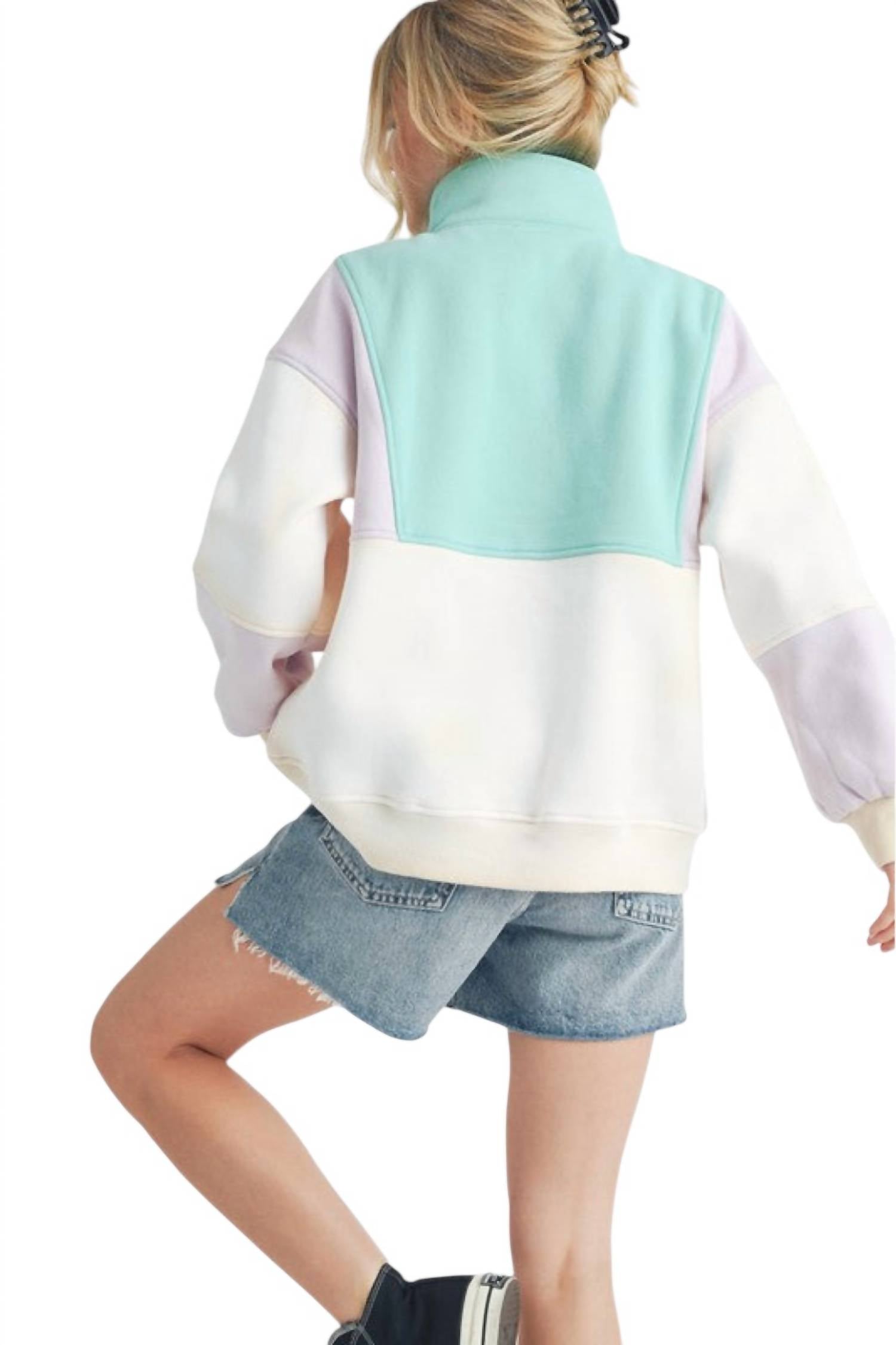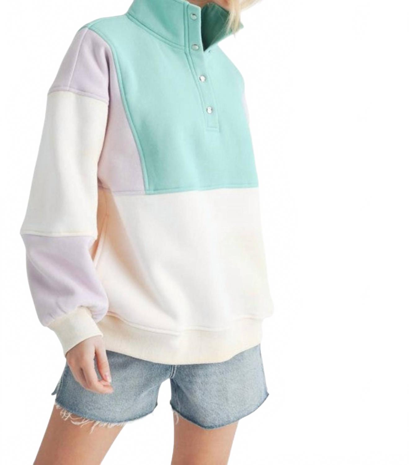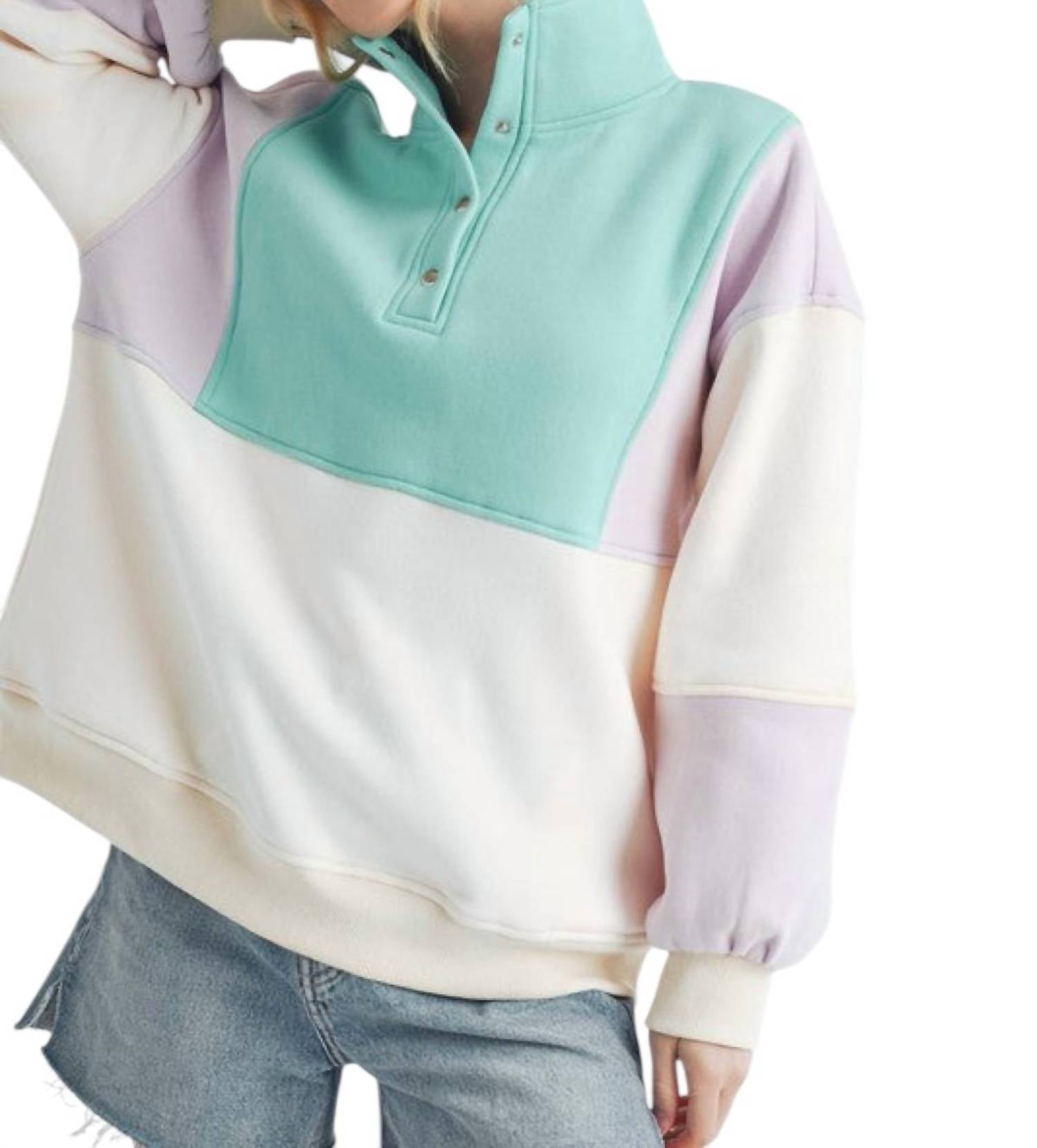 Представляем пуловер Glo Colorblock от AEMI + CO - стильное сочетание комфорта и современного дизайна, идеально подходящее для вашего осеннего гардероба. Эта шикарная модель с длинными рукавами мятного цвета с ярким аквамариновым и лавандовым узором дополнена функциональной застежкой на кнопку и удобными карманами. Пуловер, изготовленный из смеси 50% хлопка и 50% полиэстера, обеспечивает прочность и комфорт в течение всего дня. Уход за этой универсальной вещью прост: рекомендуем стирать в стиральной машине и сушить в стиральной машине. Страна-производитель: импорт. Доступны размеры SL (на фото - размер S). Дженна носит размер S.