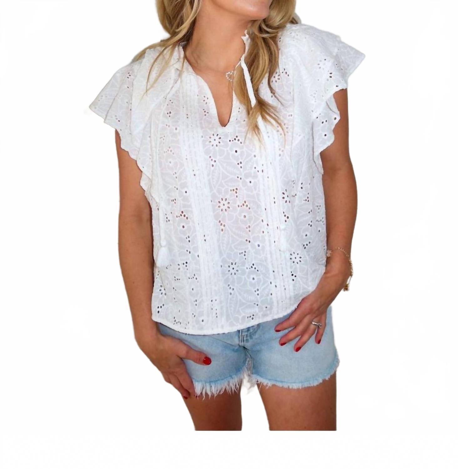 Представляем вышитый топ с V-образным вырезом Morning Light от Keepsake - идеальное сочетание стиля и комфорта в свежем белом цвете. Эта женская блузка с короткими рукавами, украшенными развевающимися оборками, и V-образным вырезом, украшенным изящной вышивкой, привносит романтический и утонченный бохо-стиль. Изготовленная из 75% хлопка и 25% полиэстера, она обеспечивает свободный крой, идеально подходящий для создания изящных и непринужденных образов. Удобный крой с застежкой-липучкой, этот топ требует ручной стирки в холодной воде и сушки на веревке, что делает его незаменимой вещью в вашем минималистичном весеннем гардеробе. На модели рост 175 см, размер S.