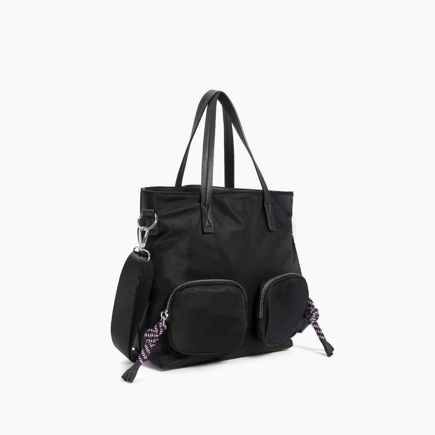 Откройте для себя женскую сумку-тоут Full Force Utility от Like Dreams - стильную и функциональную сумку-тоут классического черного цвета. Изготовленная из прочного нейлона с отделкой из веганской кожи, эта сумка отличается вместительным внутренним карманом для ноутбука и двумя передними карманами на молнии с перекрученными кисточками для дополнительной элегантности. Размеры сумки: ширина 33 см, высота 28 см, глубина 10 см, вес 59 г. Благодаря верхней ручке высотой 16 см и регулируемому/съемному ремню, ее можно носить как угодно.