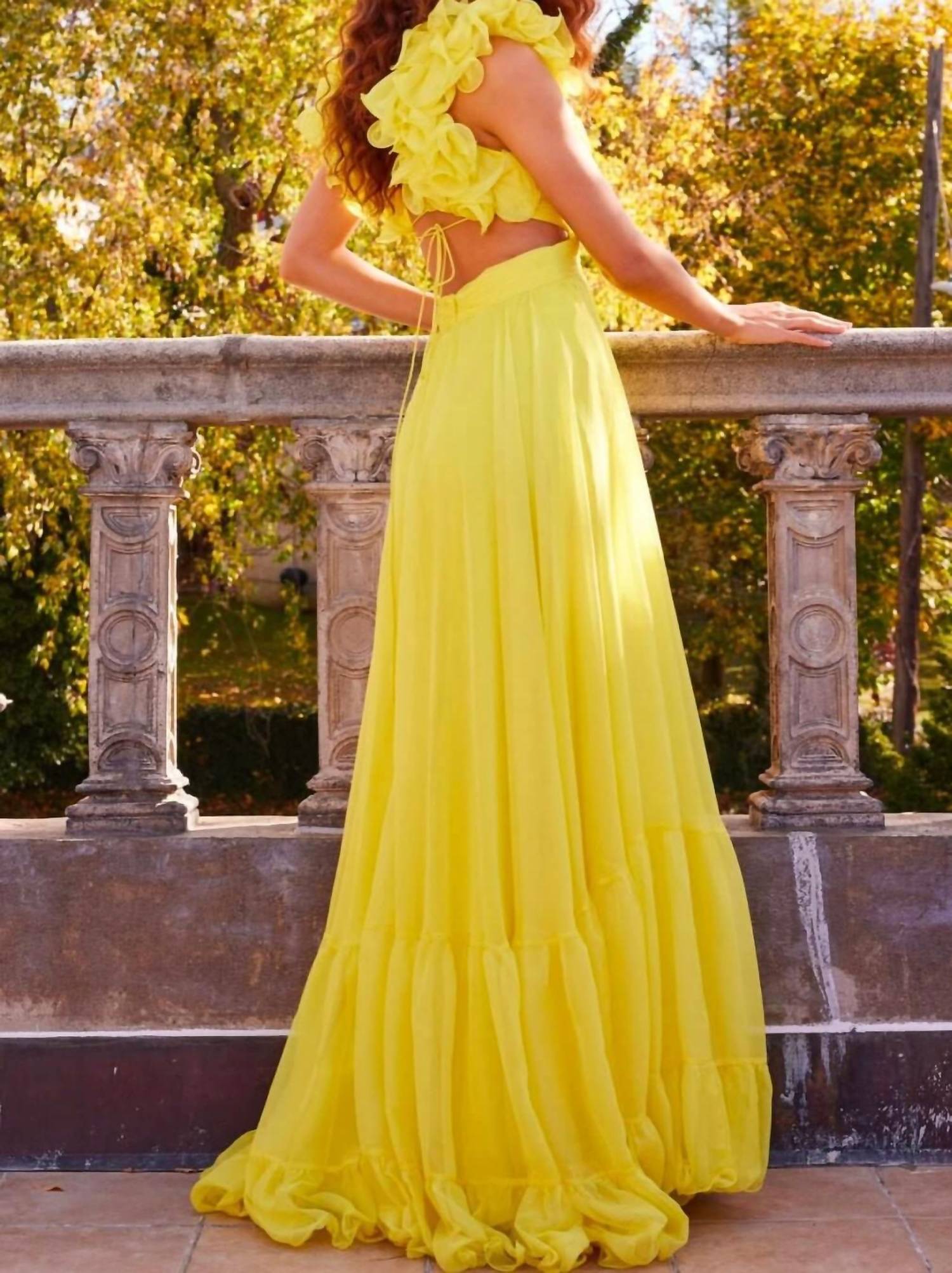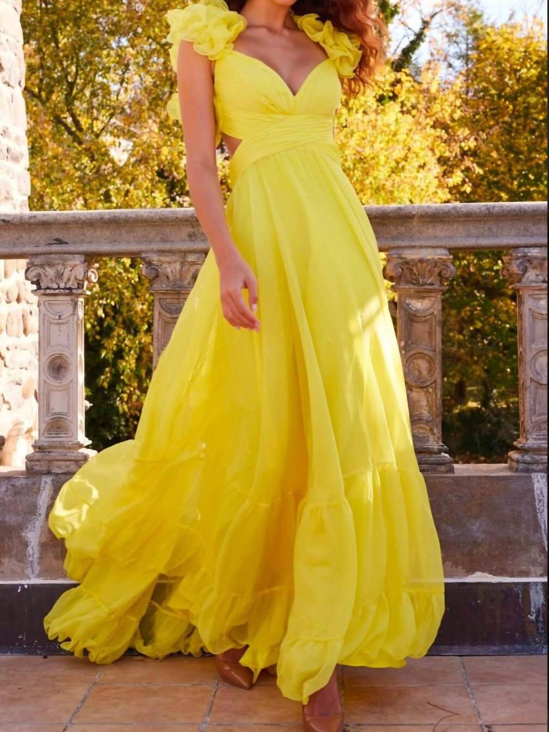 Просто добавьте милый маленький клатч и подходящий каблук, и ваш образ для мероприятия будет идеальным. Представляем Mae Gown от Jovani - очаровательное платье без рукавов с элегантной завышенной талией из роскошной прозрачной ткани с пайетками. Это платье длиной в пол ослепительно красиво смотрится благодаря открытой спине и перекрещивающимся завязкам, которые подчеркивают V-образный вырез, придавая ему дополнительную изысканность. Платье украшено изысканными деталями, такими как игривые оборки и отделка, и представлено в ярких цветах: желтом, ярко-розовом и светло-голубом. Идеально подходит для гламурного вечера. Для сохранения элегантности этому платью требуется только локальная химчистка. Доступно в размерах 2, 4 и 6.