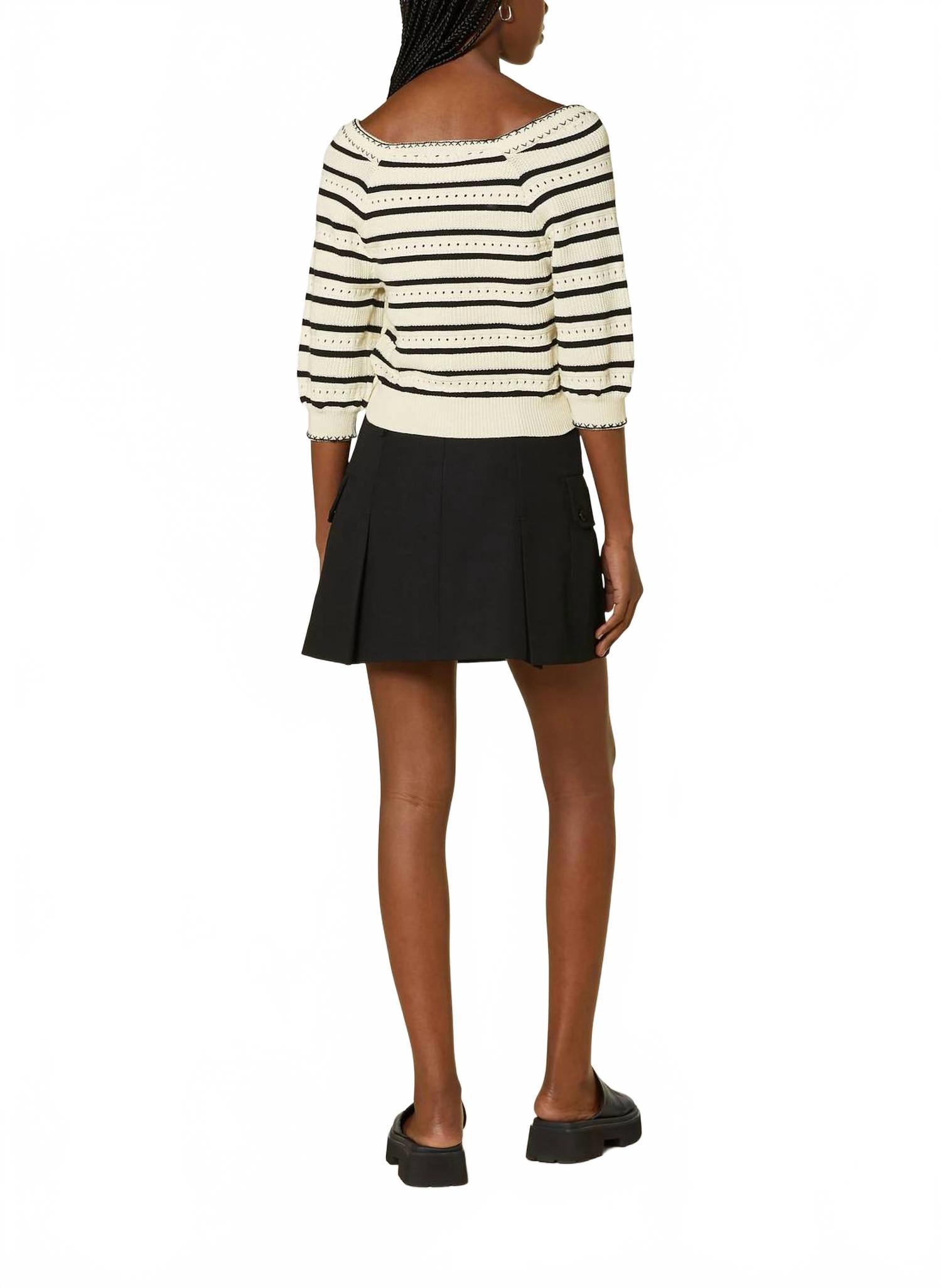 Оставайтесь в тепле и стильно в этом универсальном и стильном трикотажном изделии. Носите его отдельно или в составе многослойной одежды - это идеальный свитер для этого сезона, и вы пожалеете, что не носили его ни в одном цвете. Откройте для себя свитер Patrici от Suncoo - потрясающую летнюю вещь, сочетающую в себе минималистичный дизайн и элегантный шарм. Этот кремово-черный ажурный полосатый джемпер с рукавами-буфами три четверти и квадратным вырезом горловины создает стильный фактурный образ. Изготовленный из 100% хлопка, он дополнен ребристыми манжетами и низом, что придает ему изысканный вид. Этот универсальный женский топ с застежкой-липучкой идеально подходит для помолвки и его удобно стирать в стиральной машине.