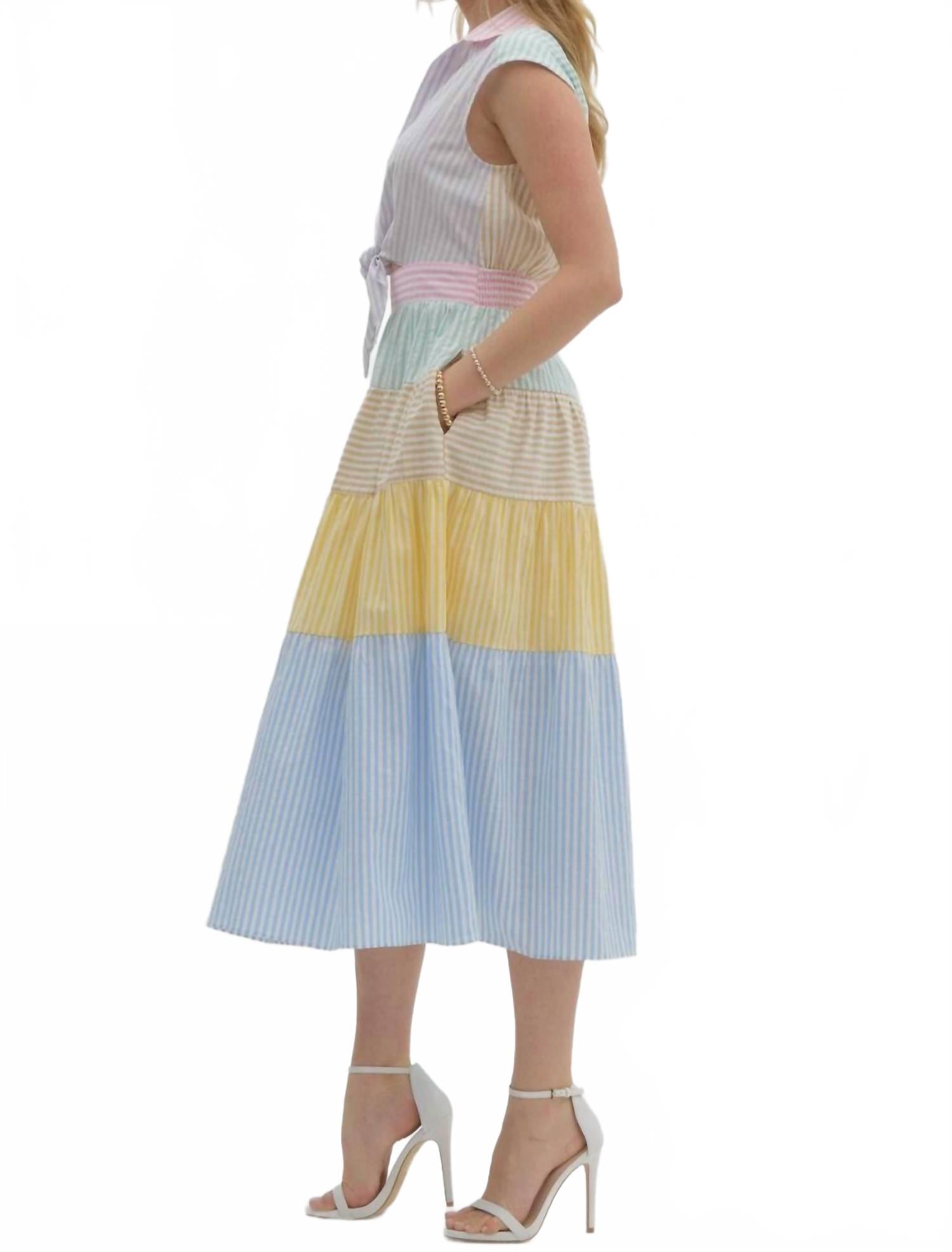 Представляем полосатое платье миди от Entro - незаменимый летний предмет гардероба, идеально подходящий как для отдыха, так и для работы. Это платье миди без рукавов А-силуэта с классическим воротником сшито из комфортной ткани (75% хлопка, 25% полиэстера) с ярким синим узором в разноцветные полоски. Удобные карманы и удобная застежка-липучка делают платье стильным и функциональным. Рекомендации по уходу включают машинную стирку и сушку на веревке для поддержания идеального состояния. Обхват груди: S - 36 дюймов, M - 38 дюймов, L - 40 дюймов, длина для всех размеров - 50 дюймов. Дена носит размер L с размером груди 40D и ростом 175 см.