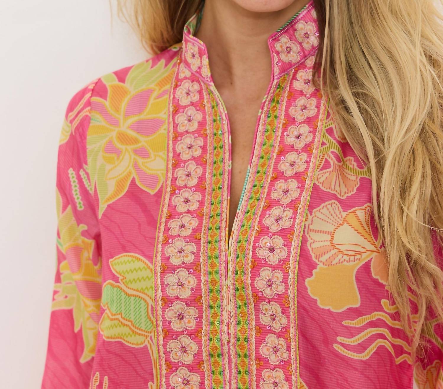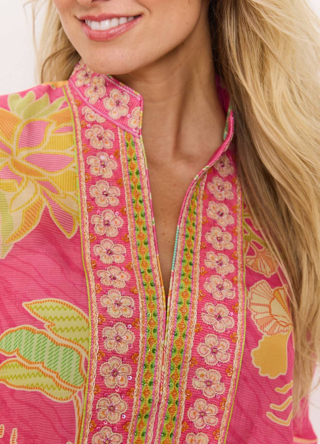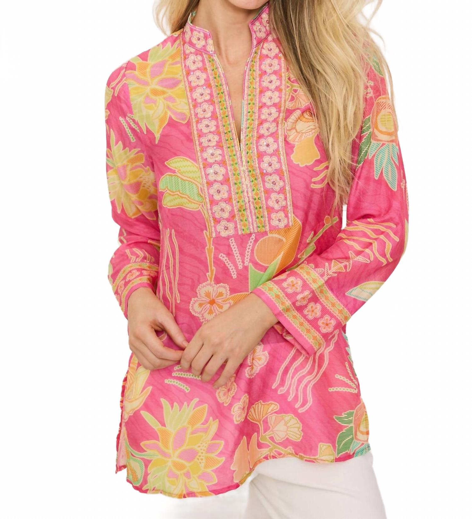 Эта классическая блузка-туника станет идеальным дополнением к любому гардеробу, она подчеркнет вашу фигуру и будет выглядеть непринужденно. В этом шикарном топе вы легко перенесетесь с работы на ужин. Представляем тунику Darcy Side Slit от Bella Tu с ярким принтом «Багама» - идеальный вариант для вашего следующего отпуска. Длинные рукава и воротник-стойка придают элегантность красочному цветочному узору. Туника изготовлена ​​из роскошной вискозы и украшена фирменной ручной вышивкой бисером по вырезу горловины. Застежка-липучка обеспечивает удобство и стиль. Длина туники составляет 27 дюймов, она имеет удобные боковые разрезы. Для ухода за ней рекомендуется ручная стирка в холодной воде и сушка в сухом виде.