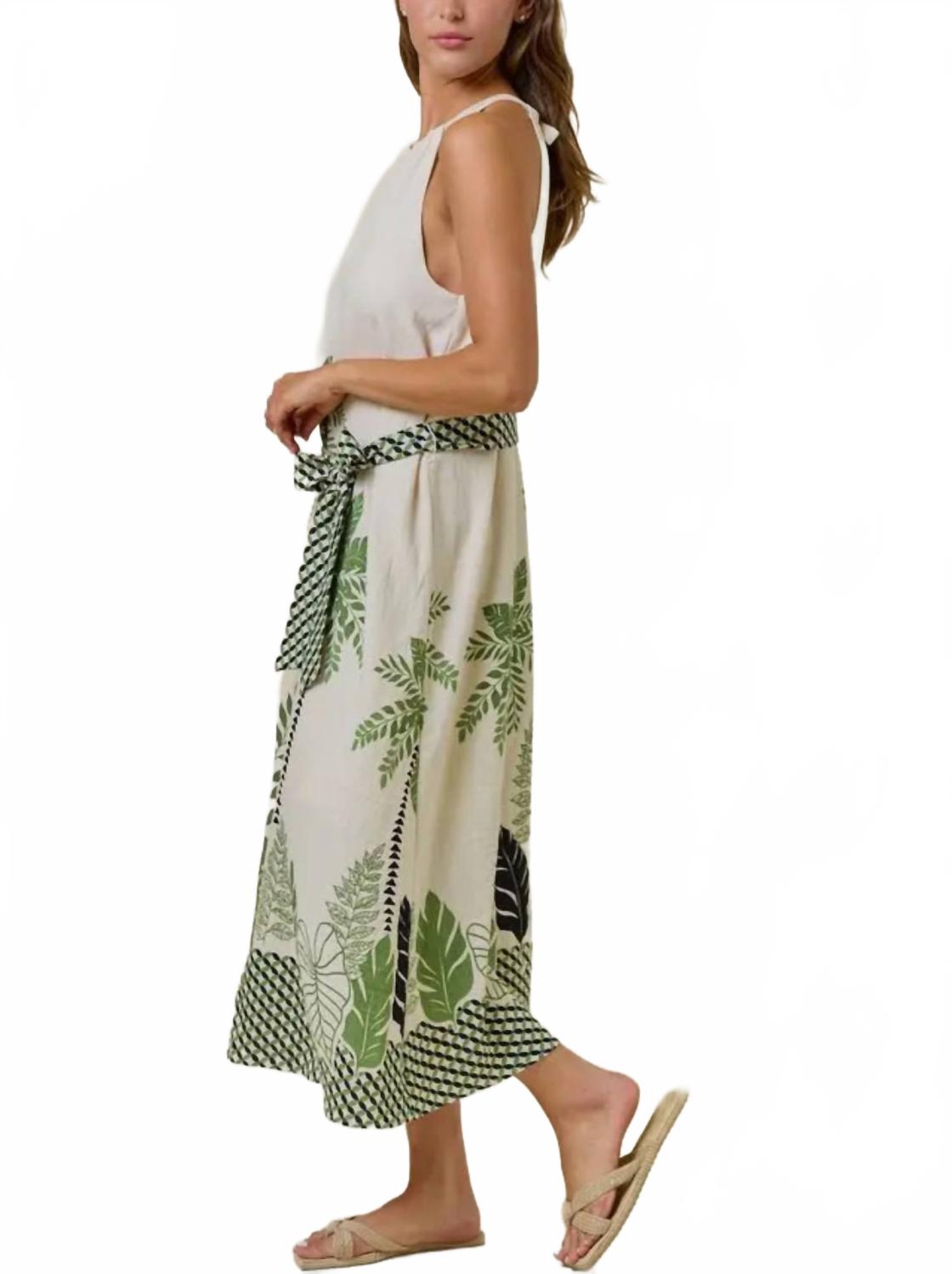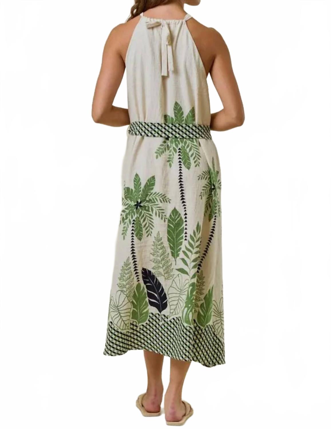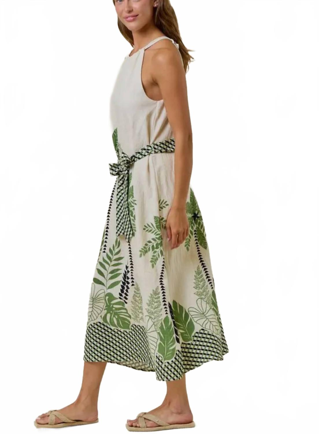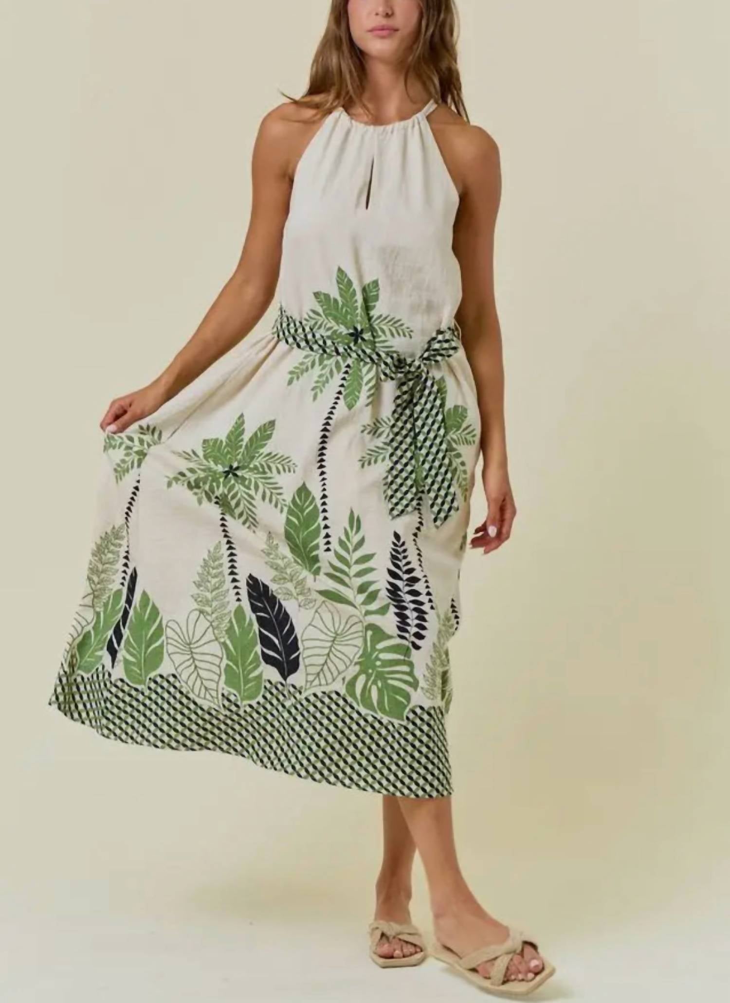 Кто не любит хорошее макси-платье? Это то, за которым вы будете тянуться сезон за сезоном. Откройте для себя женское макси-платье от Doe and Rae, разработанное для непринужденного комфорта в струящемся силуэте без рукавов. Это платье А-силуэта с тропическими пальмами и ботаническим принтом в зеленом и темно-синем на фоне цвета слоновой кости, дополнено американской проймой и деталью-замочной скважиной спереди для нотки элегантности. Состав - вискоза, лен. Длина изделия - 50 1/2 дюйма общая длина для размера small. Идеально подходит для пляжного дня или любого летнего случая, пояс-кушак обеспечивает выгодную и регулируемую посадку. На модели носит размер small (рост 5'9", бюст 32", талия 25 дюймов).