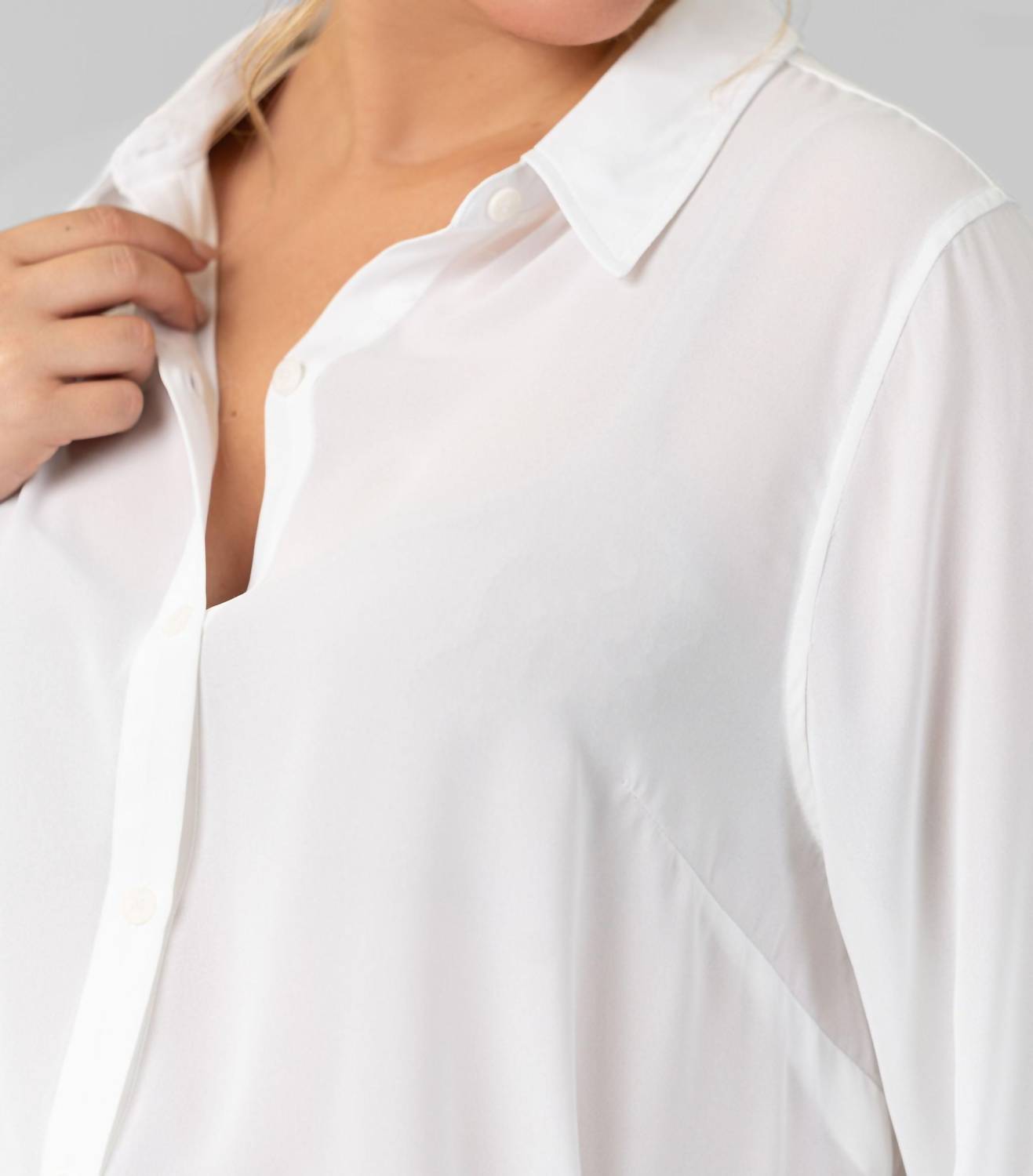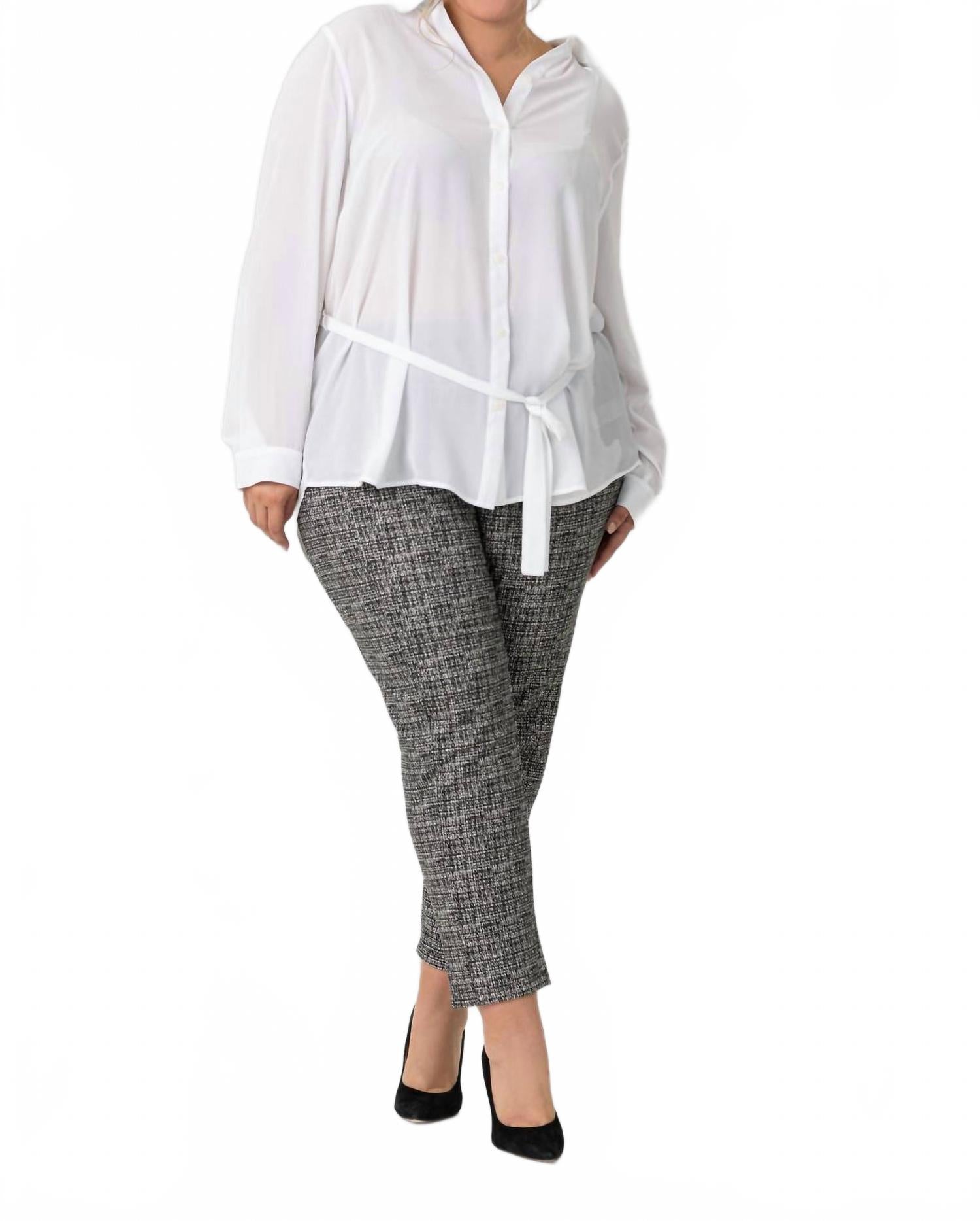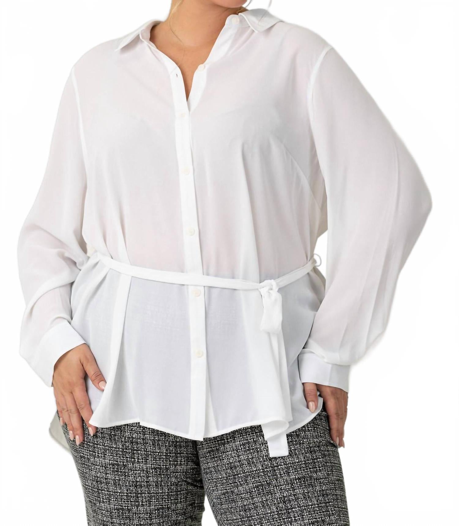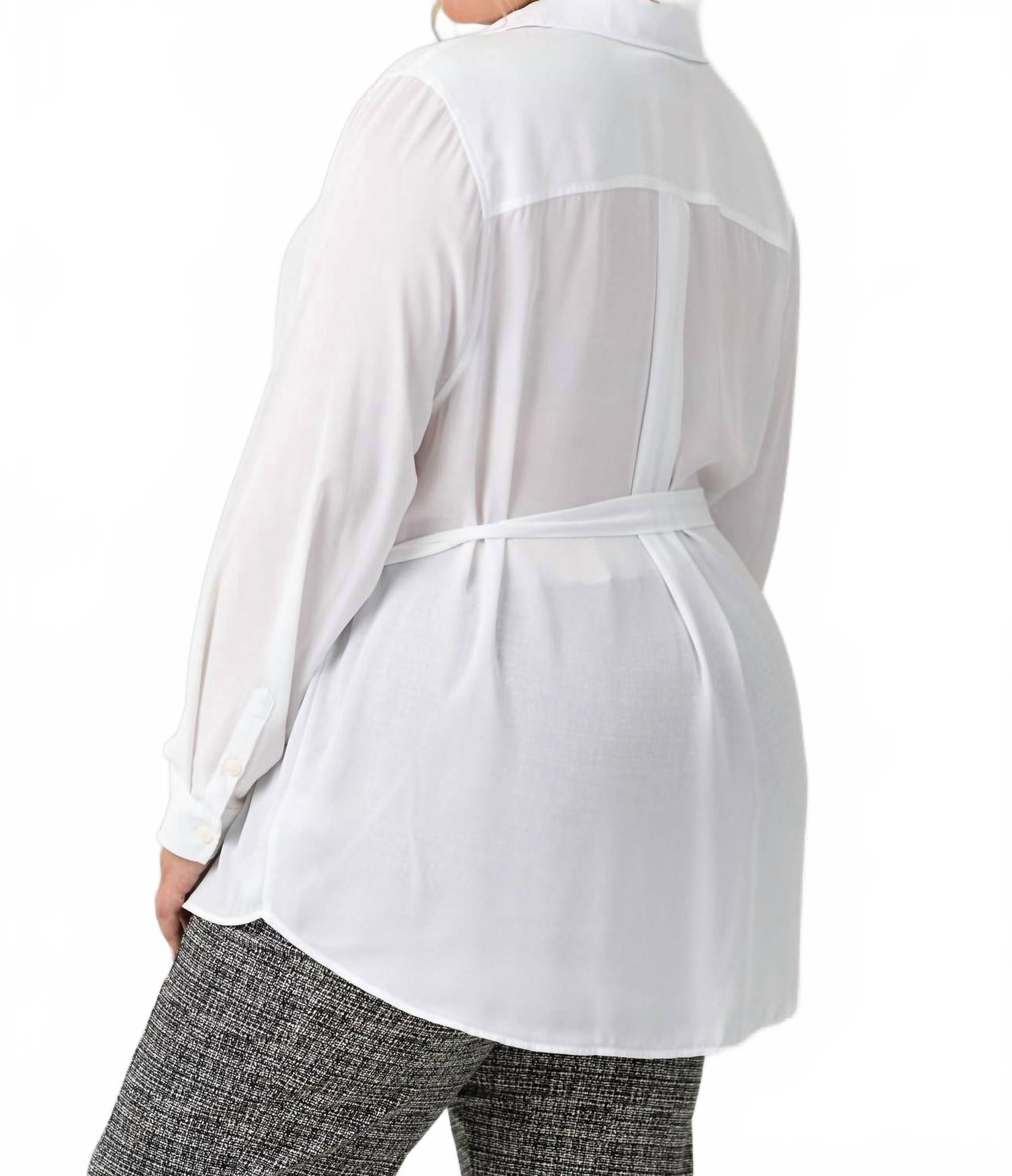 Блуза-туника с поясом и воротником от NYDJ - изысканный выбор для стильных женщин. Она отличается длинными рукавами, манжетами на пуговицах и изысканным воротником. Изготовленная из 100% полиэстера, полученного из 100% переработанных пластиковых бутылок, эта модель подчеркивает экологичность. Застежка на пуговицы и пояс на шнуровке придают ей женственный вид, идеально сочетая элегантность и практичность. Эта белая блузка проста в уходе: достаточно стирать в стиральной машине и сушить в стиральной машине. Она идеально подходит для вечерних мероприятий или праздничных встреч, например, на Пасху.