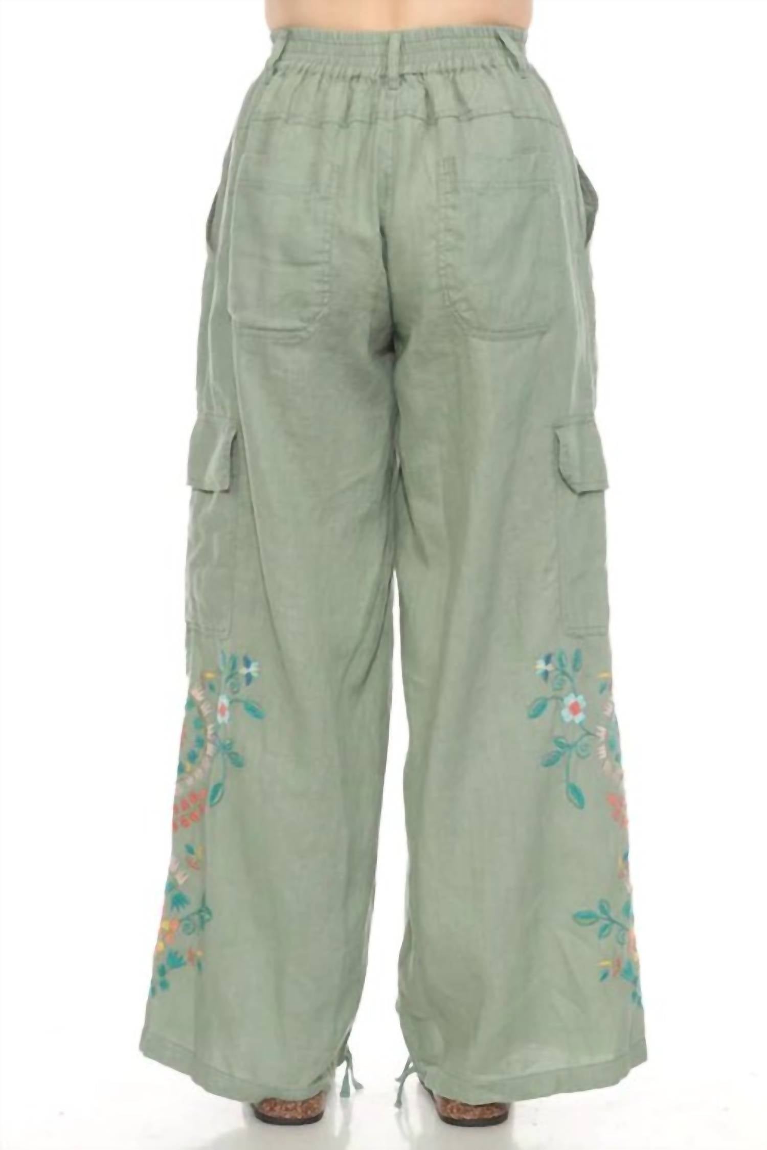 Украсьте свой повседневный гардероб брюками-карго Drawstring Hem - стильной интерпретацией классики. Эти брюки-карго из дышащего льна обеспечивают свободную посадку и широкий силуэт, идеально подходящий для теплой погоды. Они разработаны для комфорта и функциональности, застегиваются на пуговицу и молнию, а эластичный пояс обеспечивает удобную и гибкую посадку. Шесть карманов для повседневных вещей и изысканная цветочная вышивка по бокам придают этим брюкам изысканный вид. Благодаря затягивающемуся низу вы можете создать индивидуальный образ - зауженный фасон или свободный свободный фасон. От поездок на выходные до непринужденных прогулок - эти брюки-карго - ваш универсальный и стильный выбор.