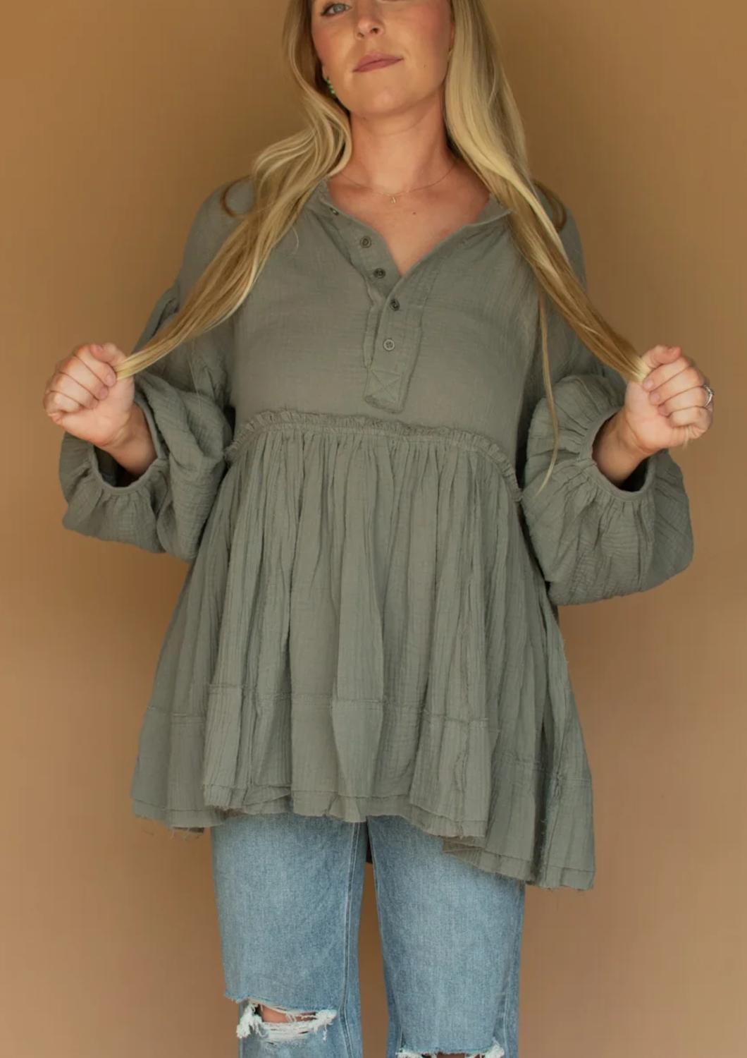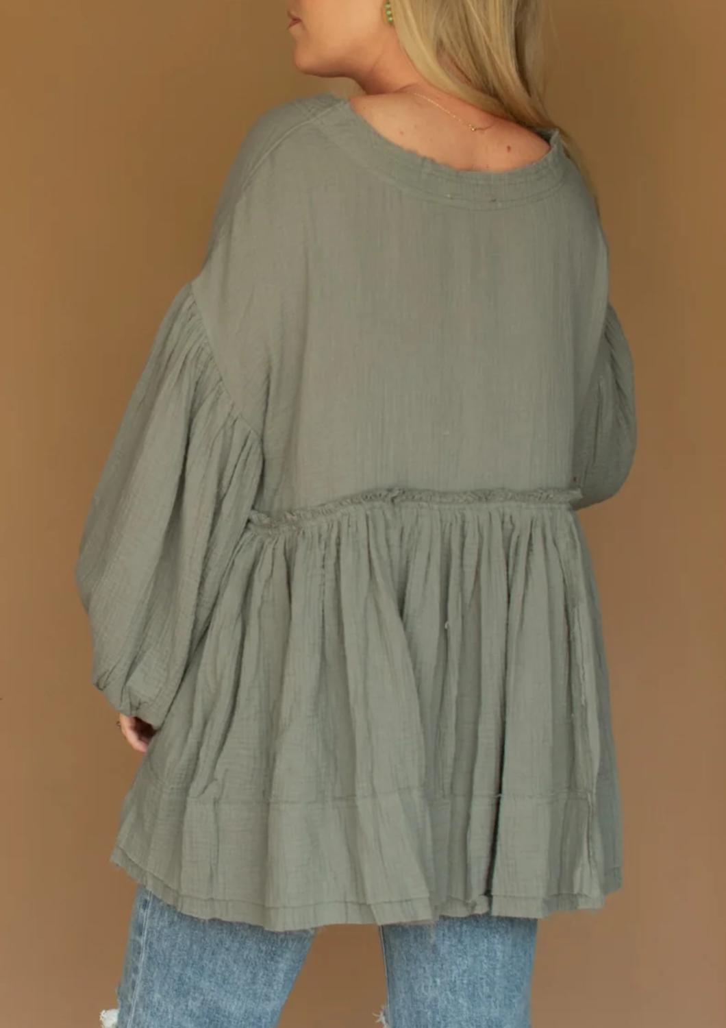 Откройте для себя универсальное очарование этой туники-блузки, которая идеально подходит как для многослойного образа, так и для самостоятельного ношения. Ее изящный силуэт и стильные детали делают ее незаменимой вещью в гардеробе. Представляем тунику Dessa от By Together - легкую и элегантную модель в сланцево-сером цвете, которая украсит ваш гардероб. Эта туника с длинными, пышными рукавами и свободным свободным кроем из текстурированной, дышащей ткани идеально подходит для любого сезона. Застежка: пуговицы. Благодаря пуговицам в стиле хенли на V-образном вырезе эта туника гармонично сочетает в себе комфорт и минималистичный стиль, что делает ее идеальным вариантом для отпуска.