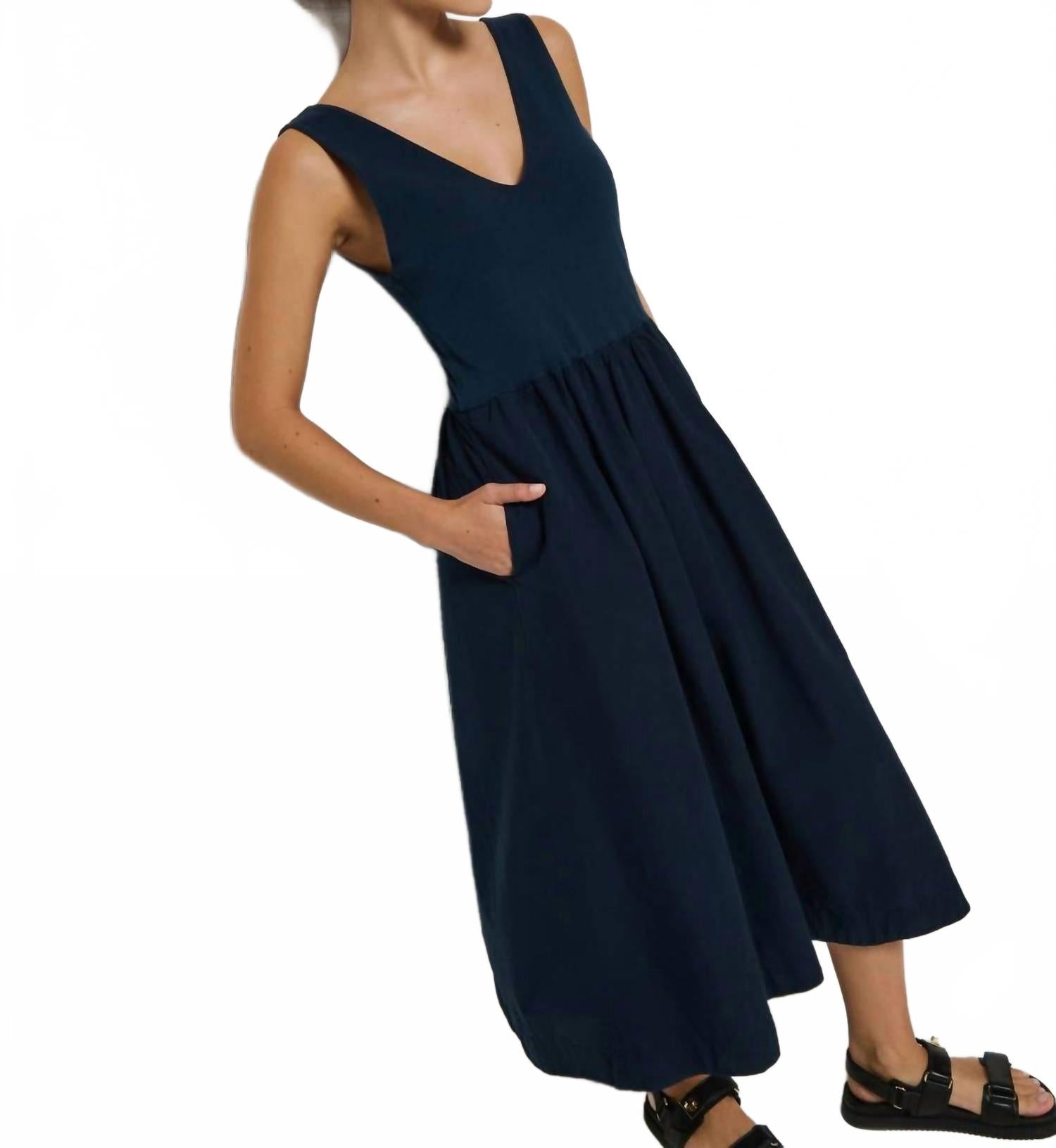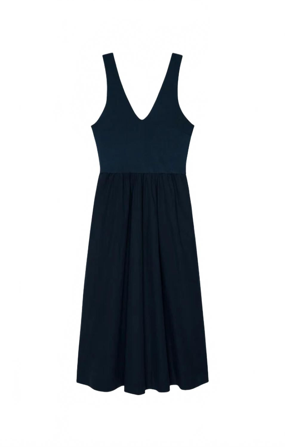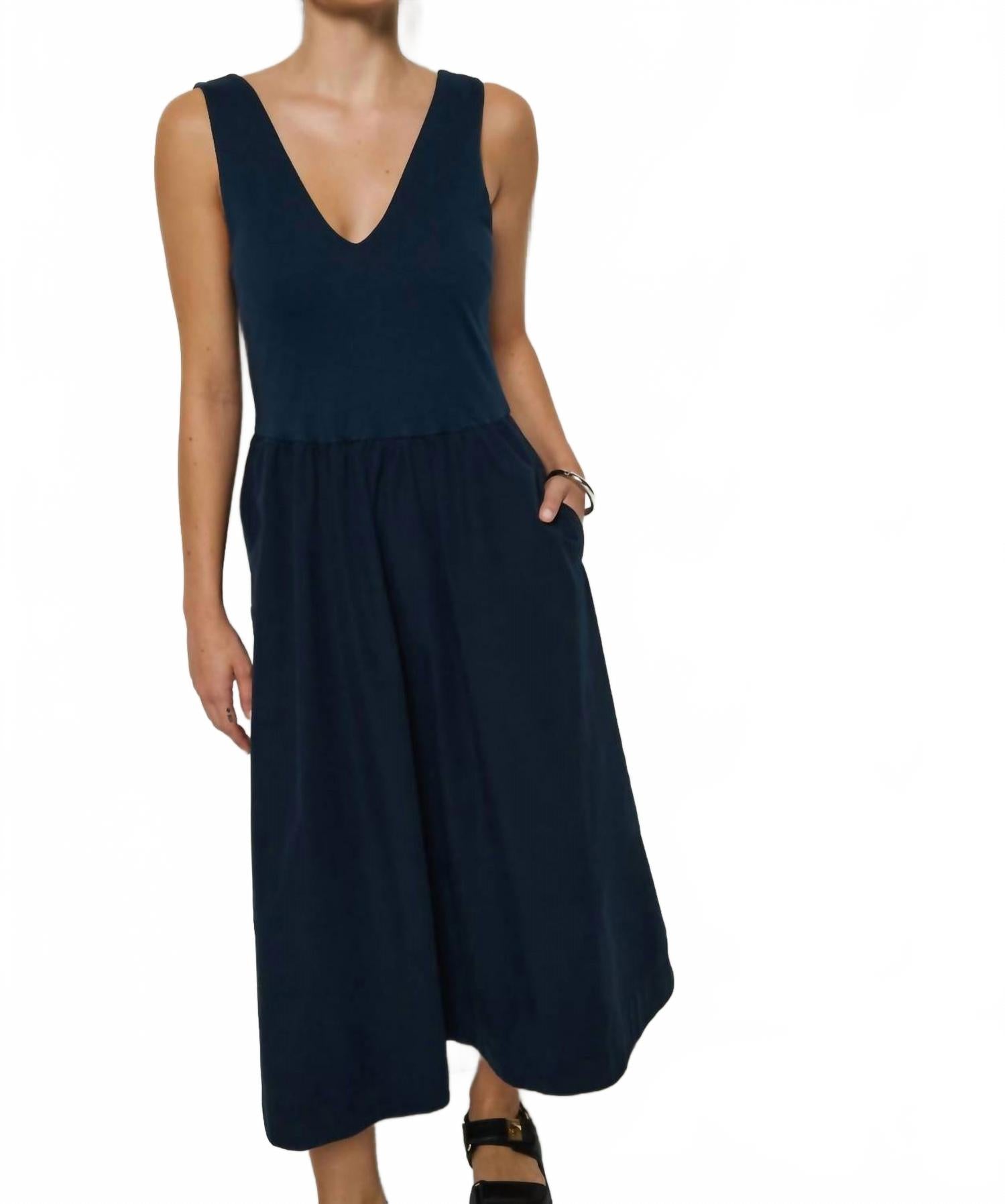 Платье идеальной длины существует. Представляем платье-миди Daria Tank от Nation LTD, созданное для элегантного стиля и максимального комфорта. Это платье без рукавов насыщенного оттенка «ночное небо» отличается привлекательным V-образным вырезом и облегающим силуэтом с завышенной талией, контрастной юбкой и практичными карманами в боковых швах. Изготовленное из 100% перуанского хлопка, оно мягкое, гладкое с лицевой стороны и петельчатым ворсом на изнанке обеспечивает уют и тепло, идеально подходит для вашего весеннего гардероба. Оцените удобство надевания и сохраняйте качество благодаря ручной стирке и сушке на горизонтальной поверхности - идеально для любого званого ужина.