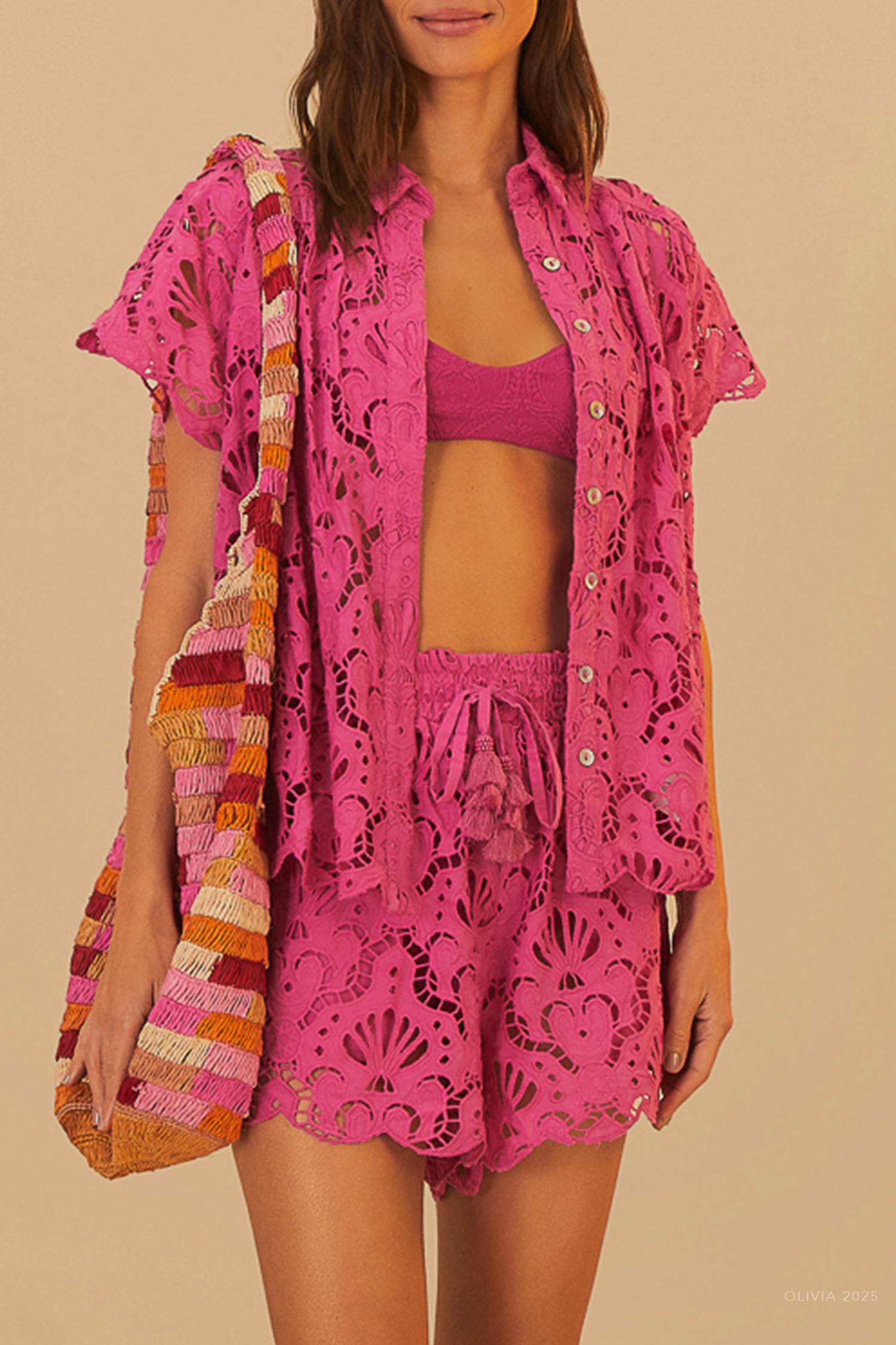 Классическая рубашка с застежкой на пуговицы, которая никогда не выйдет из моды. Представляем рубашку Pink Seashell Eyelet Shirt от FARM Rio - стильную и женственную вещь, идеально подходящую для вашего весенне-летнего гардероба. Эта рубашка с короткими рукавами изготовлена ​​из 100% хлопка и украшена эффектным узором из люверсов и ракушек, что создает текстурированный и немного причудливый образ. Рубашка, изготовленная в Китае, доходит до бедер и имеет застежку на пуговицы спереди и воротник-стойку, что обеспечивает непринужденный, но в то же время элегантный крой. Для сохранения качества изделия рекомендуется стирать его вручную и сушить на горизонтальной поверхности.
