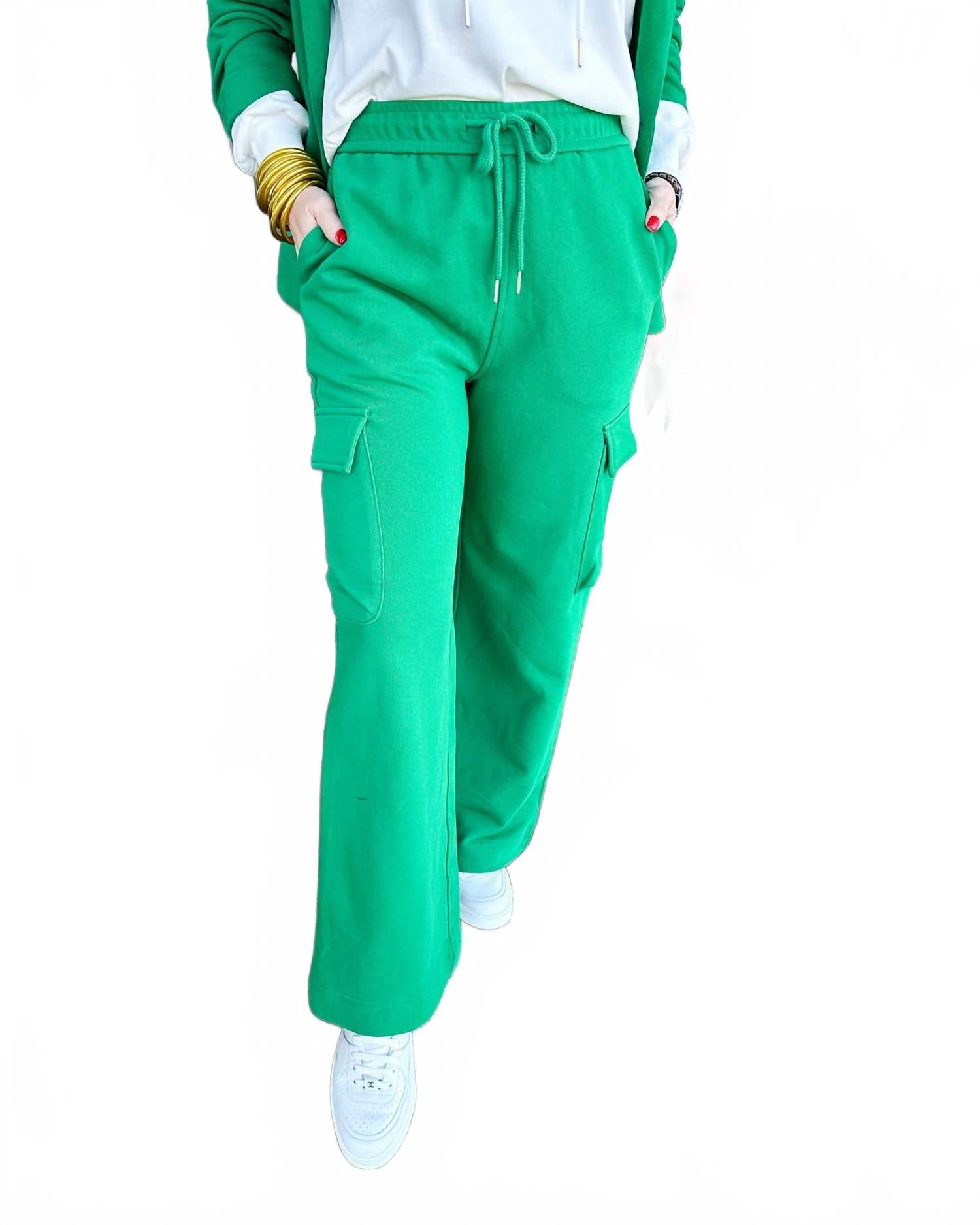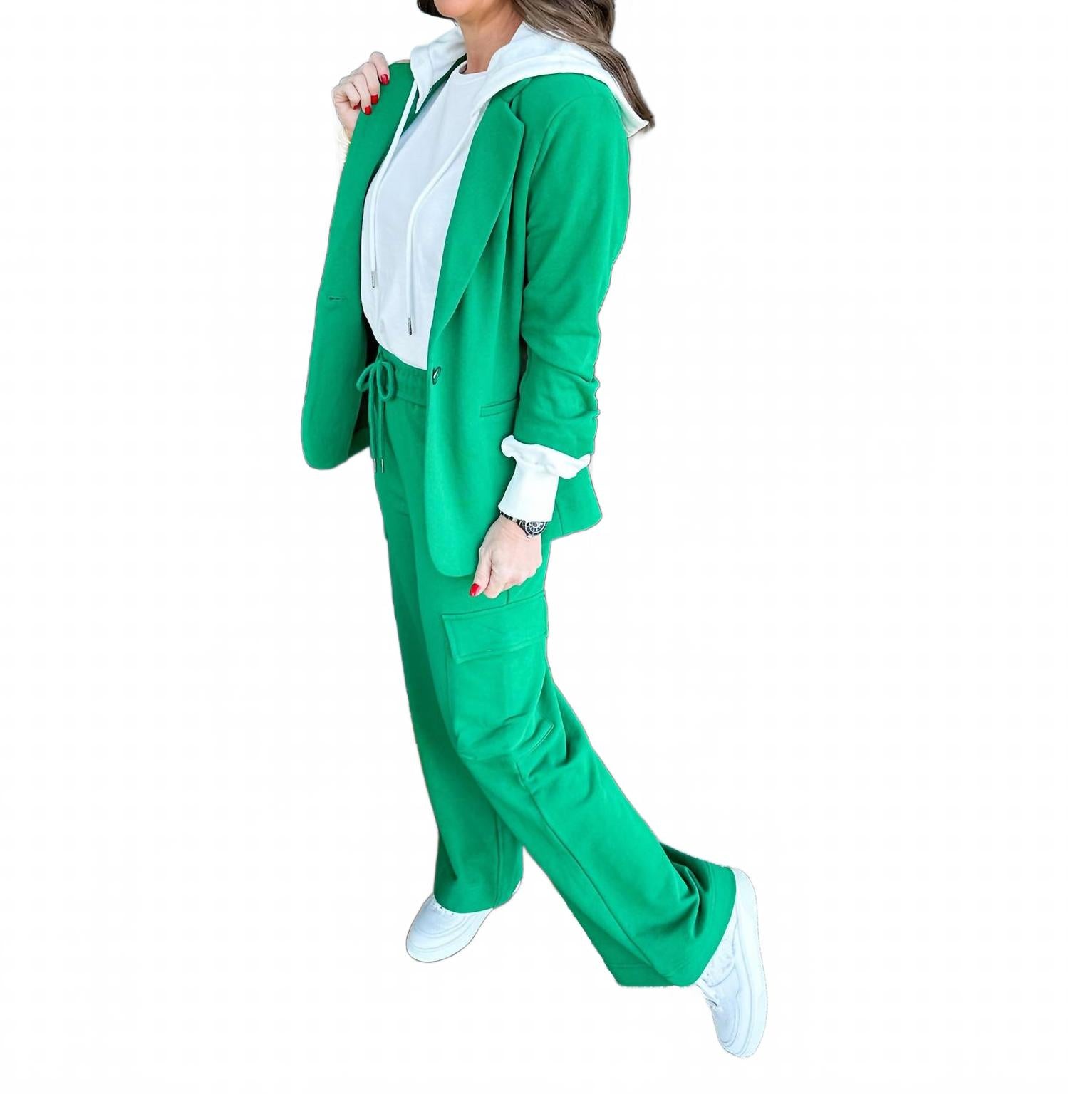 Представляем комплект из махрового пиджака и брюк Kelly Terry от RISEN - шикарный комплект одежды для дома в ярком зеленом цвете. Этот комплект состоит из жакета свободного кроя с длинными рукавами и капюшоном, а также махровых брюк широкого кроя с карманами-карго. Однотонный зеленый дизайн идеально подходит для путешествий и добавит спортивного, но элегантного штриха в ваш гардероб. Этот стильный и универсальный комплект идеально подходит как для отдыха, так и для прогулок.