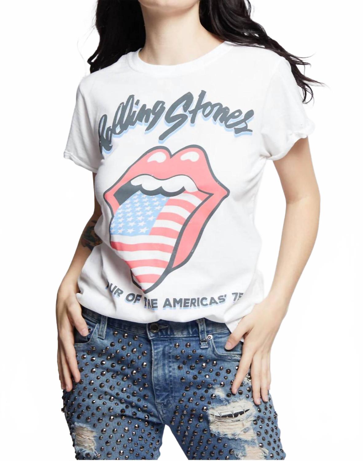 Не ищите дальше - вы нашли свою идеальную футболку! Ощутите культовый рок-стиль с футболкой Rolling Stones Tour Tee от Recycled Karma, которая станет незаменимым аксессуаром для любого музыкального фестиваля. Эта женская приталенная футболка с короткими закатанными рукавами и круглым вырезом в рубчик украшена подлинным логотипом тура 1975 года, создающим классическую графическую привлекательность. Футболка изготовлена ​​из 100% мягкого хлопка для комфортной носки и имеет облегающий крой (для более стандартной посадки рекомендуем взять больший размер). Застежка - надевайте. Идеально подходит для того, чтобы добавить нотку уличного стиля в ваш летний гардероб.
