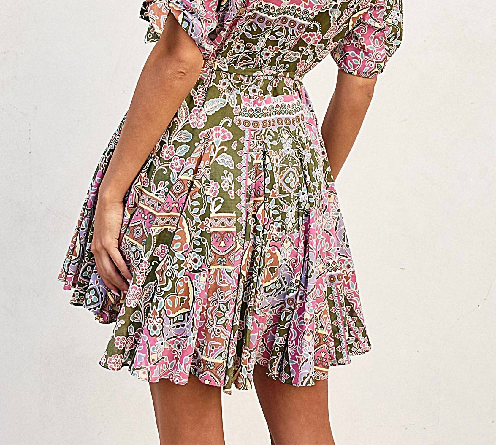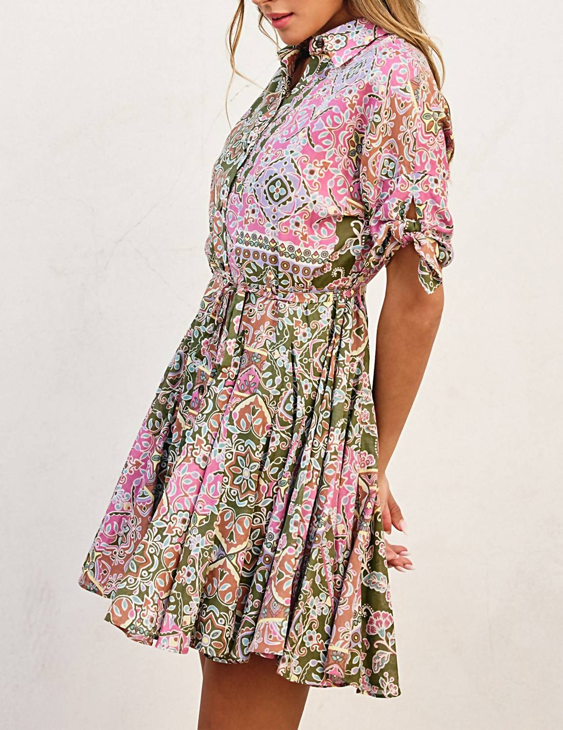 Представляем платье Arden от DRESS FORUM - очаровательное изделие в яркой розово-оливковой лоскутной гамме, излучающее непринужденную элегантность. Это платье-рубашка с короткими закатанными рукавами застегивается на пуговицы, а пояс на завязках идеально подчеркивает фигуру. Это мини-платье из смеси 80% вискозы и 20% хлопка отличается воздушным и непринужденным силуэтом, идеально подходящим для теплых прогулок. Оно идеально подойдет поклонницам стиля бохо-шик: V-образный вырез и функциональные детали на пуговицах добавят изысканности вашему летнему гардеробу.