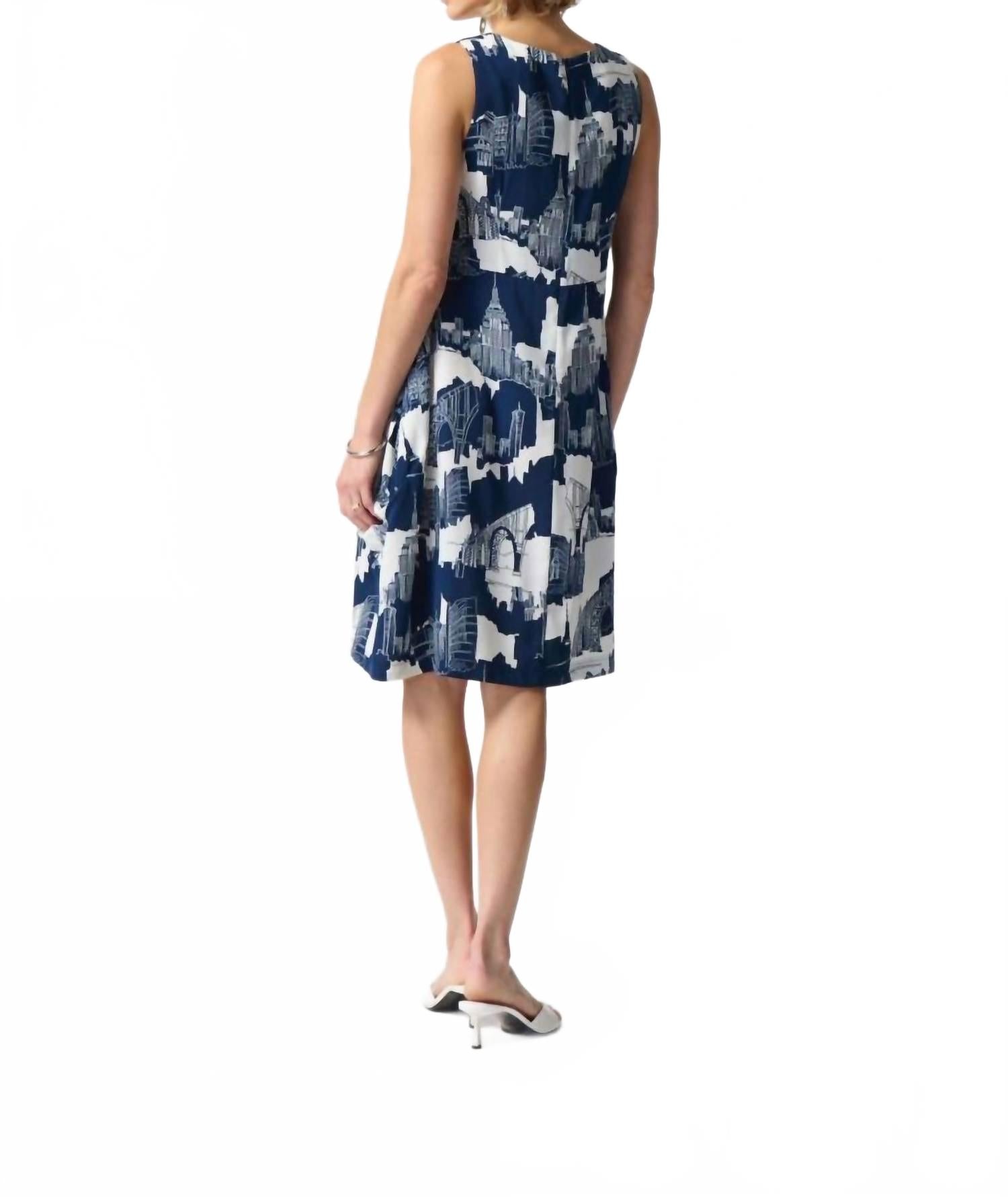 Короткое и воздушное платье для теплых дней. Представляем платье-трапецию без рукавов Joseph Ribkoff Cityscape - эффектное дополнение к любому гардеробу. Это платье длиной до колена украшено уникальным принтом городского пейзажа в тон ванильного/темно-синего цвета и идеально подходит как для повседневных, так и для официальных мероприятий. Платье изготовлено из 100% полиэстера и произведено в Канаде. Овальный вырез горловины дополнен изысканной застежкой-молнией сзади. Уход: ручная стирка в холодной воде, сушка в разложенном виде на горизонтальной поверхности, беречь от использования сушильной машины (при необходимости гладить с изнаночной стороны).