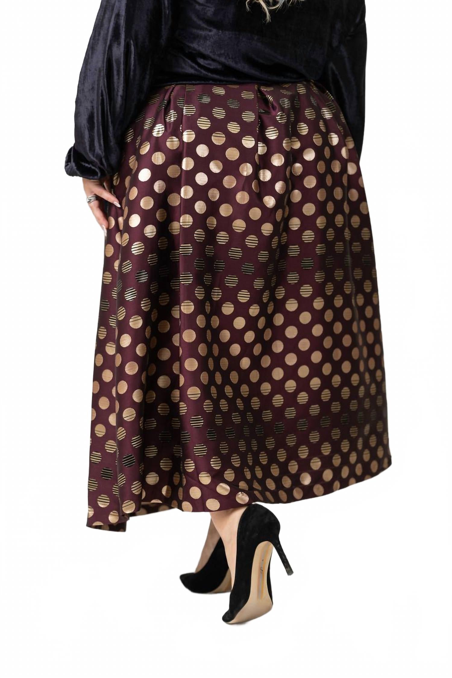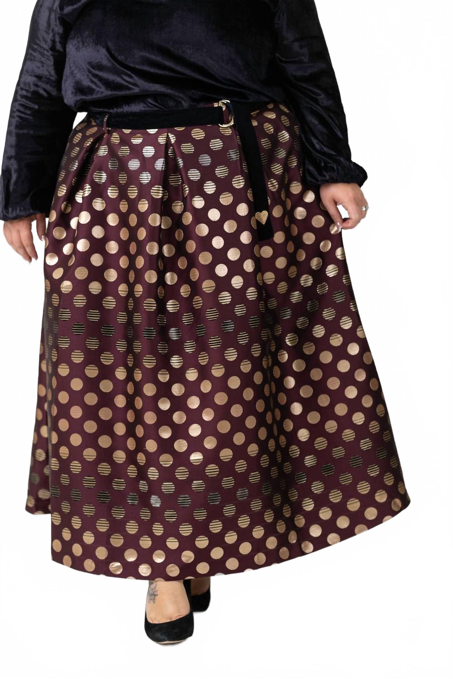 Юбка Zelda Maxi от Emily Lovelock - потрясающая модель бордового цвета, воплощающая бохо-шик в стиле 70-х. Она идеально подходит для любого вечернего мероприятия этой осенью. Эта пышная, объемная юбка, состоящая из 70% вискозы и 30% полиэстера, украшенная золотистым металлическим горошком, имеет узкую талию и карманы для дополнительной практичности. Тканевый пояс дополнен контрастной кружевной отделкой и застегивается на золотистую металлическую пряжку D-образного сечения, а боковая молния обеспечивает идеальную посадку. Уход за этой незаменимой вещью plus-size очень прост: машинная стирка и сушка в разложенном виде. Инструкции по применению: