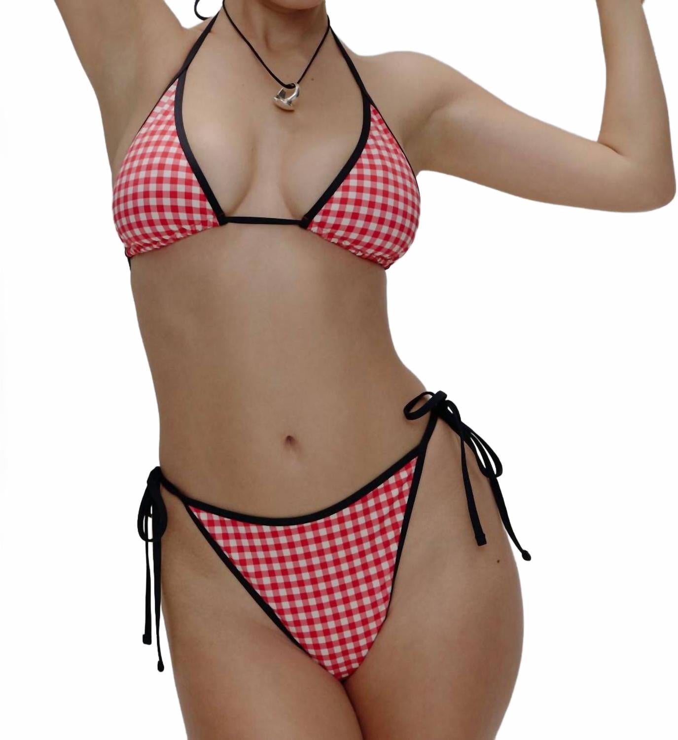 Этот очаровательный купальник идеально подходит для расслабленных моментов у бассейна, а в сочетании со струящейся юбкой легко превращается в идеальный наряд для ужина на закате. Топ-бикини Grace Triangle от Frankies Bikinis с ярким принтом в клетку Cherry Picnic - потрясающий базовый элемент для плавания. Этот женский топ изготовлен из 80% полиэстера и 20% спандекса, обеспечивая свободную посадку, идеально подходящую для летнего пляжного дня. Сшит из халтера и завязок на спине, он имеет среднюю степень закрытия, подчеркнутую контрастной черной окантовкой. Дополните его соответствующими плавками для создания завершенного образа в стиле Quiet Luxury.