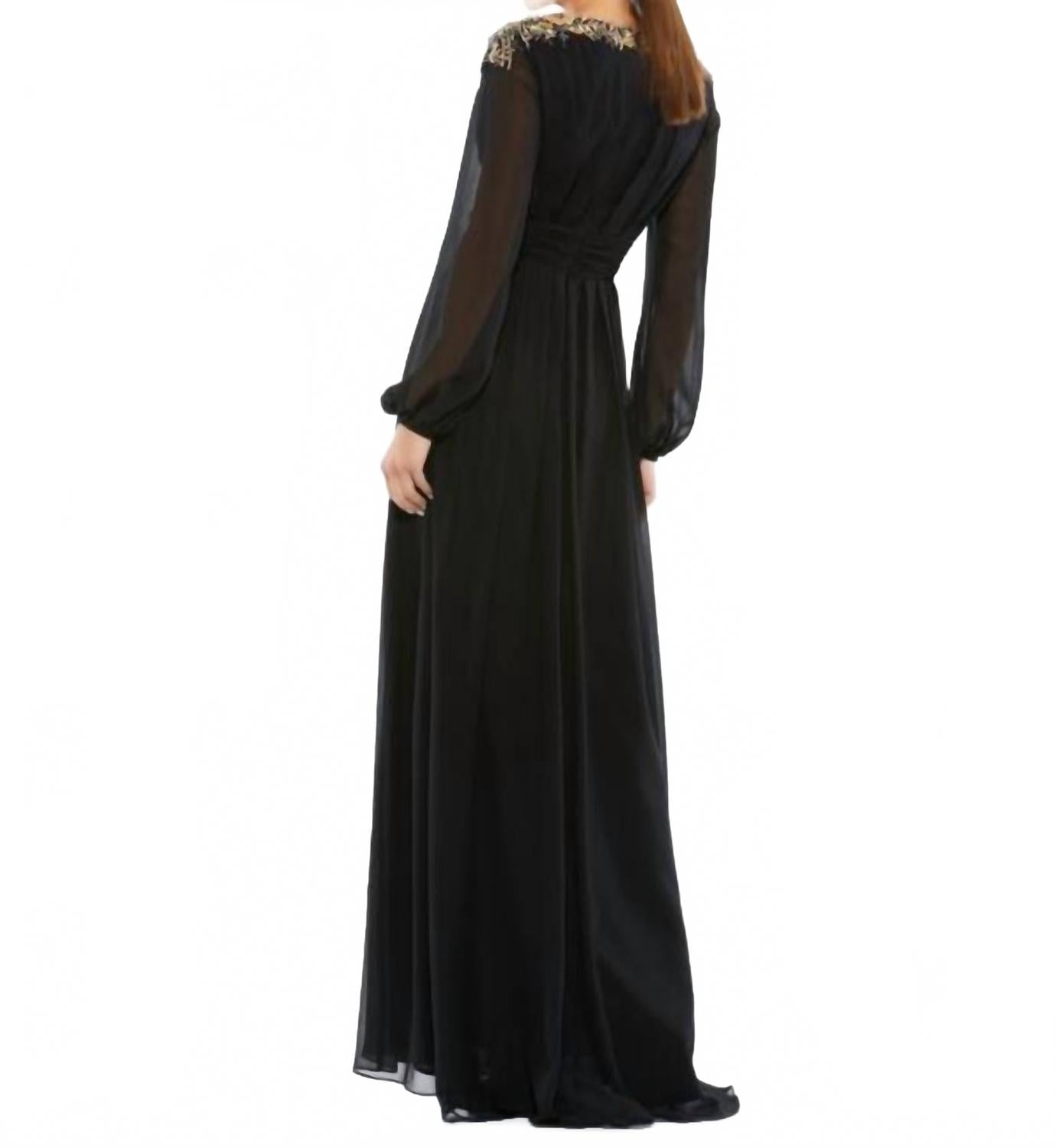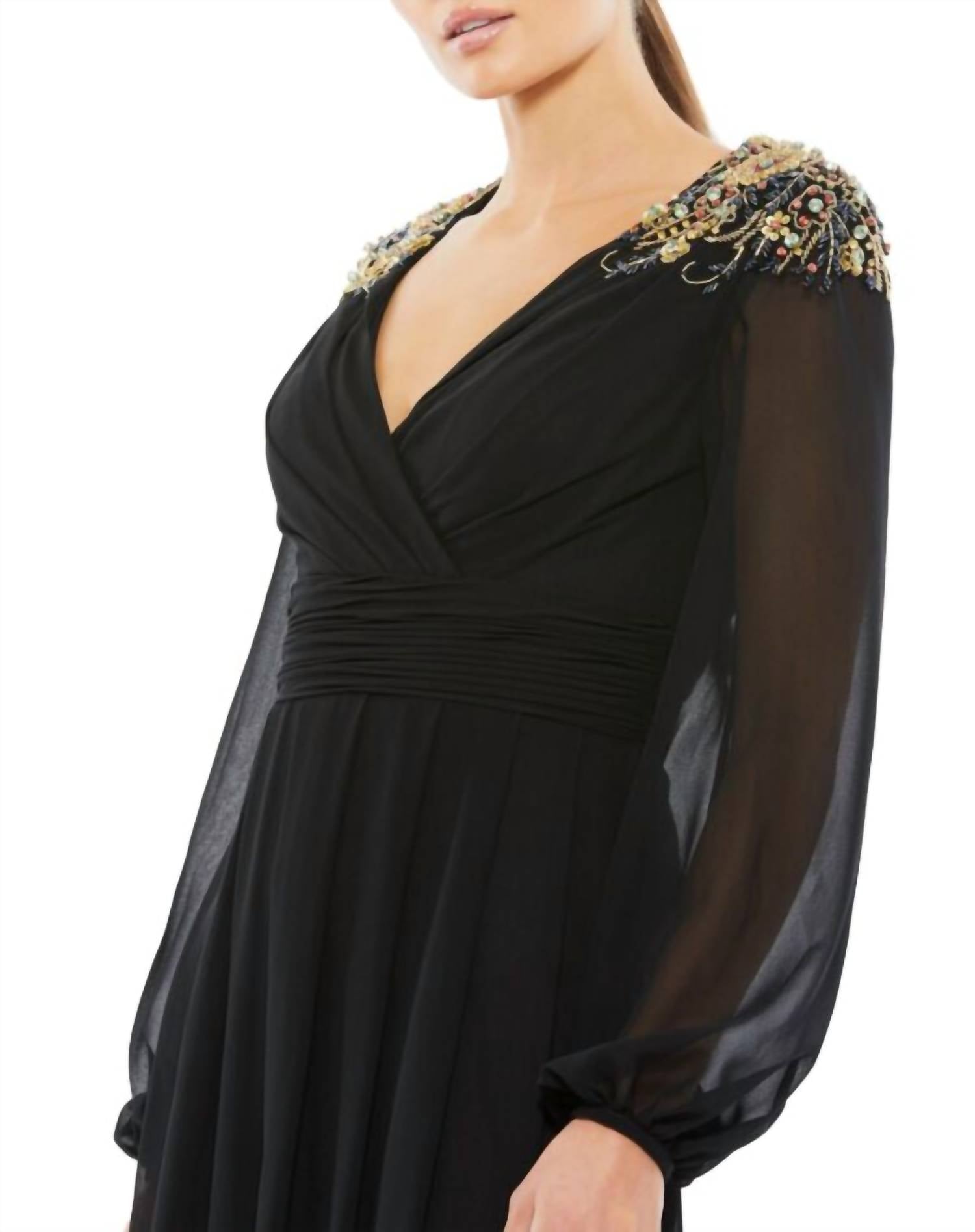 Встречайте вечернее платье с декорированными рукавами-блузонами от Mac Duggal - воплощение элегантности для вашего следующего мероприятия. Это однотонное черное платье из 100% полиэстерового шифона отличается длинными рукавами-блузонами и эффектным V-образным вырезом с имитацией запаха. Изысканная отделка из бисера и страз на плечах, а также разрез до бедра придают образу выразительность. Длина этого макси-платья с потайной молнией сзади составляет около 150 см от плеча до подола. Подходит для размеров с обхватом подмышки 45 см и обхватом талии 35 см.