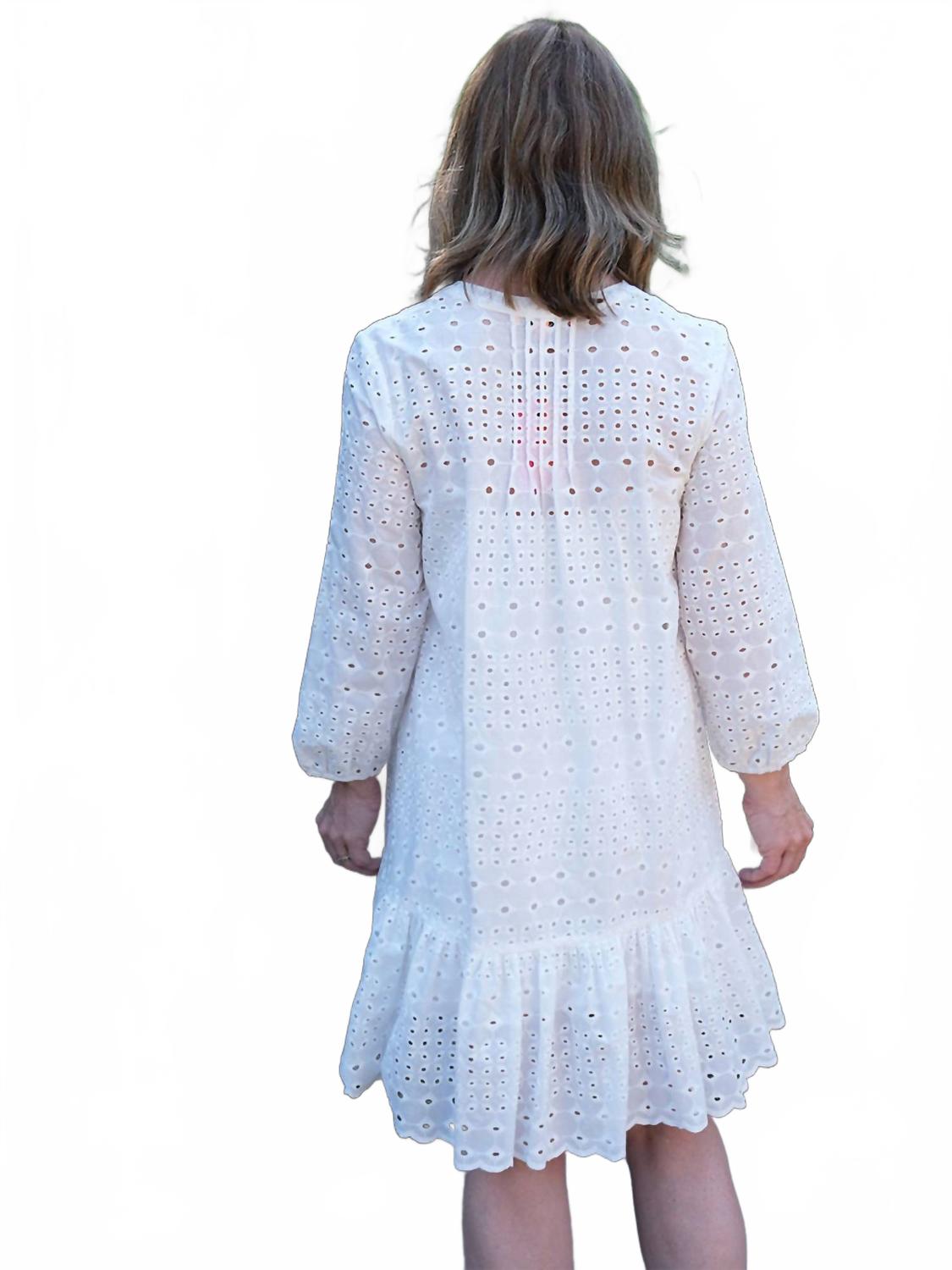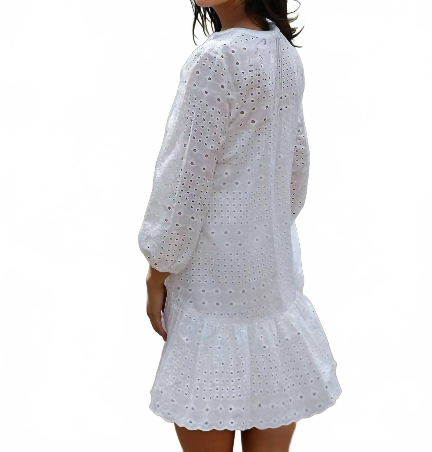 Короткое и воздушное платье для теплых дней. Встречайте своего самого желанного спутника этого лета - наше платье TAYLOR с люверсами в девственно-белом цвете! Эта воздушная красота сочетает в себе вечную романтику и современную непринужденность благодаря изысканной хлопковой ткани с люверсами, которая с одинаковой легкостью ловит легкий морской бриз! Сказочный силуэт отличается V-образным вырезом с изящной плиссировкой, эффектными рукавами-фонариками и игривым многоуровневым подолом с фестончатыми краями, который танцует чуть выше колена. Каждый замысловатый узор с люверсами рассказывает историю мастерства ручной работы! Комбинация в комплекте.