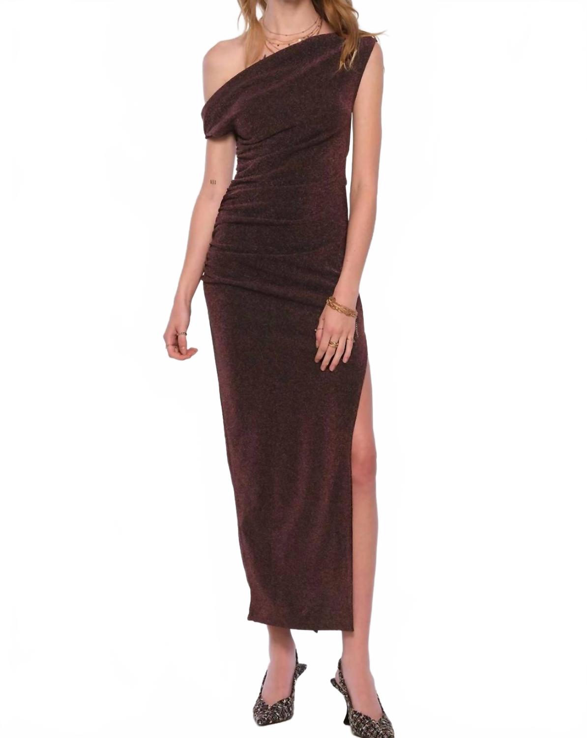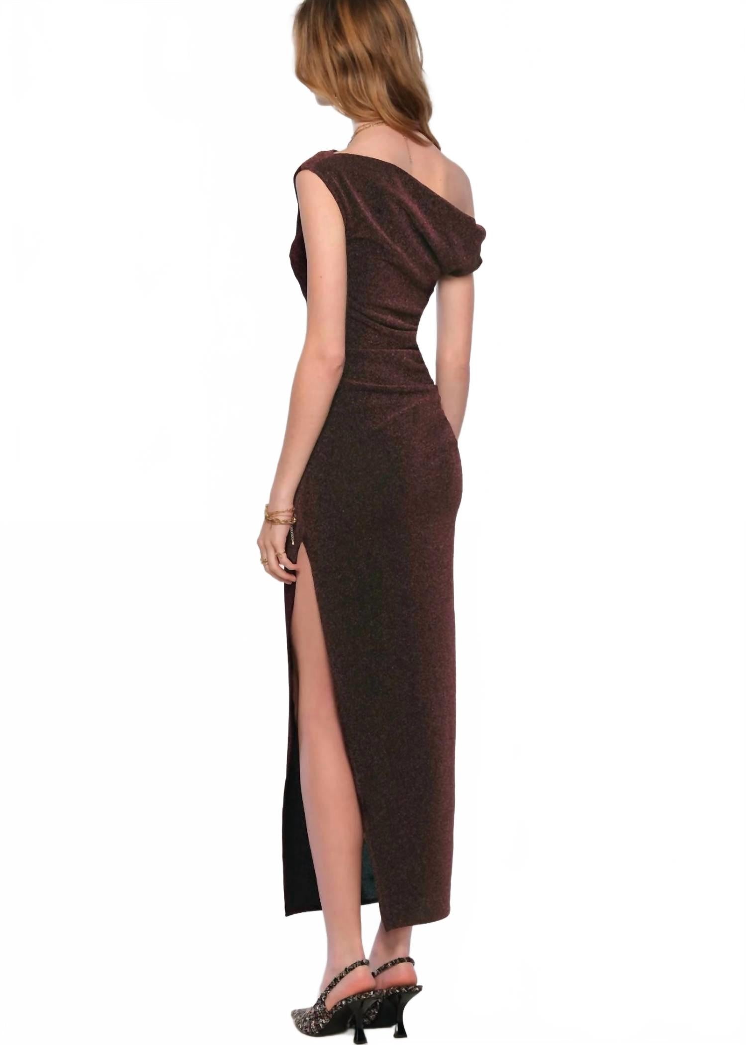 Платье макси, столь же милое, сколь и удобное. Выразите себя в стильном образе в платье макси Heartloom Jordie, выполненном в пленительном оттенке мокко. Это платье-футляр без рукавов выполнено из мерцающего трикотажа с добавлением 60% полиэстера, 35% металлизированной нити и 5% спандекса. Оно обеспечивает облегающую посадку и элегантные сборки по боковым швам. Вырез с открытыми плечами и боковой разрез подчеркивают его привлекательность, а застежка на липучке обеспечивает удобство при надевании. Это платье макси длиной 135 см от плеча можно стирать в стиральной машине. Идеально подходит для весенних званых ужинов и празднования Нового года.