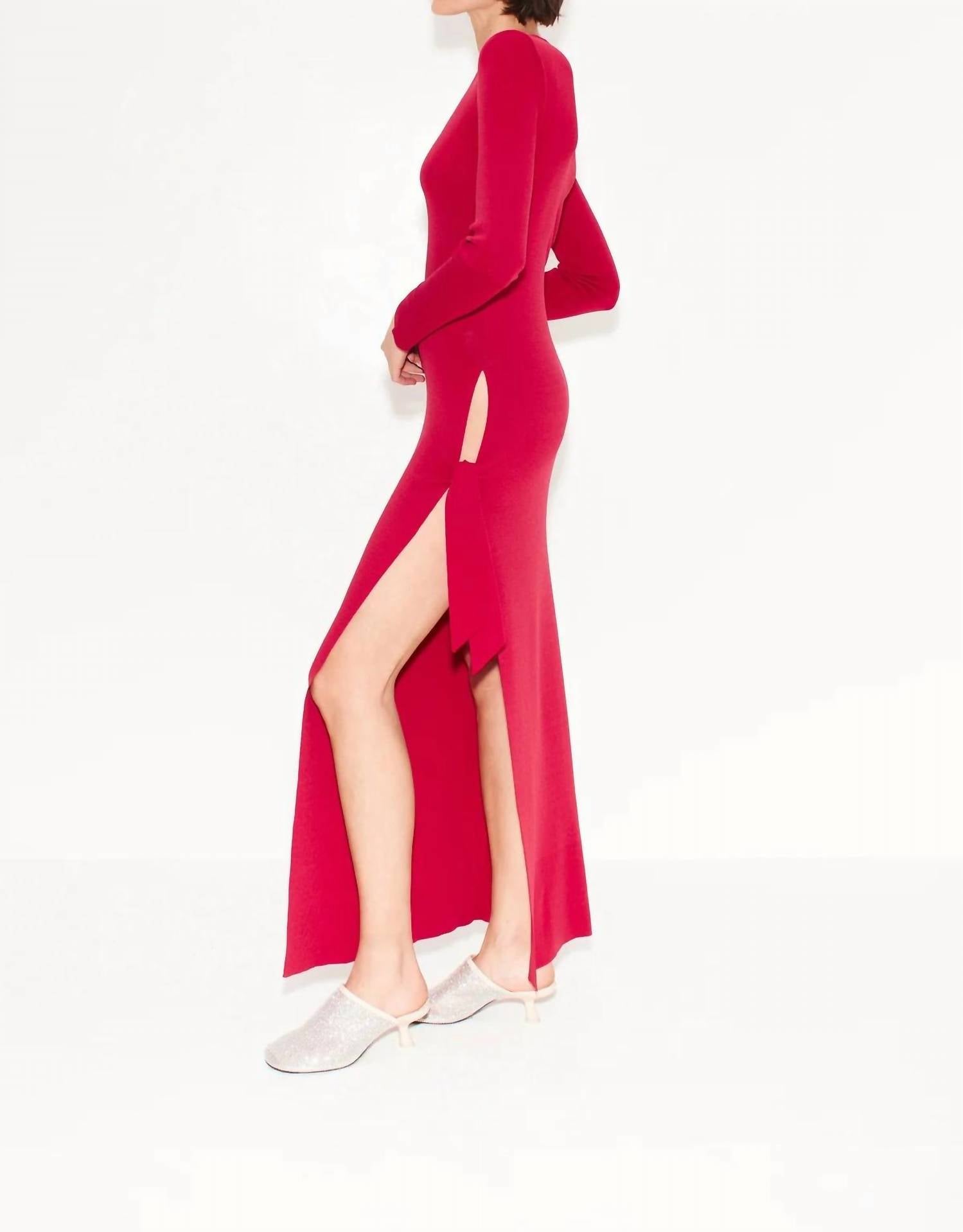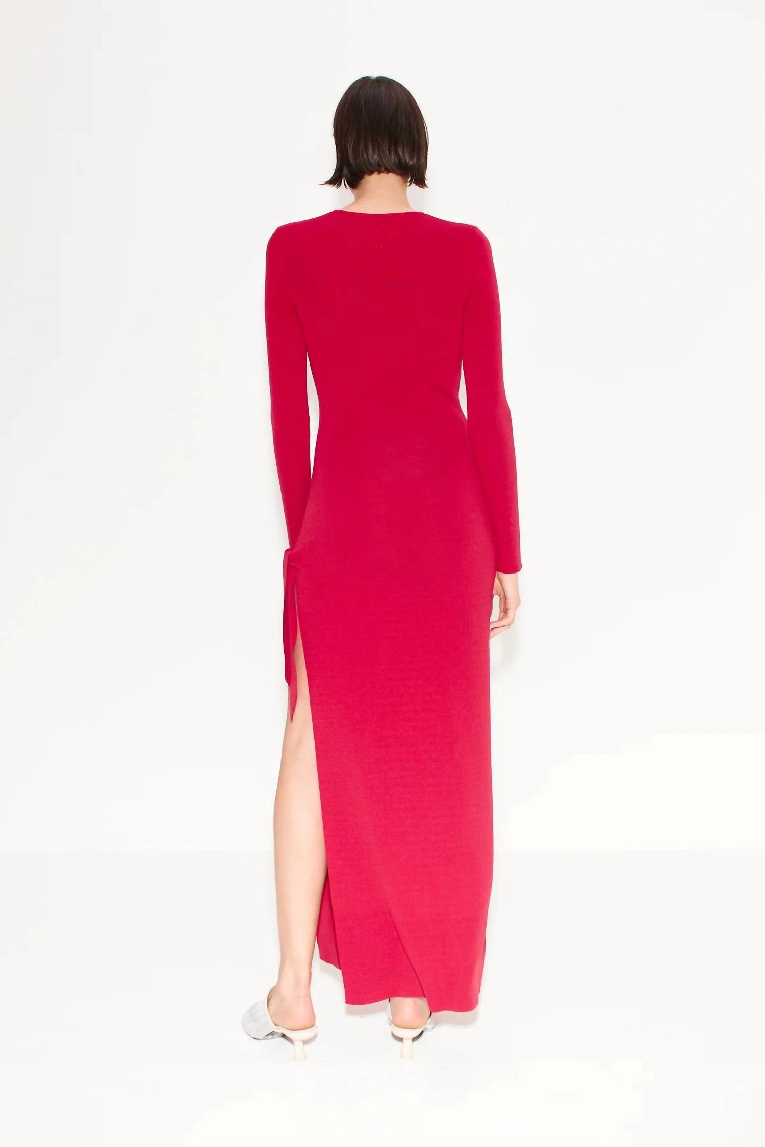 Длинное трикотажное платье Junjo от SIMON MILLER станет изысканным дополнением к вашему гардеробу и идеально подойдет для работающих и креативных людей. Это облегающее платье яркого цвета «сангрия» с высоким разрезом сбоку и завязывающимся узлом на бедре добавит элегантности вашему вечернему наряду. Состав: 65% вискозы и 35% нейлона, оно компактное и легкое, идеально подходит для осенних мероприятий. Застежка: надевается на себя. Уход: машинная стирка в холодной воде, сушка в стиральной машине при обычной температуре, глажка при низкой температуре.