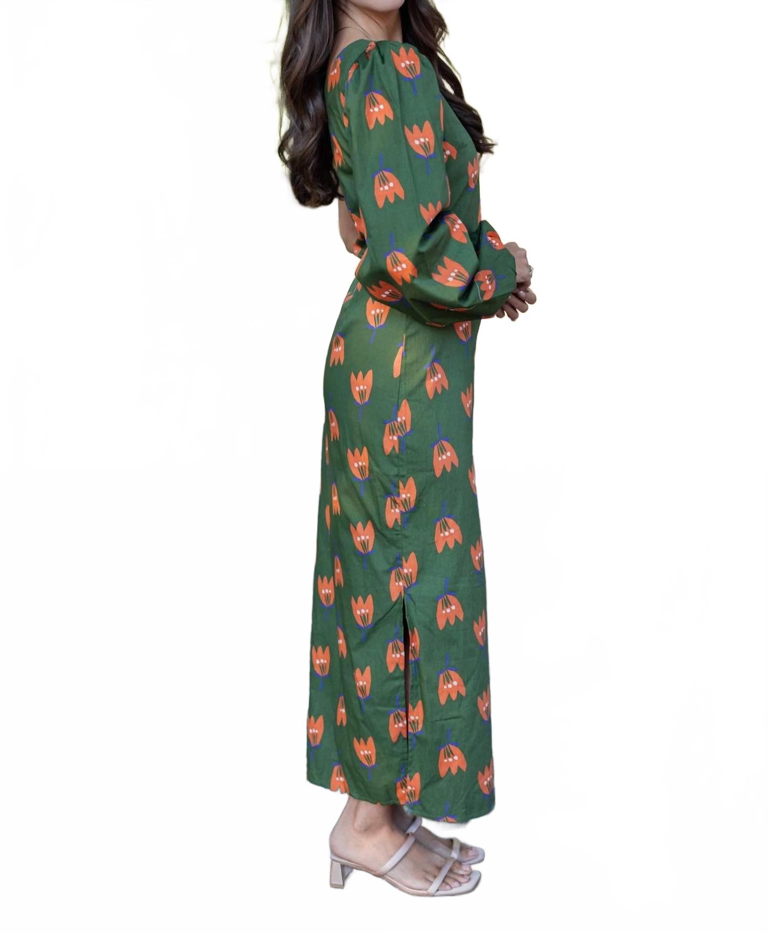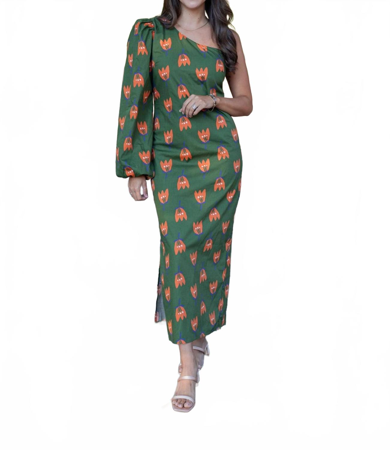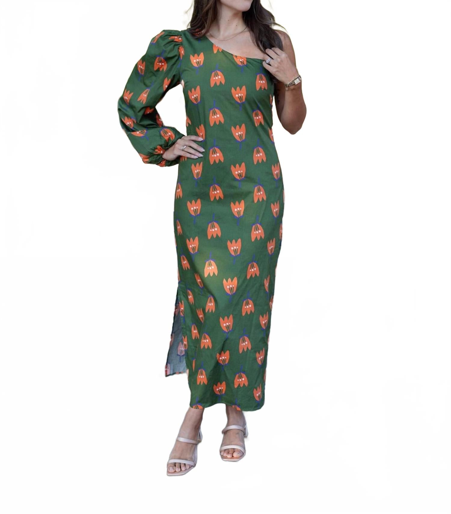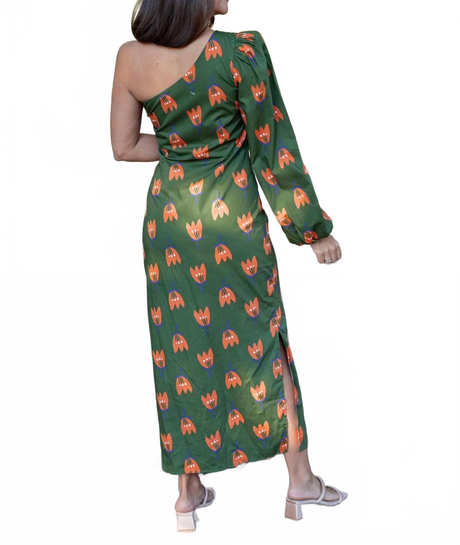 Украсьте свой гардероб макси-платьем Karlie на одно плечо яркого оливково-зеленого оттенка с ярким оранжево-фиолетовым цветочным принтом в виде маков. Элегантный крой отличается асимметричным вырезом и одним длинным рукавом-фонариком с эластичной манжетой, что придает ему немного драматизма. Это платье из 100% хлопка частично на подкладке имеет потайную молнию с крючком и петлей сбоку для идеальной посадки. Инструкции по уходу: бережная стирка в холодной воде и сушка на веревке - это гарантирует, что платье прослужит вам долгие стильные выходы.