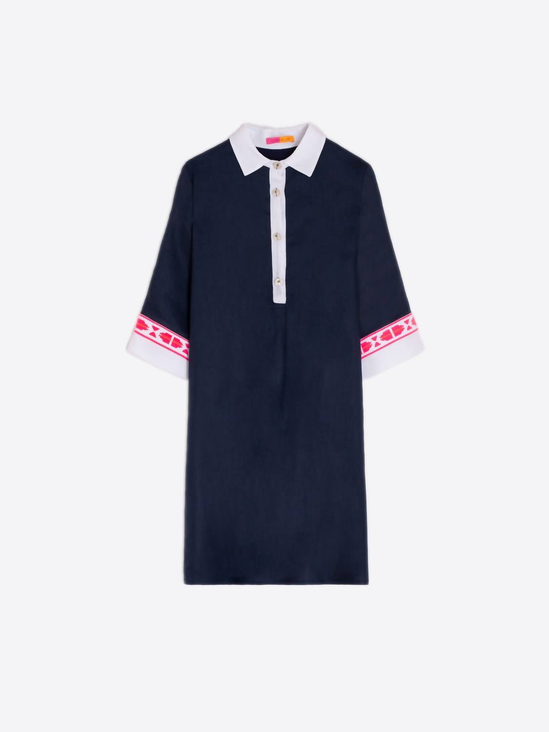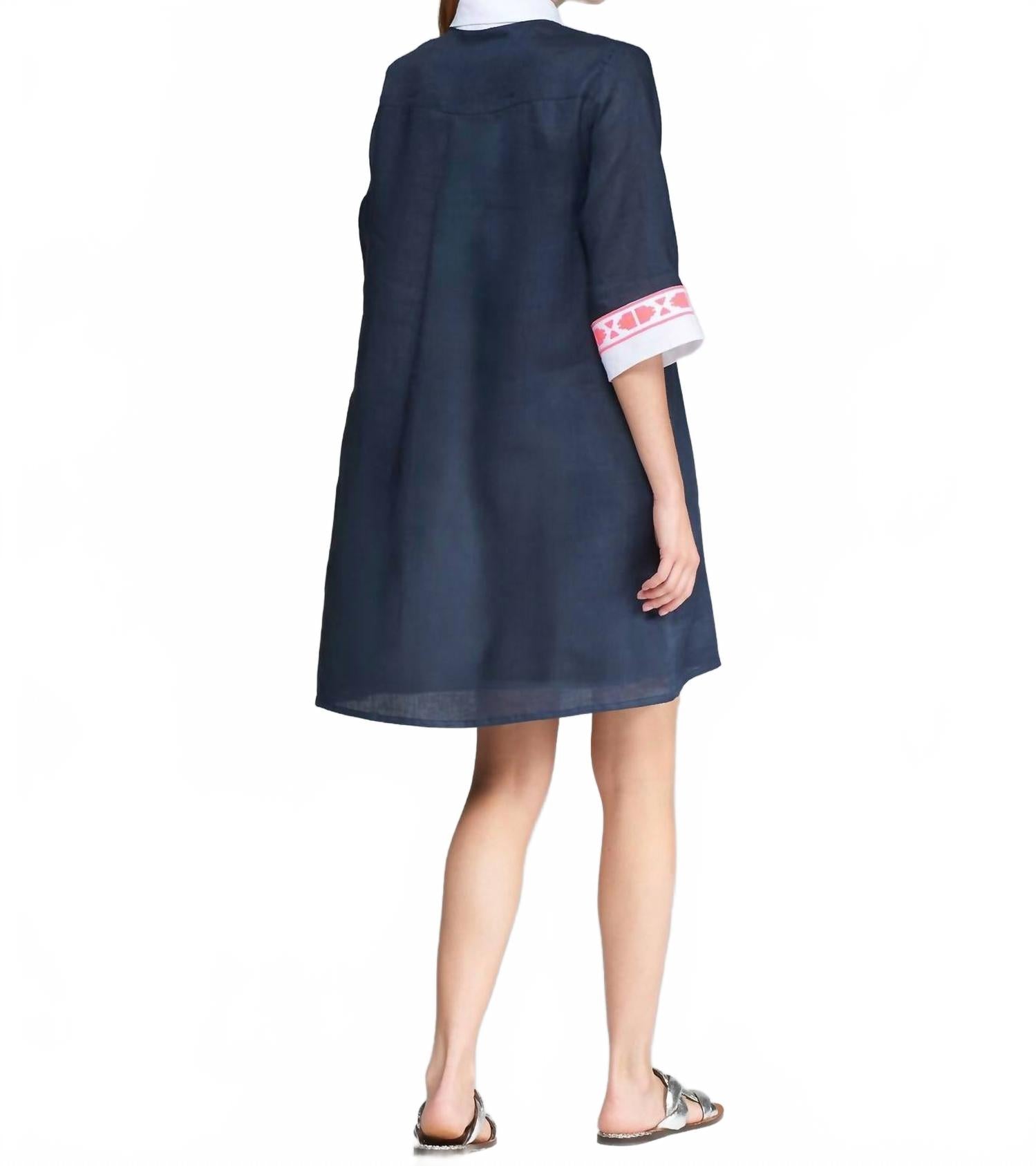 Удобное и милое, это повседневное платье - идеальный выбор для любого званого ужина. Встречайте вышитое мини-платье Miranda от Vilagallo - шикарный выбор для любого званого ужина. Это платье темно-синего цвета с короткими рукавами украшено изысканной розовой вышивкой на рукавах и эффектным белым воротником с декоративными пуговицами в виде пальм. Платье изготовлено из 100% льна, оно удобно и стильно благодаря застежке на пуговицы, создавая минималистичный образ, идеально подходящий для весенних мероприятий. Уход за платьем прост: рекомендуем машинную стирку, что делает его практичным и одновременно модным дополнением к вашему гардеробу.