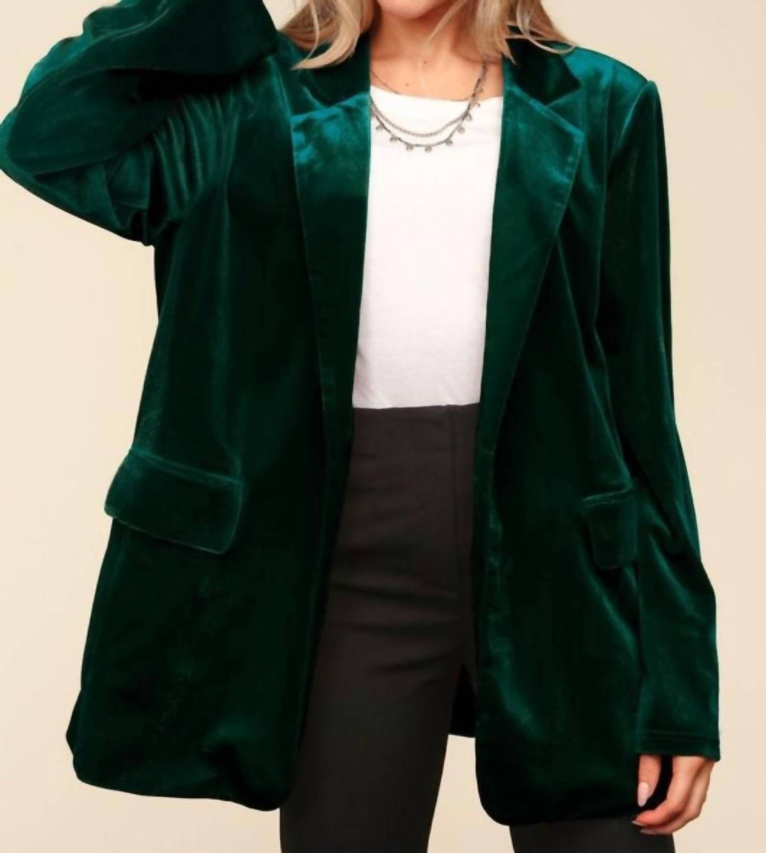 Представляем пиджак Curvy Solid Velvet Blazer от Haptics - изысканное дополнение к любому гардеробу благодаря насыщенному зеленому цвету Hunter Green. Этот пиджак, изготовленный из 100% полиэстера, с длинными рукавами, приталенным воротником и лацканами, имеет классический и элегантный силуэт. Отделка из плотного бархата и слегка уплотненные плечи придают ему роскошный вид, а практичные детали, такие как карманы, обеспечивают функциональную элегантность. Застежка на пуговицы идеально сочетает в себе стиль и удобство.