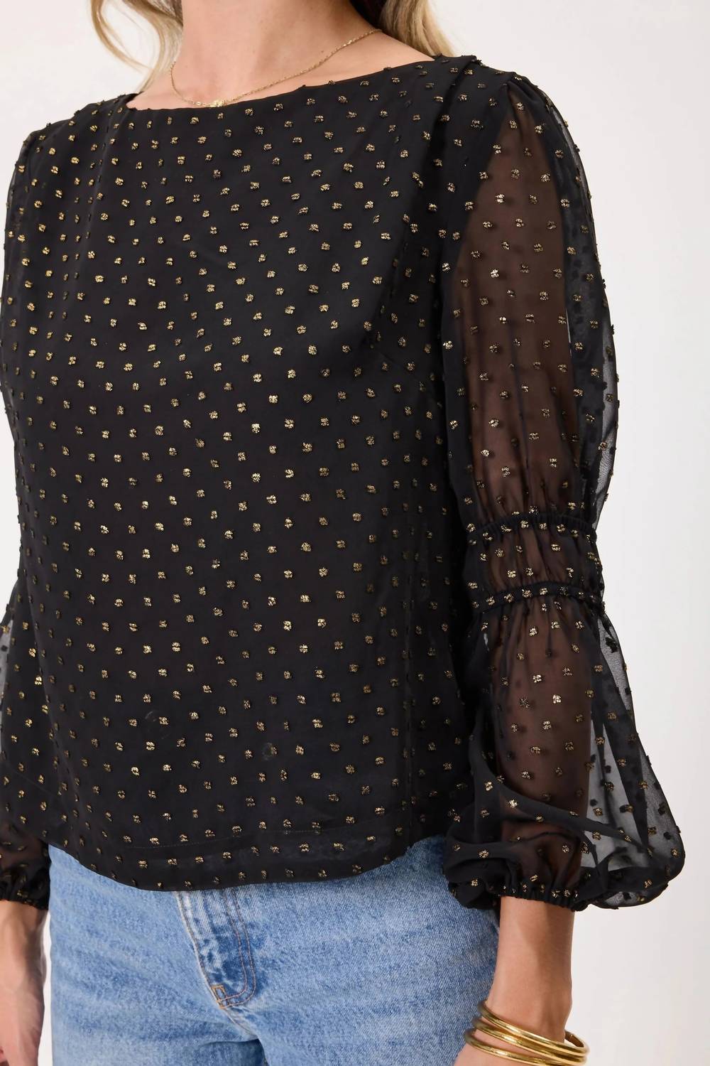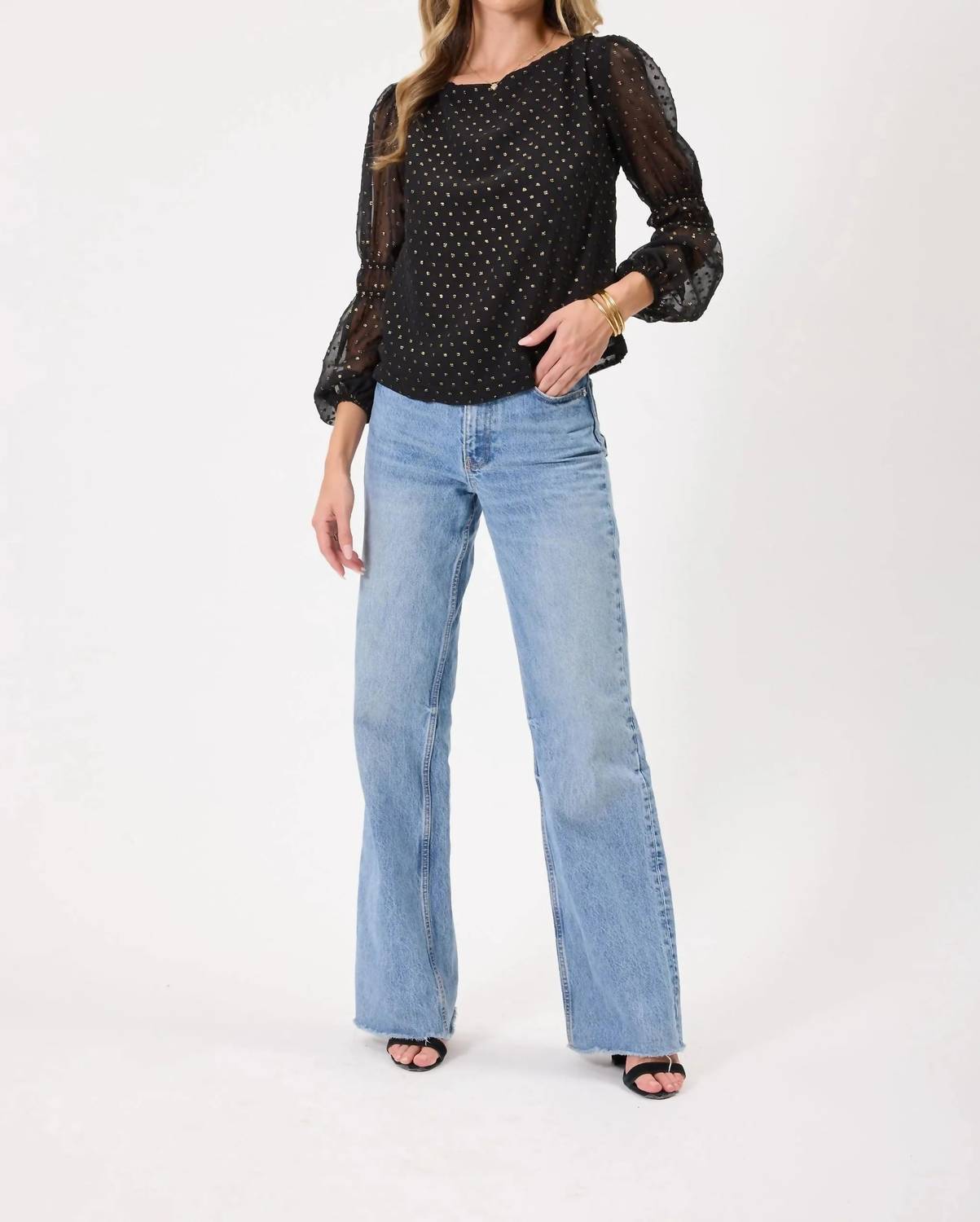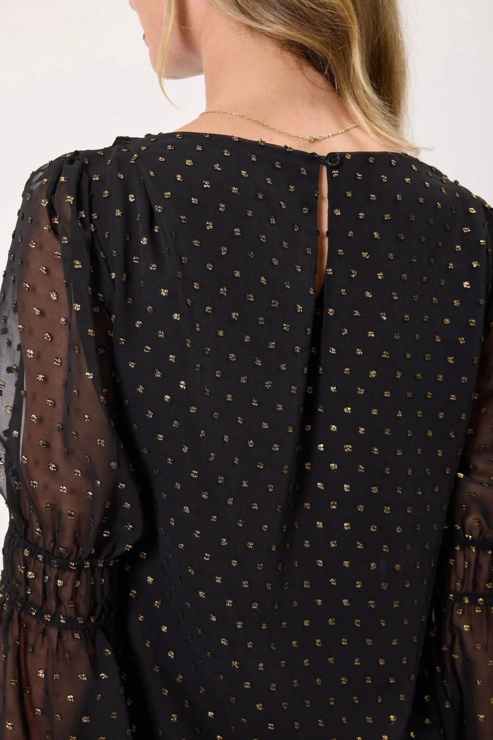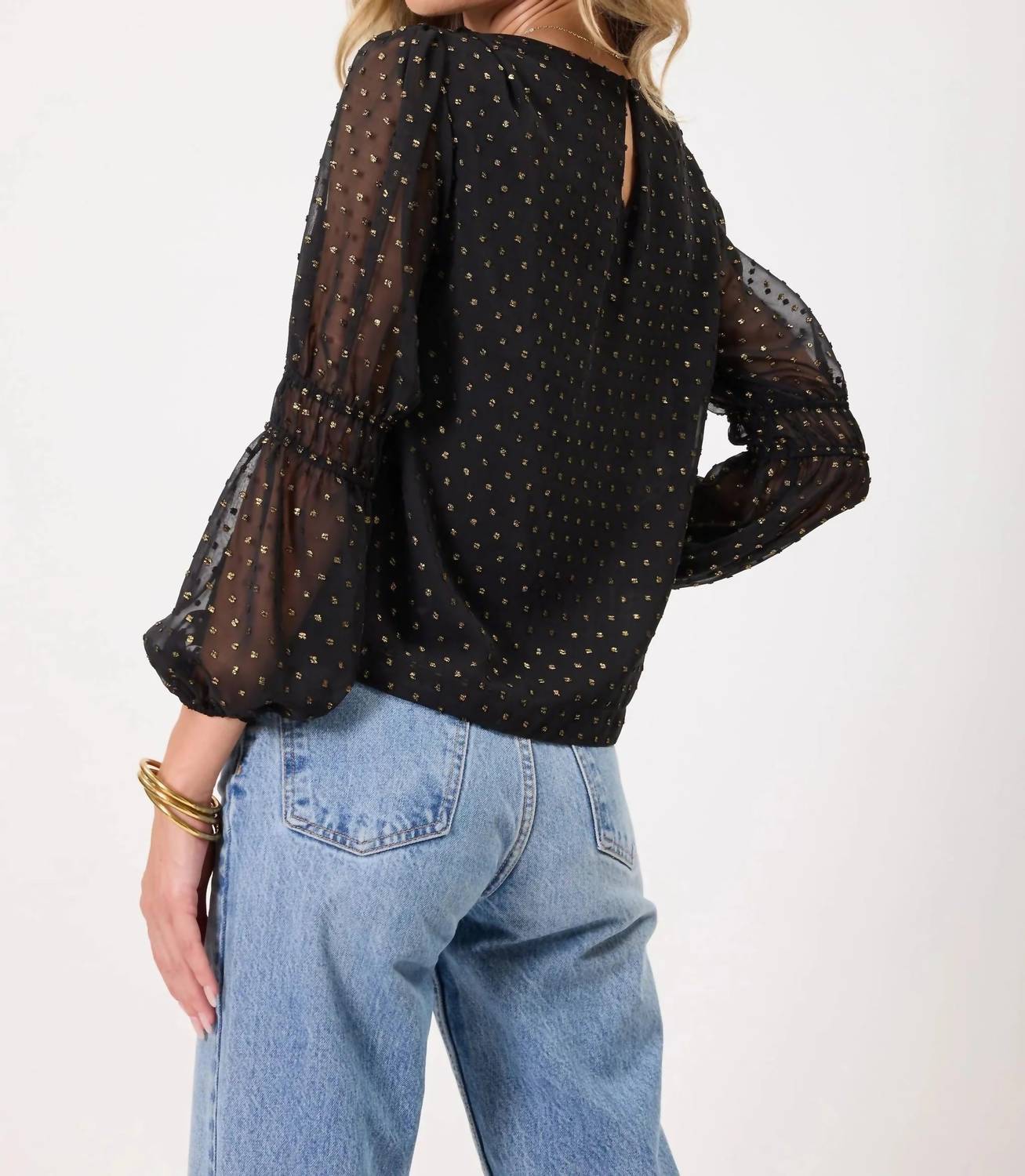 Универсальная блузка, которая подойдет как для работы, так и для ужина! Длинный топ Kylie Paige Fuller черного цвета - идеальный выбор для элегантного отдыха. Текстурированные прозрачные рукава-бишоп придают ей изысканность. Изготовленная из 100% полиэстерового жаккарда, эта блузка обеспечивает очаровательную и комфортную посадку, идеально подходящую для сочетания с джинсами или создания праздничного образа. Высокий вырез, застежка на пуговицы и подкладка по всей длине обеспечивают дополнительную защиту. Уход за блузкой прост: рекомендуется бережная машинная стирка в холодной воде и сушка на воздухе. Рост модели 178 см, размер S.