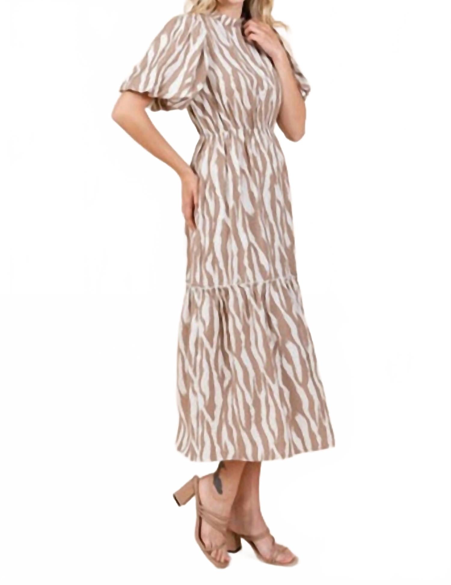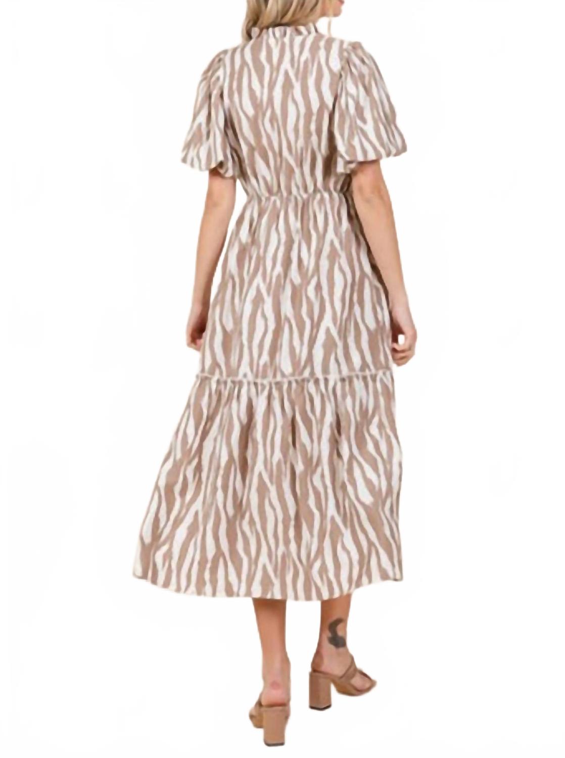 Украсьте свой летний гардероб многоярусным платьем миди с принтом «Зебра» от GEEGEE - эффектным изделием с классическим рисунком «зебра» цвета слоновой кости и бежевого. Это платье А-силуэта с короткими рукавами, рукавами-буфами и V-образным вырезом с разрезом, а многоярусный лиф добавляет движения и стиля. Платье изготовлено из комфортной смеси 90% вискозы и 10% нейлона, полностью на подкладке из 100% полиэстера. Платье имеет элегантный силуэт и эластичный пояс для идеальной посадки. Застежка легко застегивается, поэтому оно идеально подходит для Дня благодарения или церковного торжества.