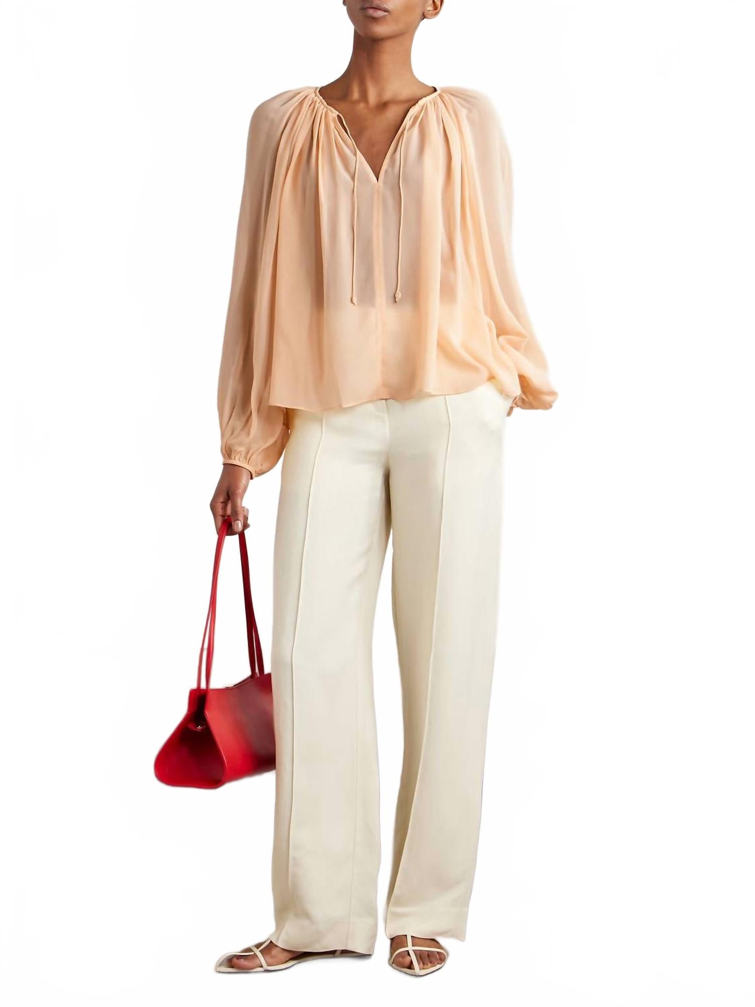 Откройте для себя воздушное очарование блузки Safa с длинным рукавом от Ulla Johnson нежного пионового оттенка. Изготовленная из 100% шелка, эта блузка выполнена в причудливом крестьянском стиле, дополненном V-образным вырезом и регулируемыми завязками на присборенной горловине. Эта однотонная модель с застежкой-липучкой станет идеальным дополнением к любому весеннему гардеробу и идеально подойдет для пасхальных посиделок и праздничных вечеринок. Инструкции по уходу: ручная стирка и сушка на горизонтальной поверхности - залог безупречного состояния блузки.