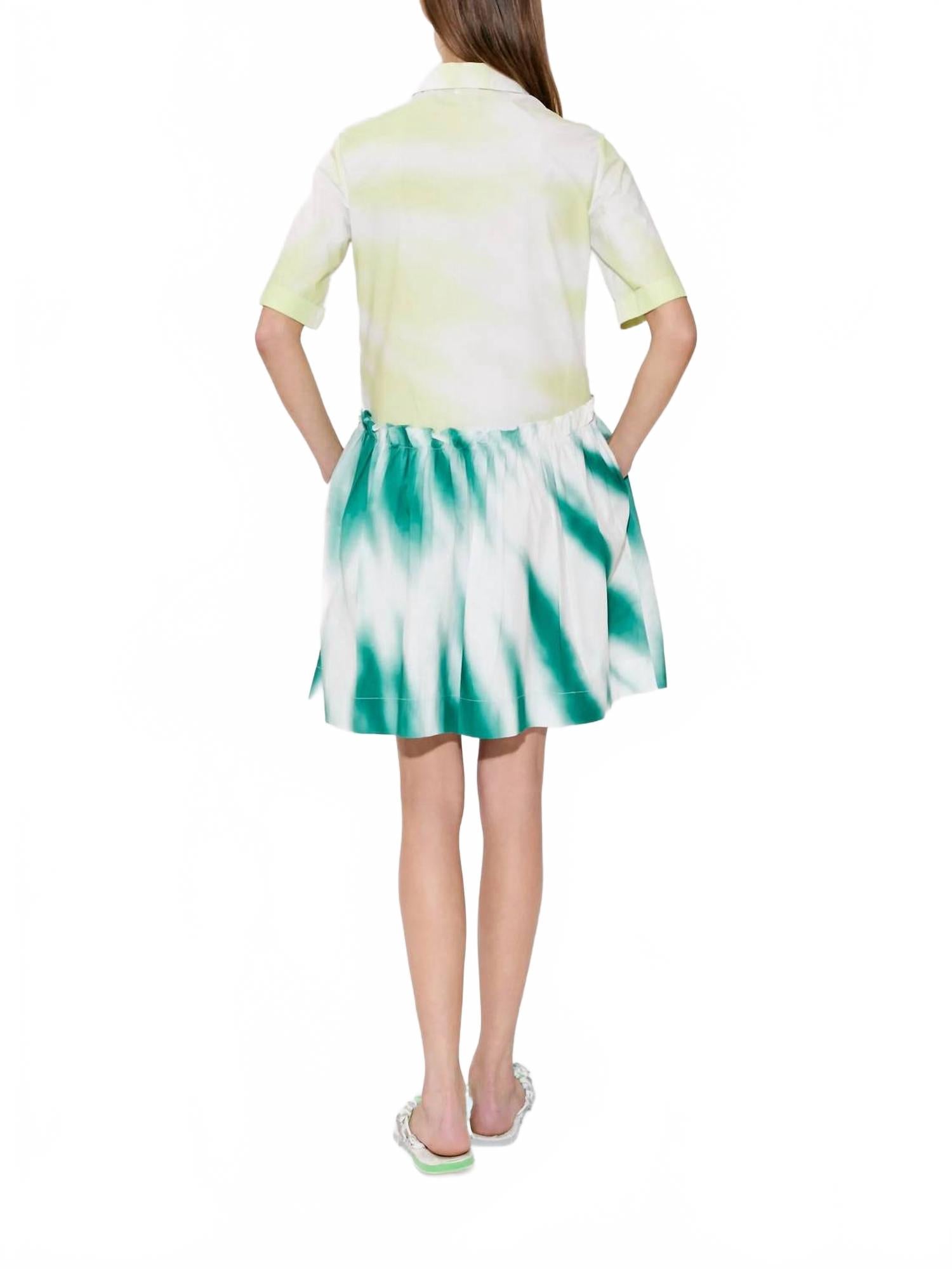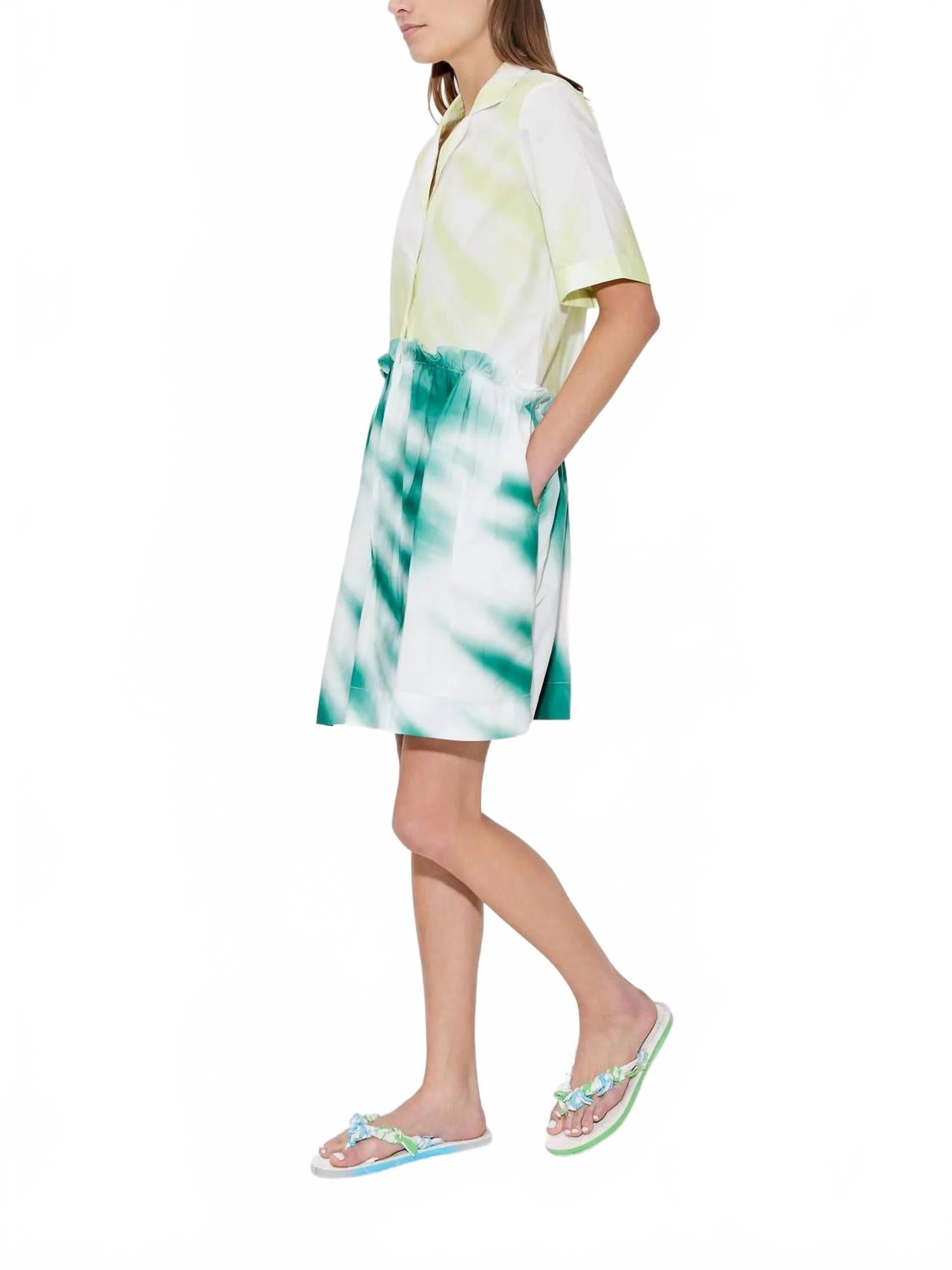 Повседневное, удобное и милое! Платье, которое вы будете носить весь сезон. Представляем мини-платье-рубашку Rosie Assoulin со сборками - яркое дополнение к вашему гардеробу в яркой лаймово-бирюзовой расцветке тай-дай. Это платье А-силуэта с короткими рукавами выполнено из дышащего хлопкового поплина и имеет элегантный воротник-стойку. Платье изготовлено в Индии и оснащено функциональными карманами, что делает его одновременно практичным и модным. Благодаря надежной застежке на пуговицы, это платье следует сдавать только в химчистку, чтобы сохранить яркие цвета и текстуру. Идеально подходит для праздничной вечеринки осенью.