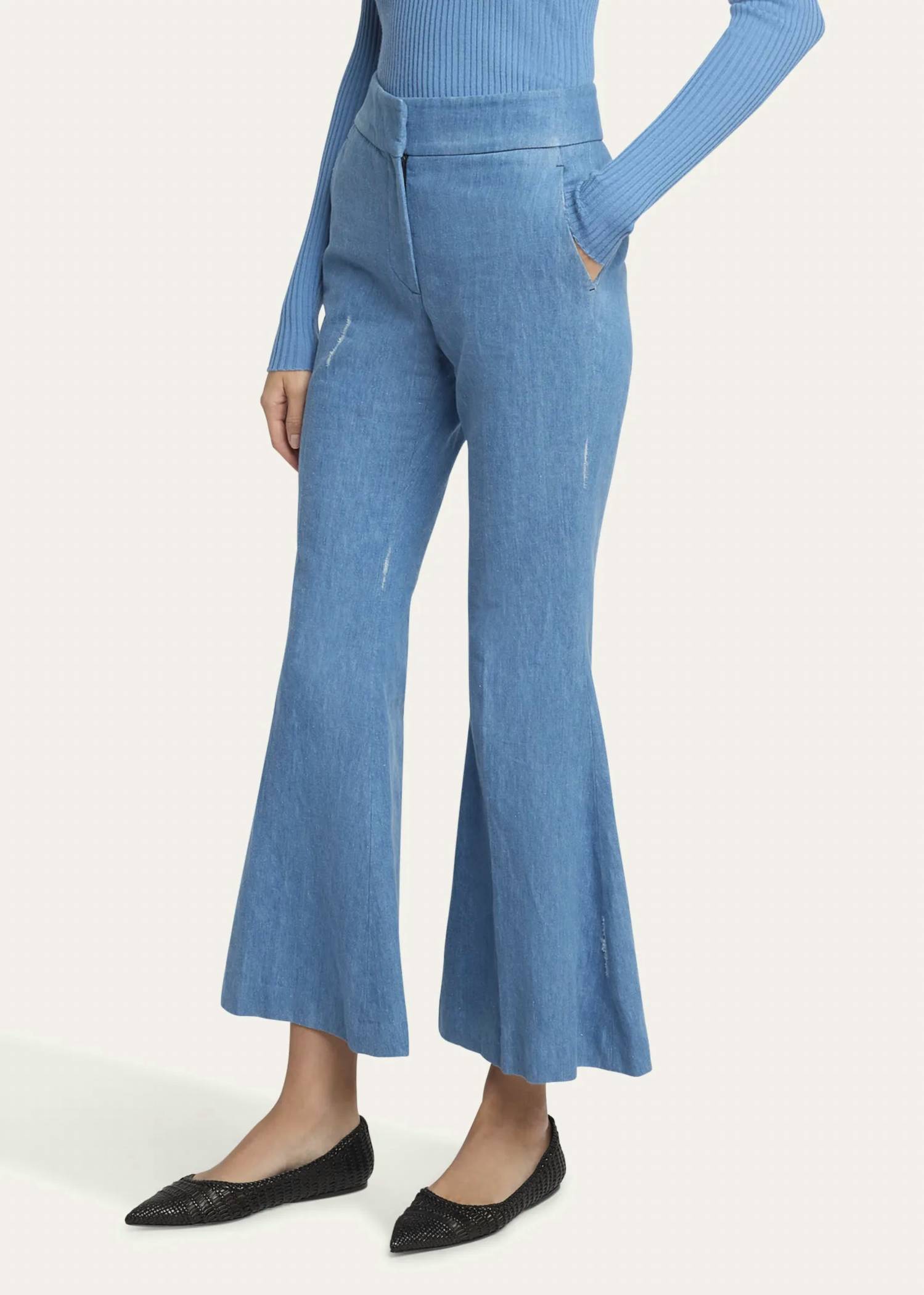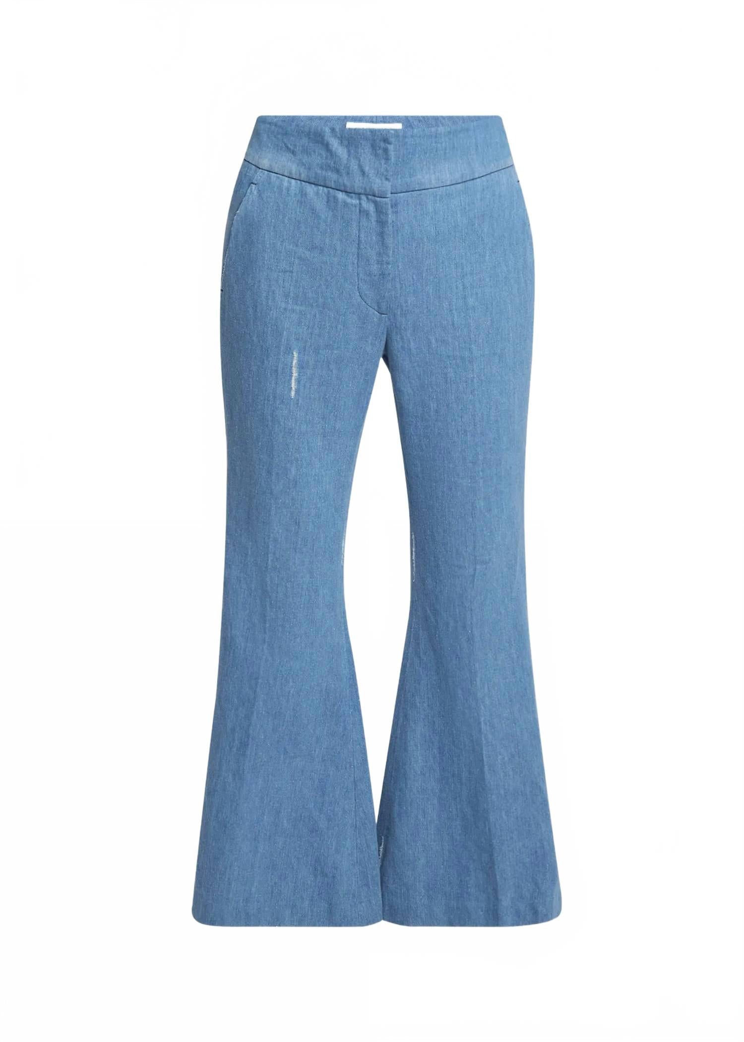 Слегка расклешенные брюки сейчас в тренде, и эти не исключение. Сочетайте их с любимой футболкой для более повседневного образа или с любимой блузкой на пуговицах для вечернего выхода. Представляем брюки Marsh от Gabriela Hearst - изысканное дополнение к любому гардеробу. Они изготовлены из 68% переработанного хлопка и 38% льна. Эти светло-голубые джинсовые брюки с высокой посадкой, облегающим кроем и стильным расклешенным кроем. Дизайн дополнен застежкой-молнией и двумя стильными задними прорезными карманами. Эти брюки, с гордостью произведенные в Италии, для сохранения их элегантного вида достаточно простой химчистки.