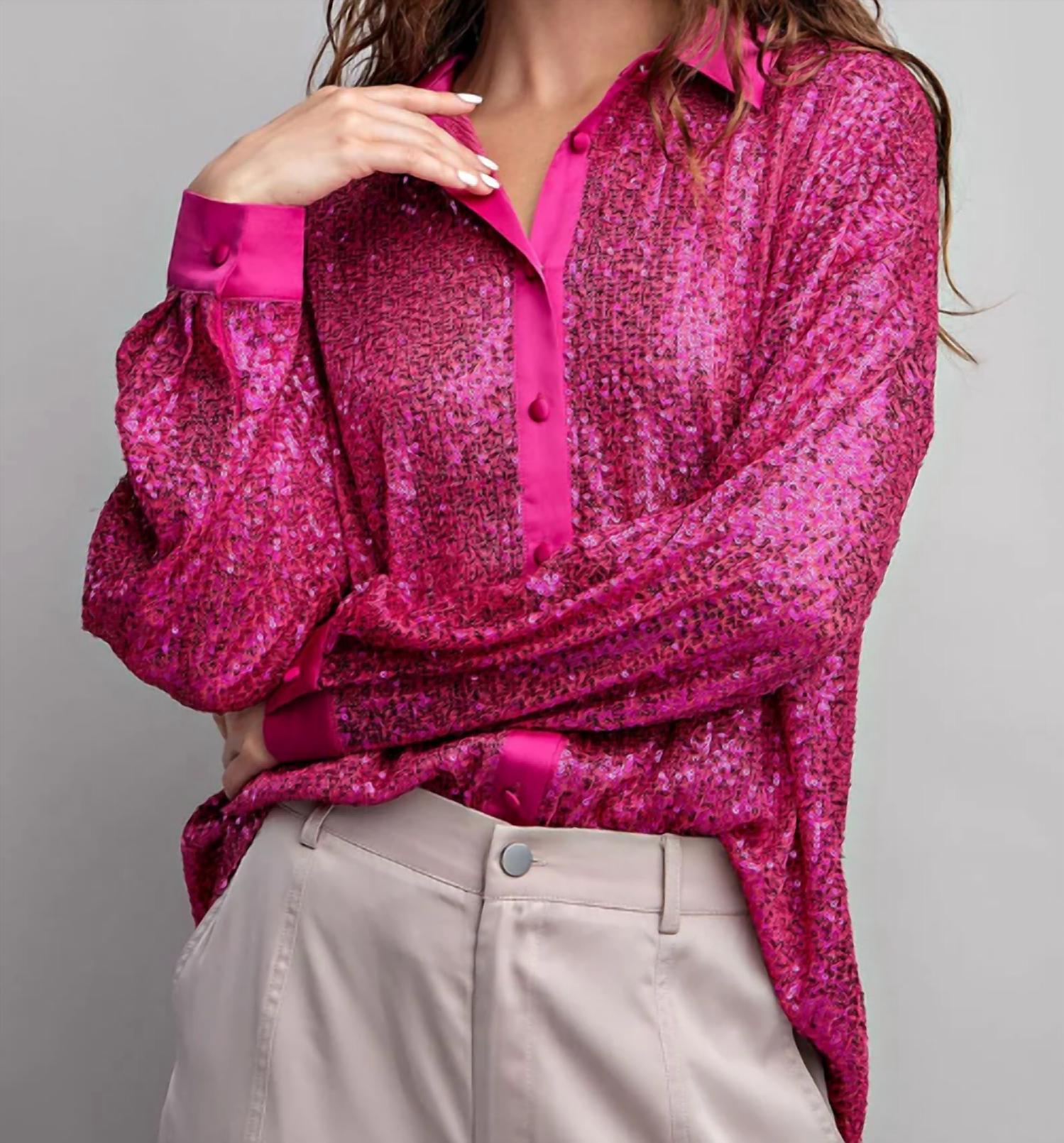 Эта рубашка на пуговицах удобная и в то же время элегантная. Дополните свой вечерний образ рубашкой на пуговицах Glitter Button Down от ee-some - ярким акцентом в ярко-розовом цвете. Эта очаровательная модель с длинными рукавами выполнена из текстурированного полиэстера, который блестит в любой обстановке. Благодаря атласному переду на пуговицах, воротнику-стойке и манжетам на пуговицах, рубашка обеспечивает свободный крой и подходит для любых образов: заправленной в рубашку или надетой поверх майки. Идеально подходит для весенних мероприятий и станет незаменимой вещью в модном гардеробе. Рост модели - 175 см, размер S.