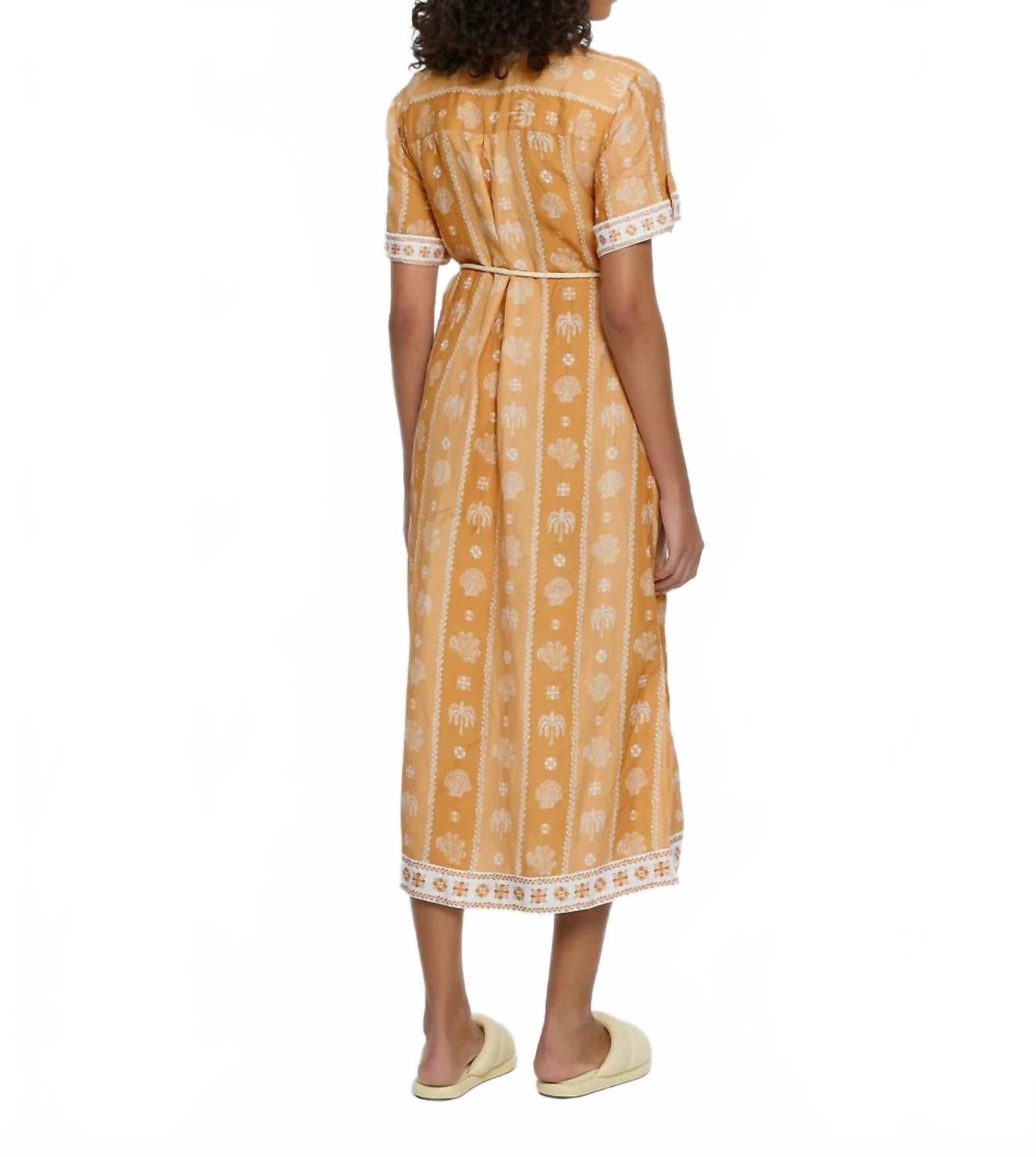 Просто добавьте шлепанцы или мюли, и все готово. Ощутите непринужденную прибрежную элегантность в платье-рубашке миди с кисточками и завязками от KIVARI. Это платье свободного силуэта с короткими рукавами и подвернутыми манжетами украшено светло-коричневой полоской в ​​тон, украшенной белыми изображениями пальм и ракушек. Платье изготовлено из смеси 55% льна и 45% вискозы, дополнено принтом с каймой на воротнике, манжетах и ​​подоле, застежкой на пуговицы и завязкой на талии с кисточками на концах. Уход: только химчистка. Идеально подходит для шикарного пляжного образа в стиле бохо или непринужденных летних приключений.