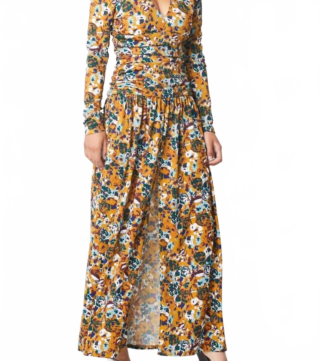 Представляем макси-платье Ciara от TANYA TAYLOR - эффектное изделие насыщенного куркумового оттенка, идеально подходящее для любого случая. Это платье с длинными рукавами, V-образным вырезом, А-силуэтом, присборенной талией и эффектным разрезом по центру спереди, подчеркивающим фигуру. Платье изготовлено из роскошного 100% полиэстера, лиф на хлопковой подкладке, застегивается на потайную молнию по центру спинки. Для сохранения элегантного внешнего вида и комфорта за этим великолепным платьем рекомендуется химчистка.