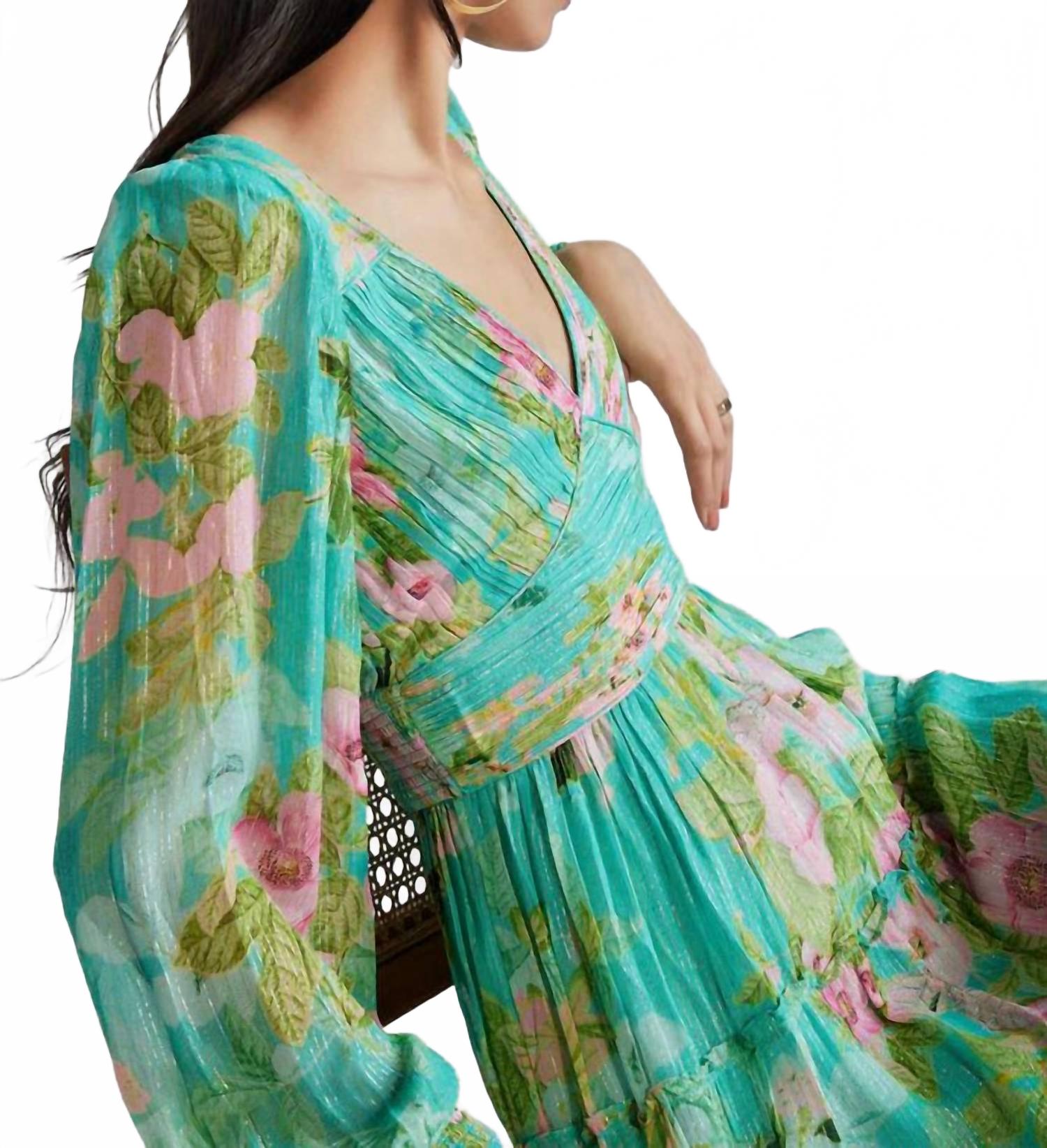 Свободное и элегантное платье, которое вы будете носить круглый год. Мини-платье Azra от Hemant & Nandita сочетает в себе пленительный стиль и игривые детали, идеально подходящие для любого случая. Это платье сшито из роскошного вискозного жоржета с золотым и серебряным люрексом, создающим мерцающий эффект, с длинными рукавами, присборенными рукавами и V-образным вырезом. Яркий бирюзовый цветочный принт и вышитый круговой подол придают ему причудливый шарм, завершающийся открытой спиной. Платье родом из Индии, застегивается на молнию для удобства. Уход включает машинную стирку и сушку на горизонтальной поверхности.
