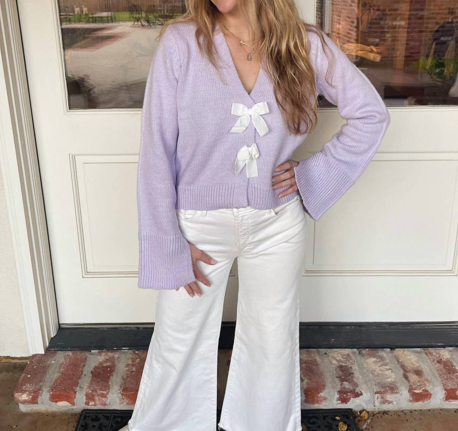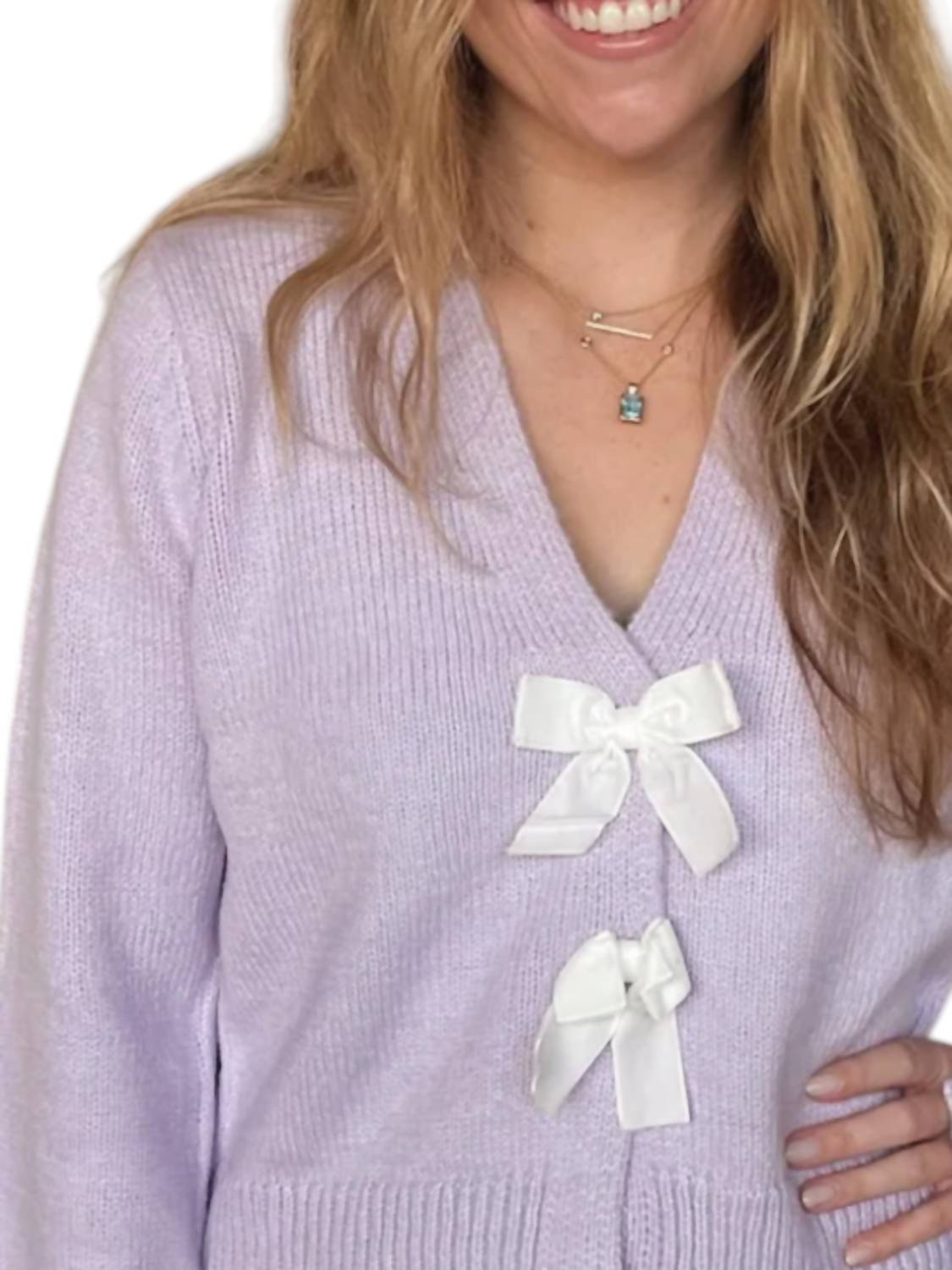 Украсьте свой осенний гардероб свитером Jasmine с V-образным вырезом и галстуком-бабочкой от DESIGN HISTORY - незаменимой вещью восхитительного сиреневого оттенка. Этот длинный свитер, изготовленный из 75% акрила и 25% полиэстера, привнесет уют и стиль благодаря игривым завязкам-бабочкам спереди. Текстурированный крой добавит нотку преппи и идеально подойдет для праздничных случаев, таких как День благодарения, а его стильный дизайн идеально подойдет для путешествий. Застежка: завязка. На модели размер xsmall.