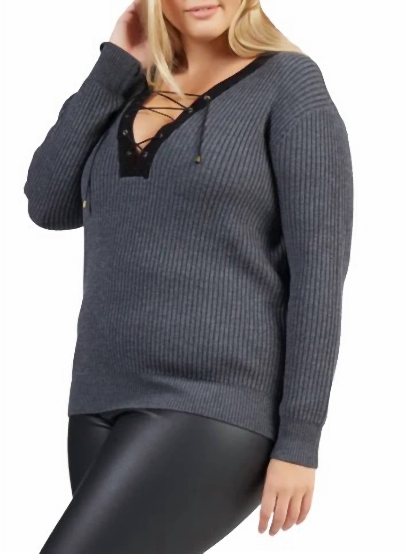 Свитер Amity Plus от Tart Collections в изысканном акульем и черном цветах предлагает современный взгляд на стиль благодаря шнуровке спереди. Этот свитер из 100% мериносовой шерсти одновременно роскошный и теплый, идеально подходит для прохладных дней. Длинные рукава, фактурный узор, удобная застежка-липучка и V-образный вырез обеспечивают легкую, но стильную посадку. Рекомендации по уходу: химчистка для поддержания идеального состояния. На модели размер 1X (рост 175 см, обхват груди 111 см, обхват талии 90 см, обхват бедер 122 см).