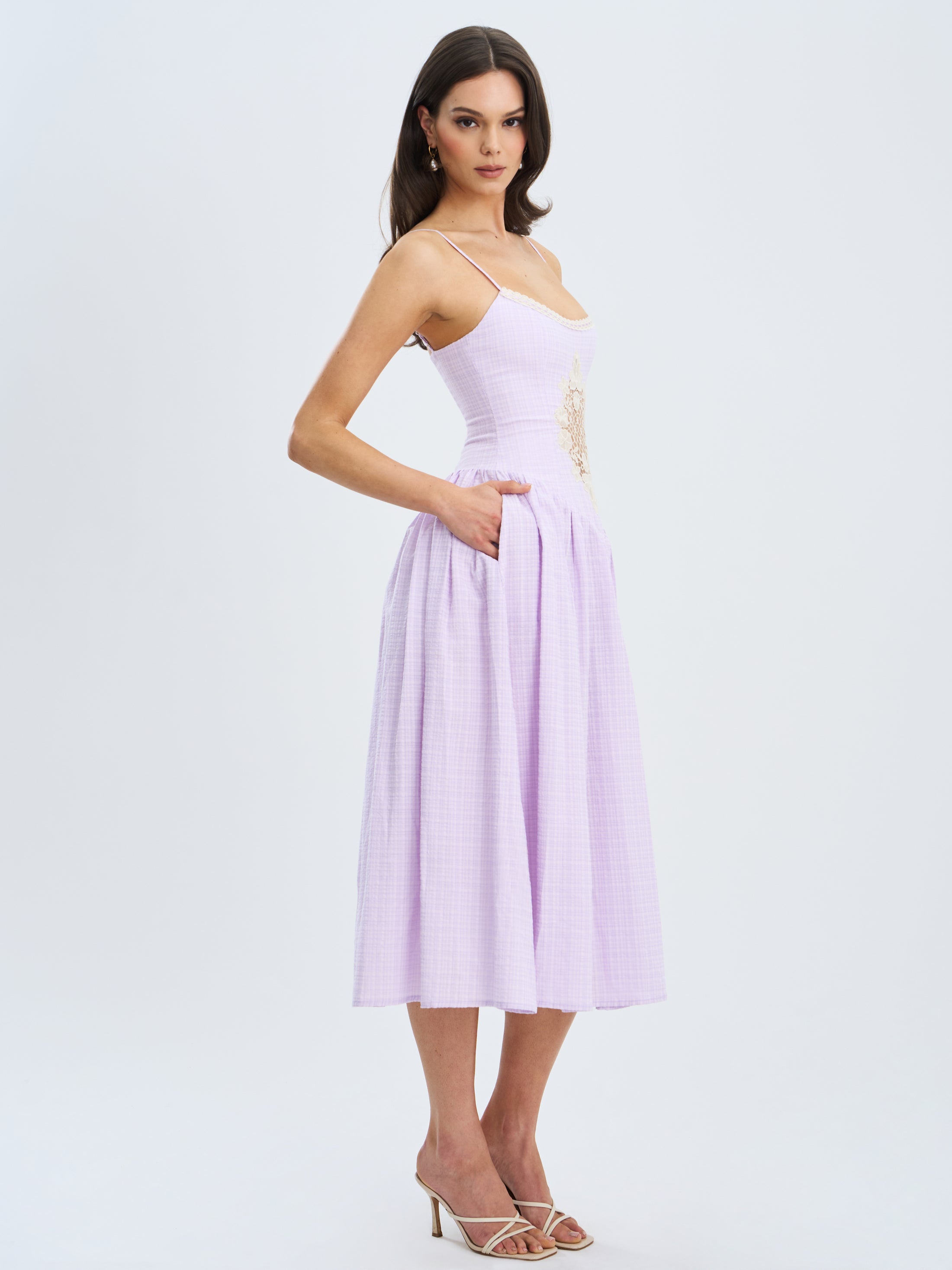Нежное и романтичное платье Jaclyn нежно-лавандового цвета выполнено из дышащей хлопковой ткани сирсакер, идеально подходящей для весенних и летних нарядов. Платье украшено изысканным кружевным вырезом спереди и кружевной отделкой в ​​тон. Заниженная талия и V-образный вырез подчеркивают силуэт. Встроенный корсет обеспечивает структуру, а внутренняя поддержка из тюля добавляет юбке объема. Регулируемые бретели обеспечивают индивидуальную посадку, а практичные детали, такие как потайная молния и потайные карманы, делают его удобным в носке. Идеально подходит для пикников, садовых вечеринок или неформальных свадеб.