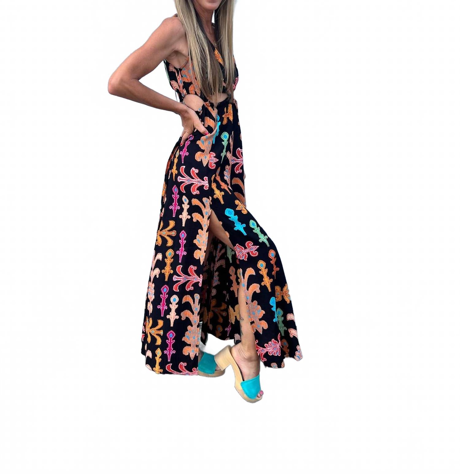 Повседневное, удобное и милое! Платье, которое вы будете носить весь сезон. Представляем макси-платье Wanderlust от Z&L Europe - очаровательное черное платье, украшенное яркими разноцветными вышитыми узорами. Это макси-платье без рукавов с эффектными вырезами на талии и спине, регулируемым завязкой сзади и эластичным поясом для дополнительного комфорта. Платье изготовлено из 100% дышащего хлопка, имеет глубокий V-образный вырез и струящуюся юбку А-силуэта с боковыми разрезами. Уход: ручная стирка в холодной воде, сушка на вертеле. Рост Лалы - 175 см, размер 0, размер S, размер соответствует заявленному.