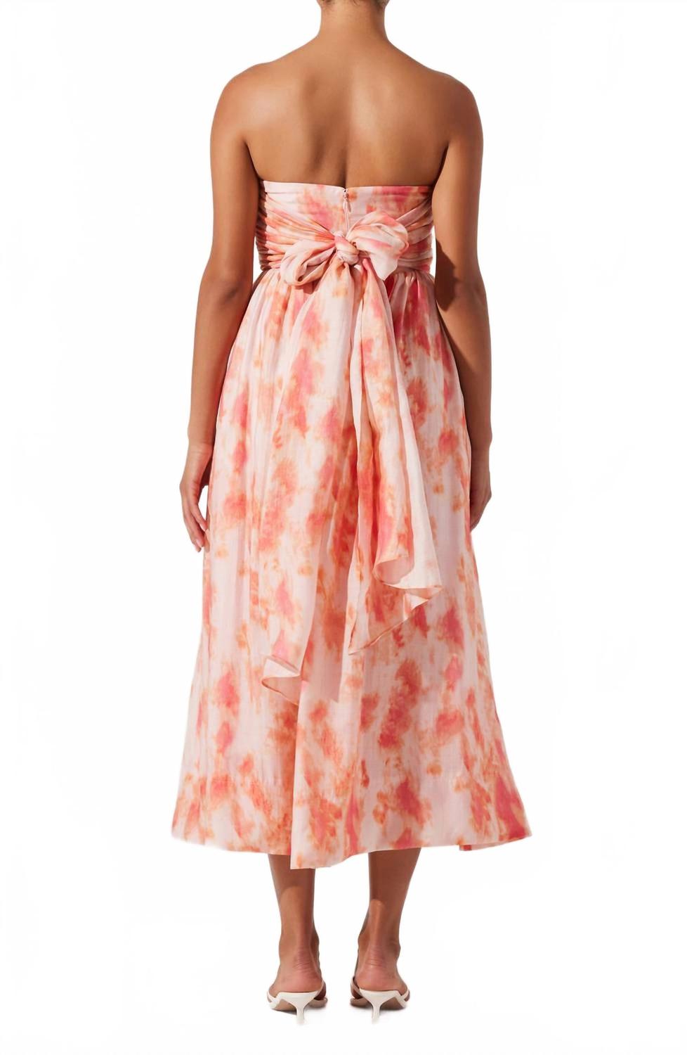 Просто добавьте шлепанцы или мюли, и все готово. Представляем платье-миди Aneesha от ASTR, которое идеально подойдет для создания уверенного и элегантного образа на свадьбах или торжественных мероприятиях. Это платье без бретелек, выполненное из 75% лиоцелла и 25% полиэстера, украшено потрясающим коралловым узором тай-дай и прекрасно сочетается с А-силуэтом в стиле бохо-шик. Лиф структурированного кроя с открытыми плечами и регулируемыми бретелями для идеальной посадки. Застежка: молния. Уход: только химчистка. Это платье идеально подходит для весенних мероприятий и станет воплощением безупречной грации.