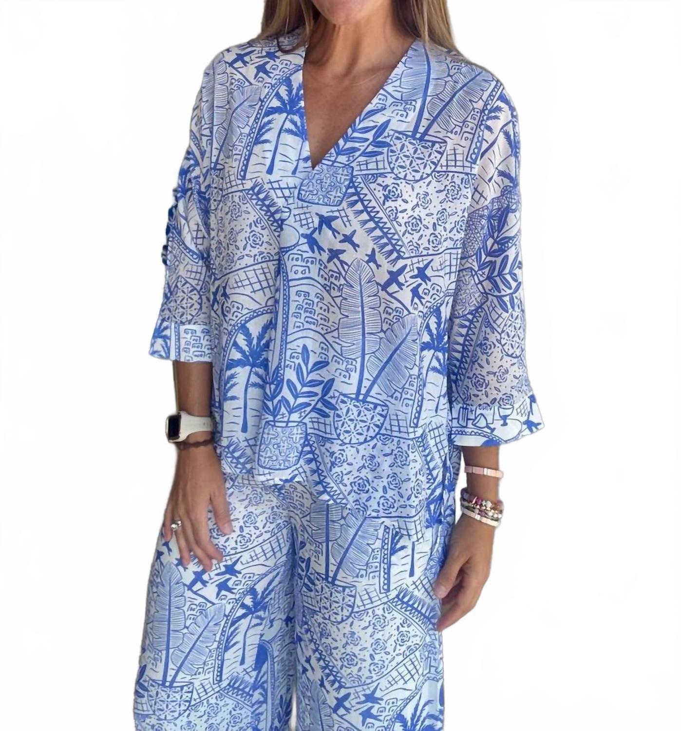 Сочетайте ее с любимыми джинсами и шлепанцами для следующей девичьей вечеринки. Представляем топ Sicilian Summer от Sincerely Ours - шикарное дополнение к вашему гардеробу для солнечных дней благодаря свободному крою и ярким рукавам три четверти. Украшенный игривым сине-белым узором, он воплощает непринужденный стиль бохо-шик и комфорт. Эта женская блузка с V-образным вырезом и простой застежкой на липучке идеально подходит для отпуска или празднования Дня благодарения. Созданная для летнего сезона, эта модель станет незаменимой вещью для тех, кто предпочитает активный и в то же время комфортный образ.