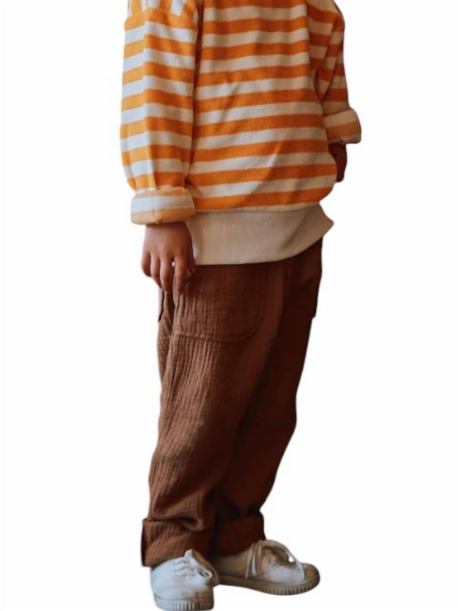 Представляем хлопковые брюки Emile & Ida Boys' Cotton Gauze Pants восхитительного оттенка печенья, идеально подходящие для минималистичного осеннего гардероба. Эти текстурированные брюки фасона «саруэль» из 100% хлопка созданы для максимального комфорта благодаря застежке на пуговицы и регулируемому поясу на резинке с завязкой из хлопкового твила в тон. Два накладных кармана спереди и один накладной карман на пуговице сзади обеспечивают практичность. Уход за этими универсальными брюками, идеально подходящими для отпуска, простирайте их в стиральной машине и сушите на горизонтальной поверхности.
