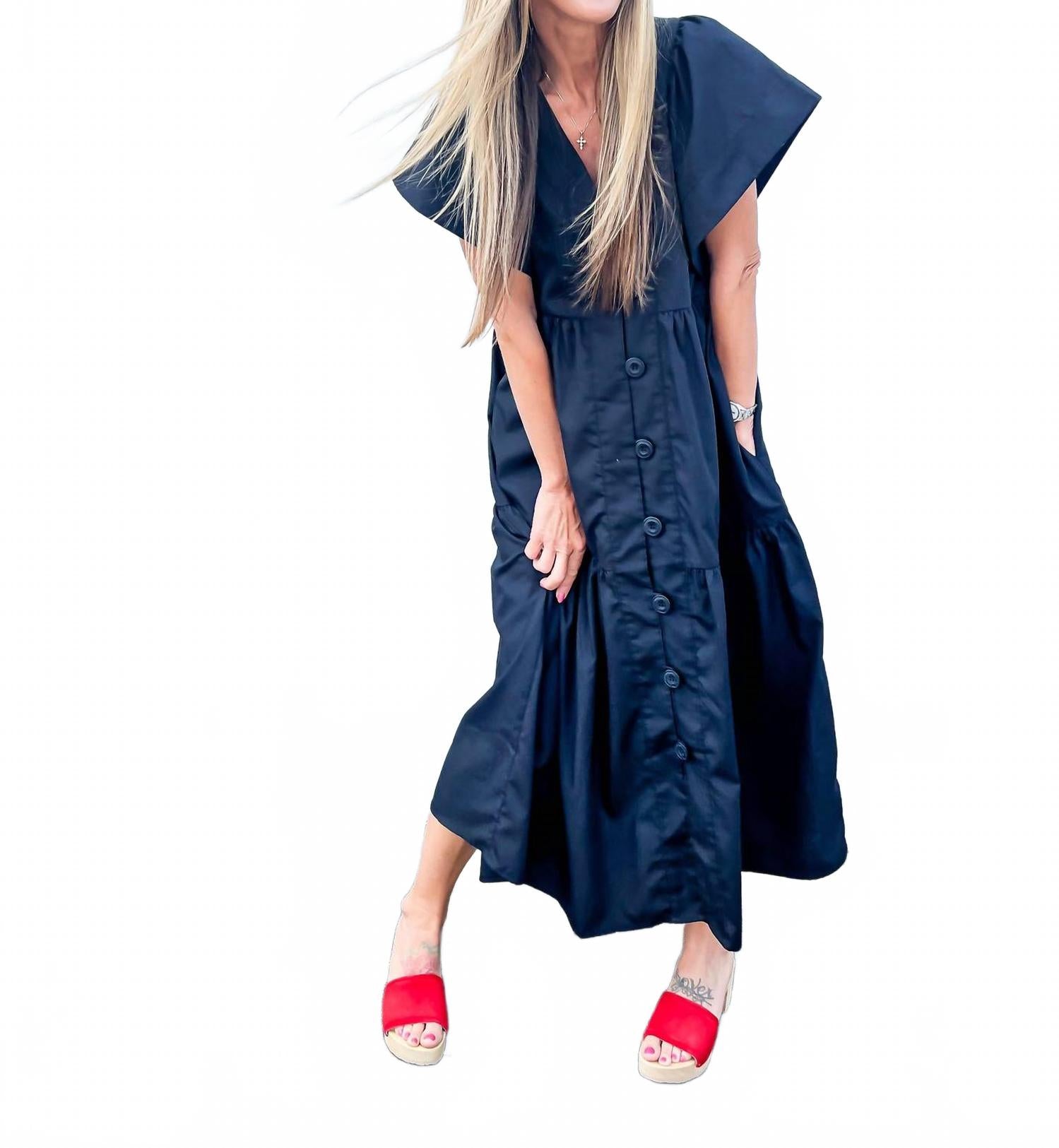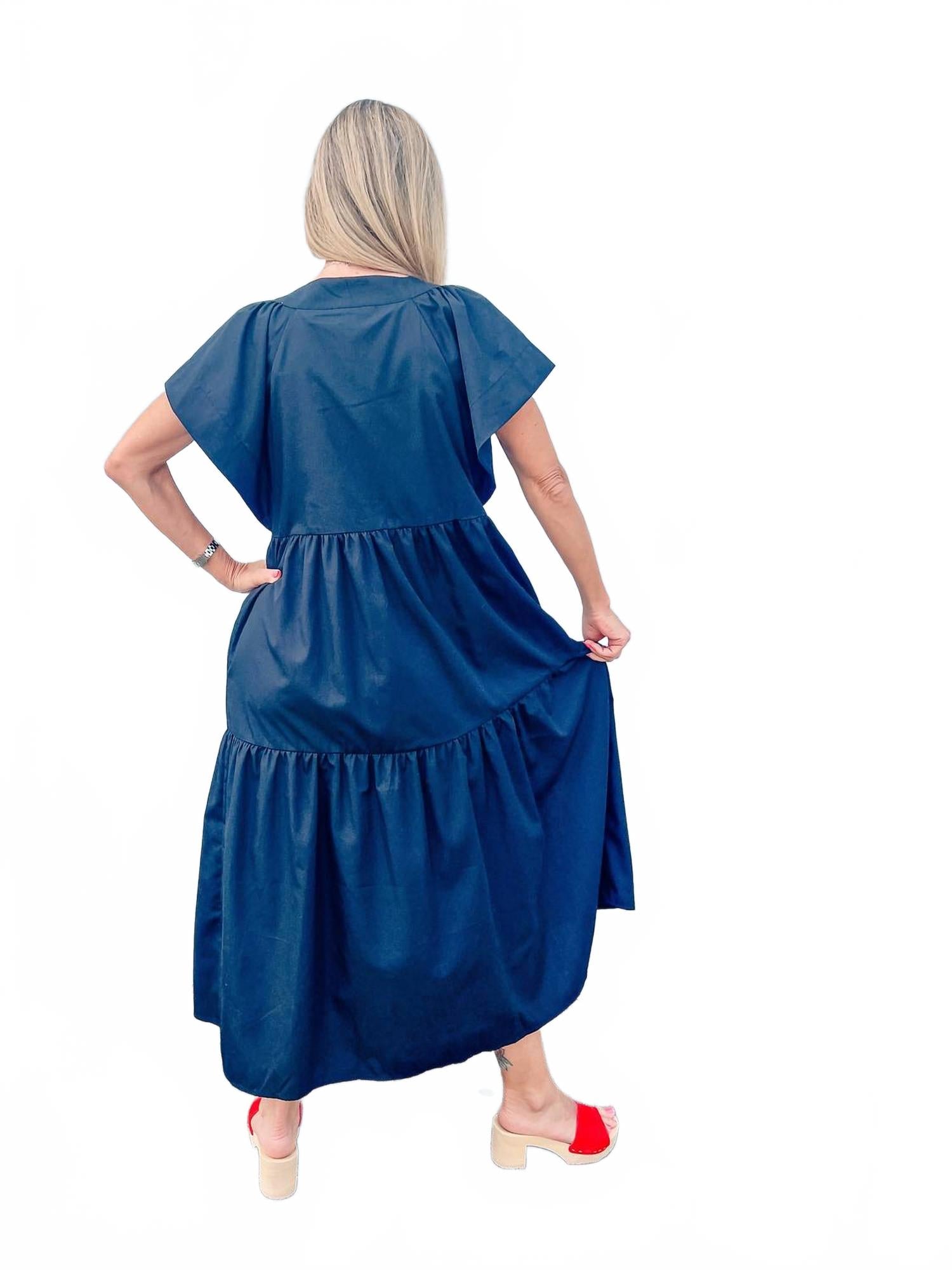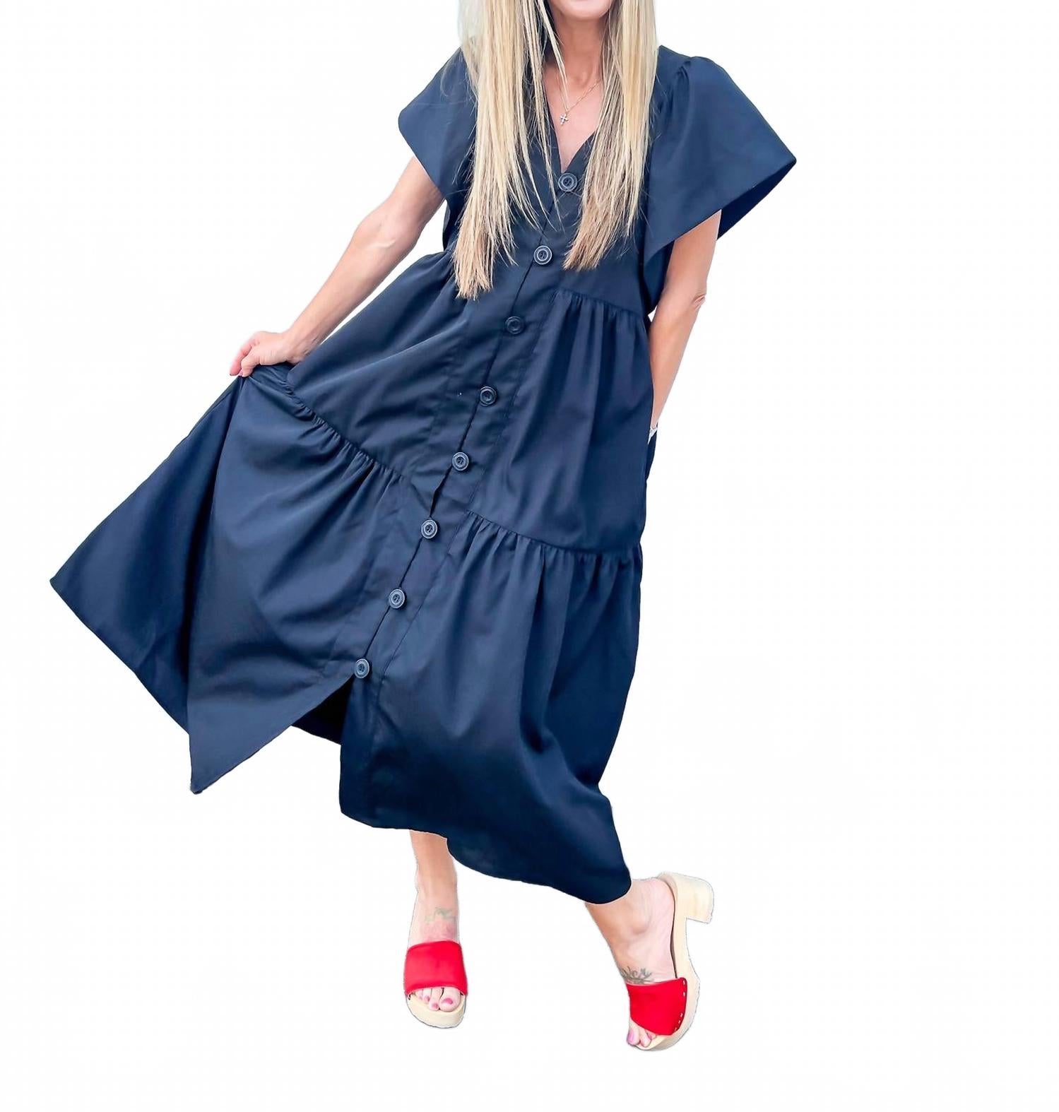 Платье миди настолько универсально, что ваши варианты его ношения безграничны. Представляем многоярусное платье миди Twirl-Worthy Flutter Sleeve Tiered от Entro в классическом черном цвете. Это платье с короткими рукавами-крылышками, сшитое из 80% полиэстера и 20% хлопка, создает легкое и воздушное ощущение. Многоярусная длина миди и А-образный силуэт с V-образным вырезом обеспечивают удобную посадку, идеально подходящую для различных случаев благодаря застежке на пуговицы и практичным карманам. Уход прост: машинная стирка и сушка в стиральной машине делают платье таким же удобным, как и стильным.