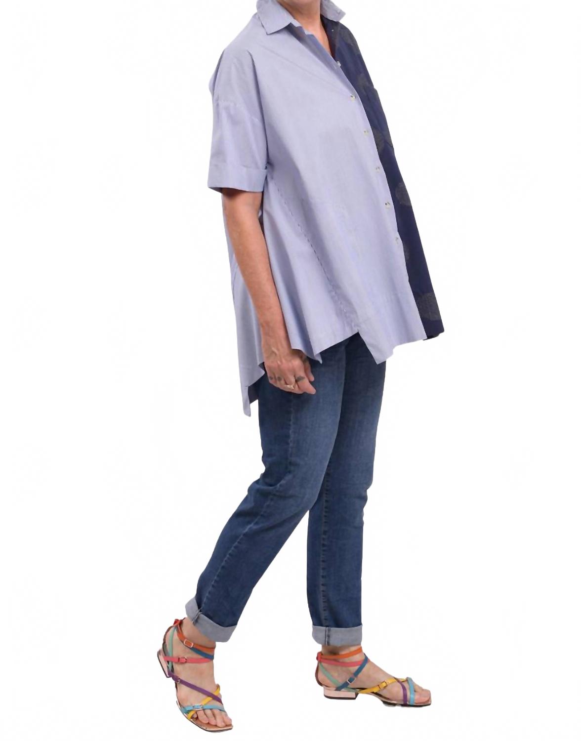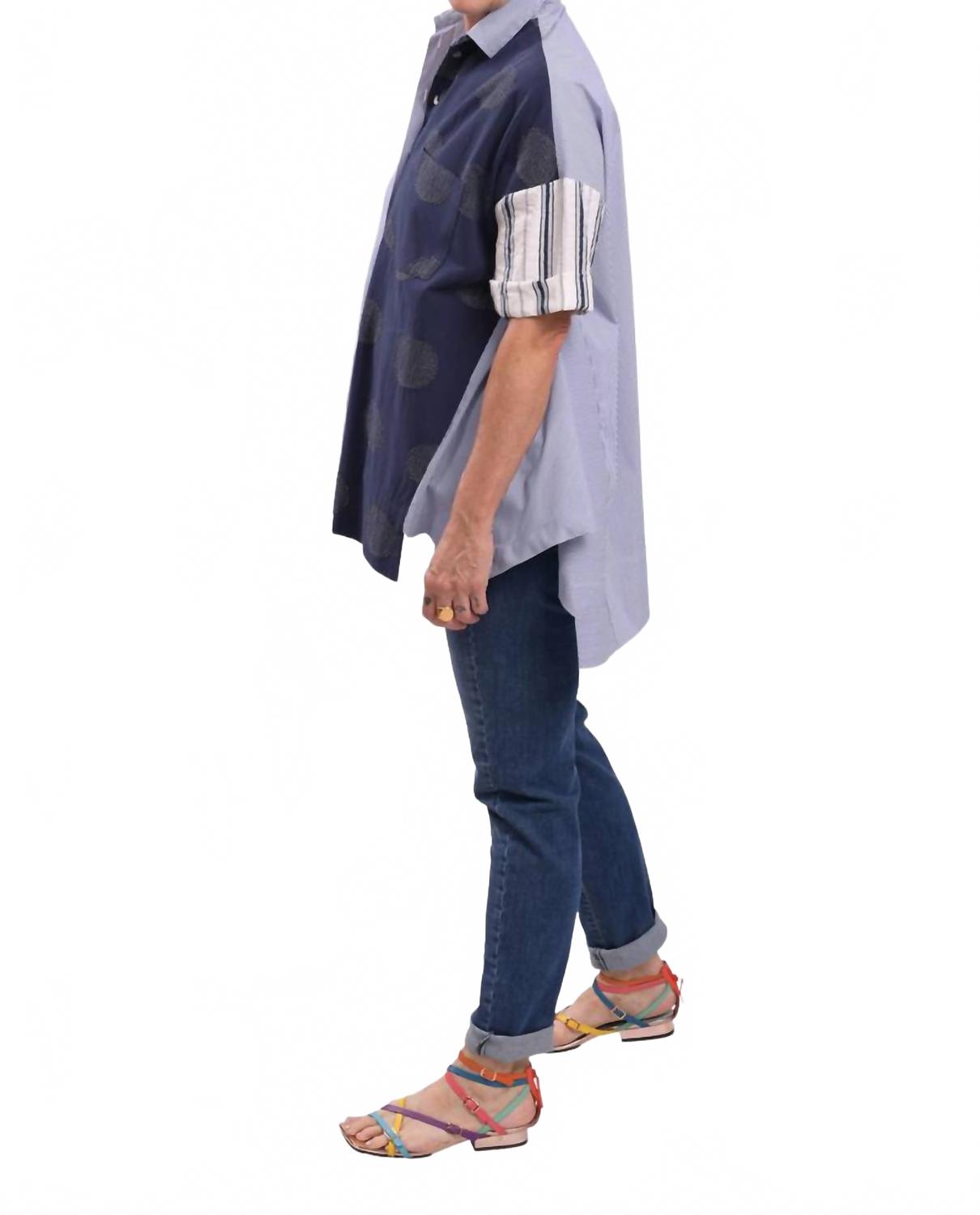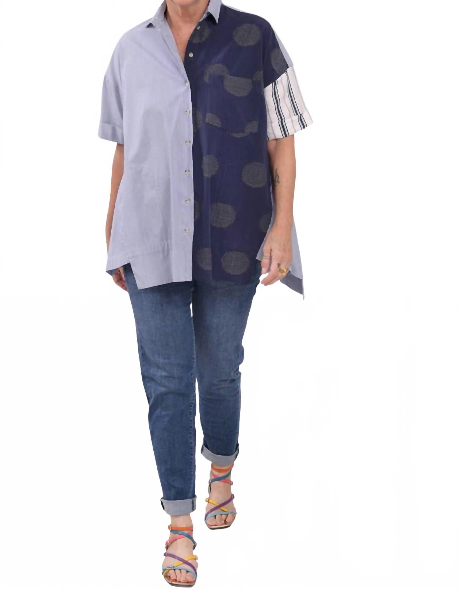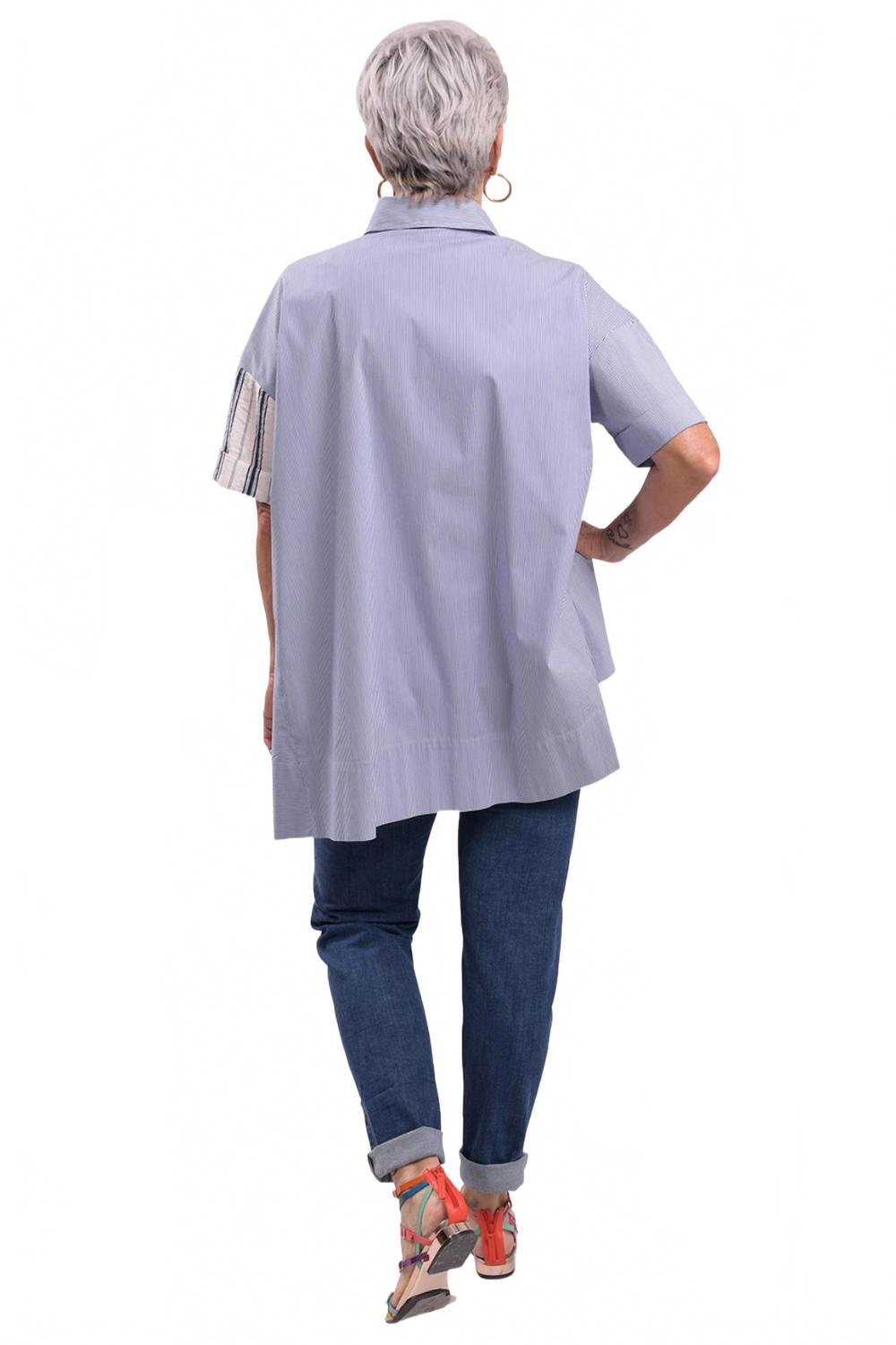 Классическая рубашка на пуговицах, которая никогда не выйдет из моды. Встречайте рубашку-трапецию Tao от ALEMBIKA - идеальное сочетание полосок и вышитых линейных горошин, которые украсят ваш рабочий гардероб. Эта темно-синяя рубашка на пуговицах имеет короткие рукава и А-силуэт с асимметричным подолом для свободы движений. Состав: 78% хлопок, 15% вискоза, 15% нейлон и 2% эластан. Модель разработана и изготовлена ​​в Израиле. Застежка: пуговицы. Уход: машинная стирка, сушка на веревке. Благодаря отложному воротнику и нагрудному карману эта рубашка станет стильным выбором для современной женщины.