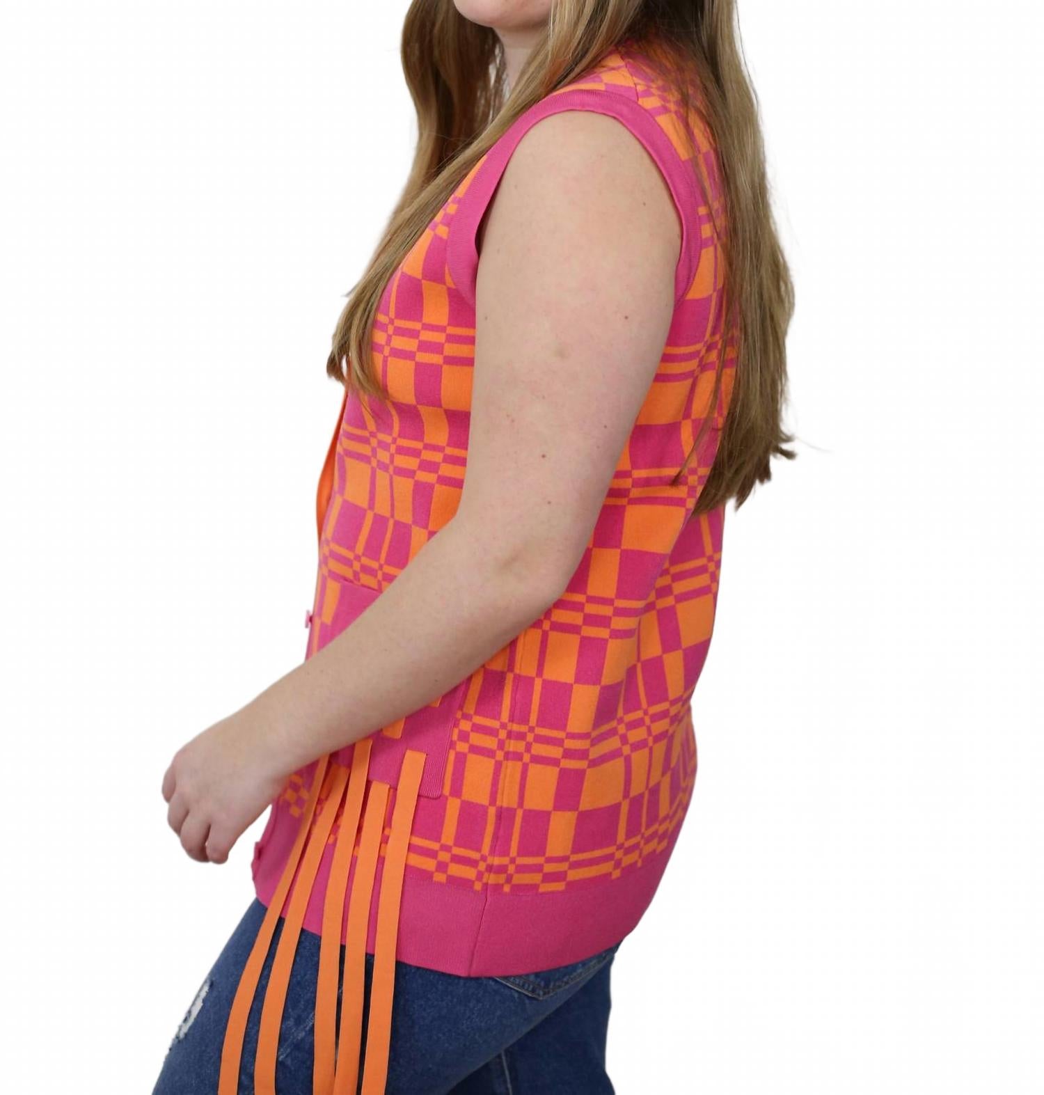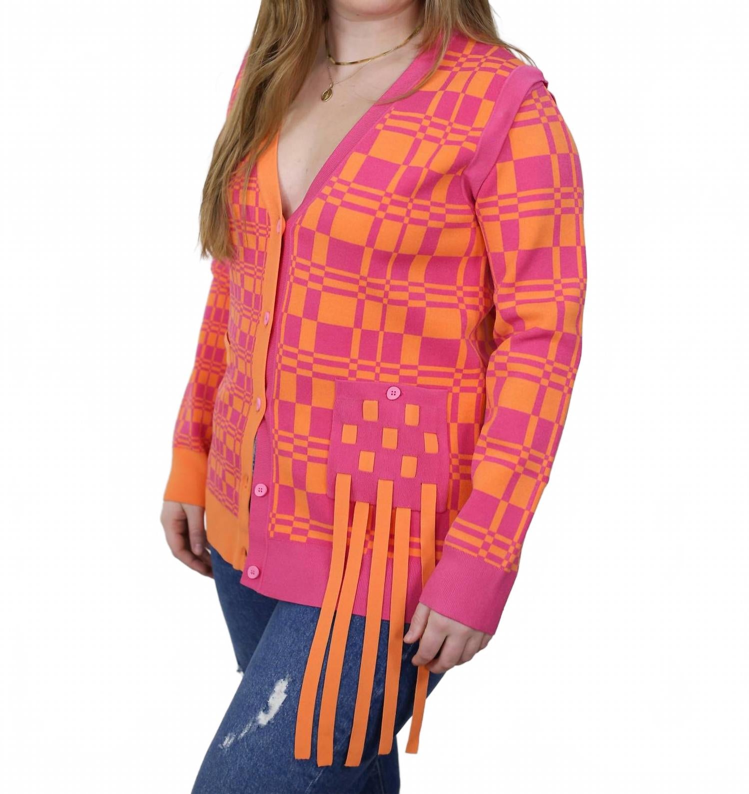 Откройте для себя универсальный кардиган Noel Eco Plaid от PH5 - идеальное дополнение к вашему гардеробу благодаря модному розово-оранжевому клетчатому принту. Эта уникальная модель с длинными рукавами легко снимается, превращая кардиган в стильный жилет для разнообразных вариантов ношения. Благодаря V-образному вырезу и функциональным передним карманам с бахромой, кардиган практичен и выглядит в стиле бохо-шик. Застежка: пуговицы. Инструкции по уходу: нет в наличии. Идеально подходит для весенних каникул и торжественных случаев.