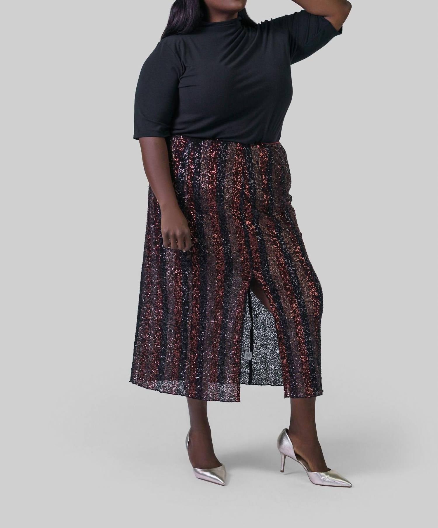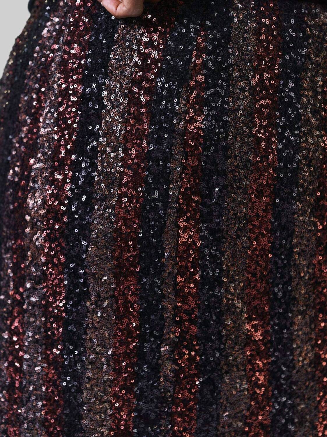 Представляем юбку миди Daliyas от -bl^nk-, эффектное изделие для современной женщины. Эта юбка с высокой талией, облегающая фигуру, длиной 3/4 и очаровательным полосатым узором подчеркивает изгибы фигуры разноцветными шоколадными пайетками. Изготовленная из 100% роскошной вискозы, она воплощает в себе суть моды 90-х и идеально подходит для перехода от рабочего дня к вечернему мероприятию. Идеально подходит для осенних мероприятий. Стирать вручную и сушить на горизонтальной поверхности.