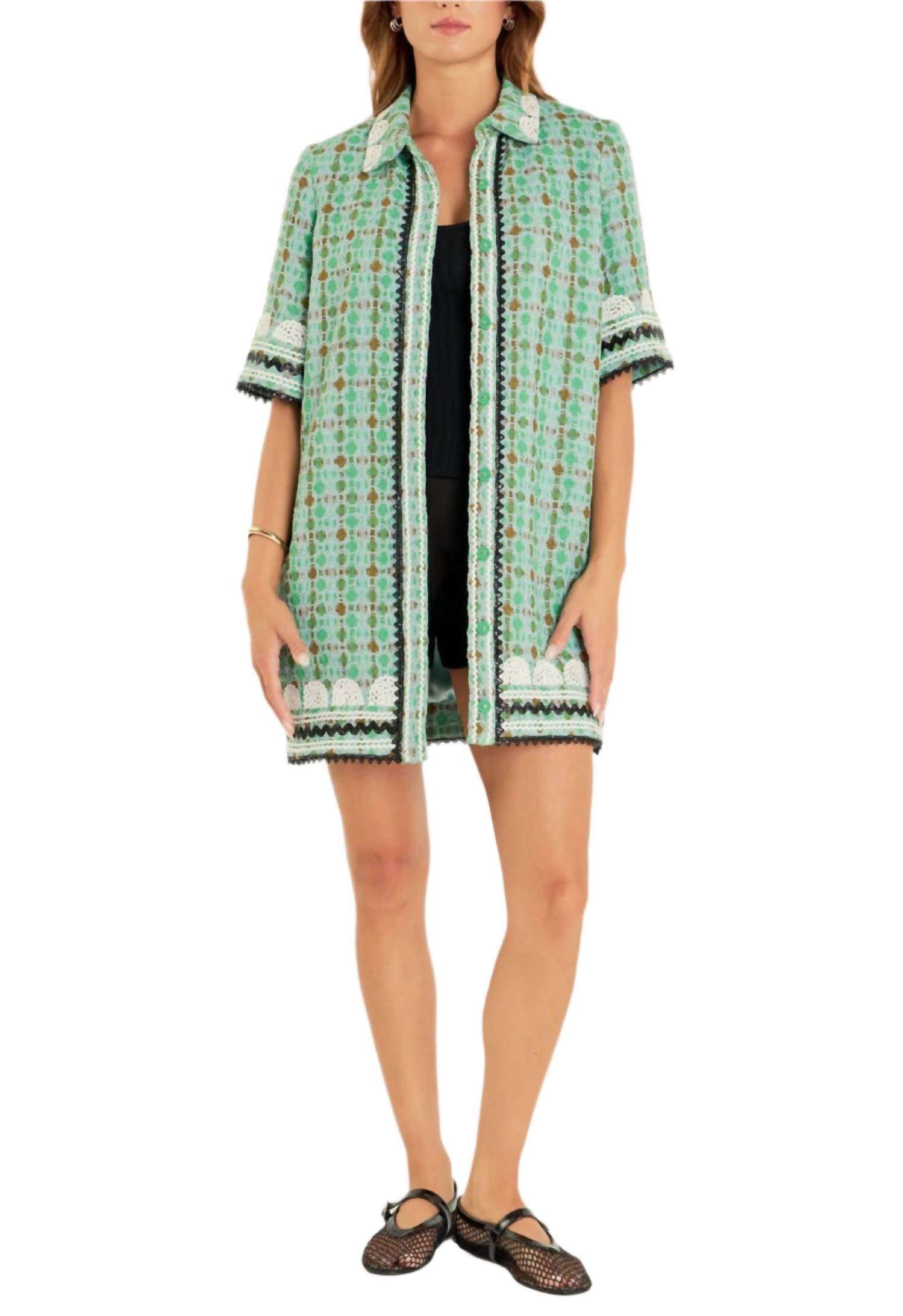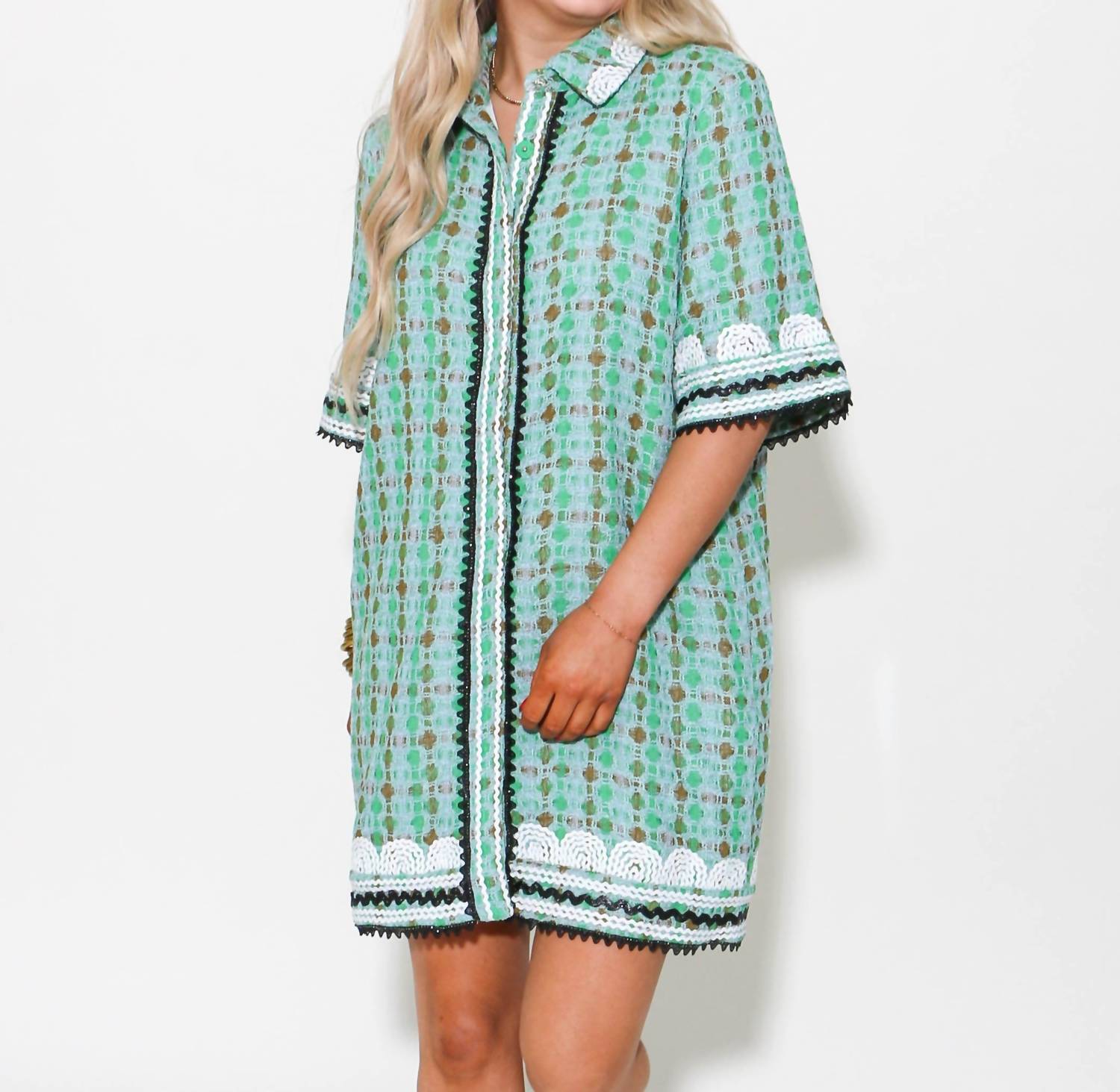 Свободное и элегантное платье, которое вы будете носить круглый год. Представляем мини-платье-рубашку English Factory с отделкой Ricrac - яркое воплощение изысканной элегантности в зеленом цвете Multi. Это платье-рубашка с короткими рукавами выполнено из эффектной ткани букле с эффектным узором, дополненным стильной отделкой Ricrac на груди. Застежка на пуговицы обеспечивает идеальную посадку, а длина мини идеально подходит для эффектного званого ужина или летнего мероприятия. Уход: ручная стирка в холодной воде, не отбеливать, не сушить в стиральной машине, гладить при низкой температуре.