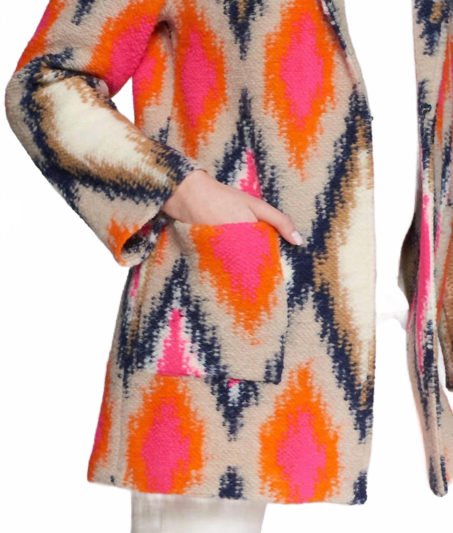 Милая, повседневная и удобная. Эта куртка просто необходима. Дополните свой дорожный гардероб курткой Dora от Vilagallo с ярким принтом икат в розовых, оранжевых и темно-синих тонах. Эта куртка с длинными рукавами, надеваемая без застежки, выполнена из шерстяной смеси (76% натуральной шерсти и 24% полиэстера), обеспечивая тепло и стиль. Эта модель без подкладки с удобными боковыми карманами, изготовленная в Испании, - мечта любого максималиста. Эта женская повседневная куртка идеально подходит для осени и дополнена V-образным вырезом, подчеркивающим фигуру. Рост модели: 176 см, размер: 36.